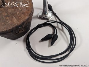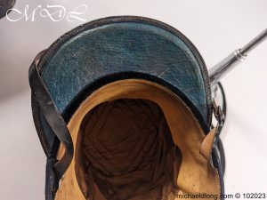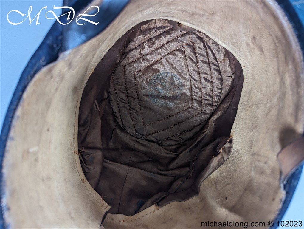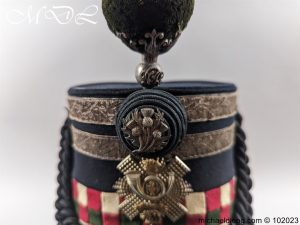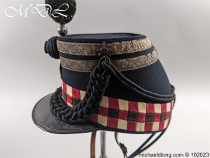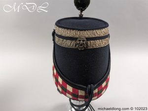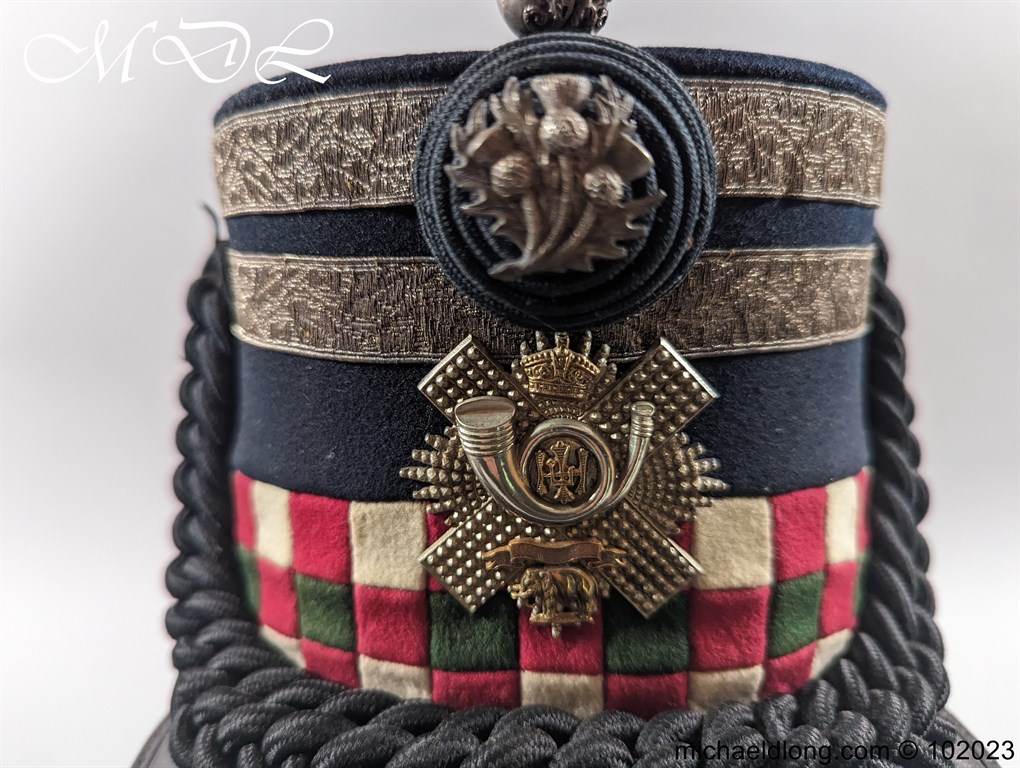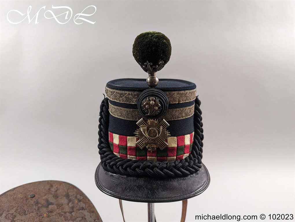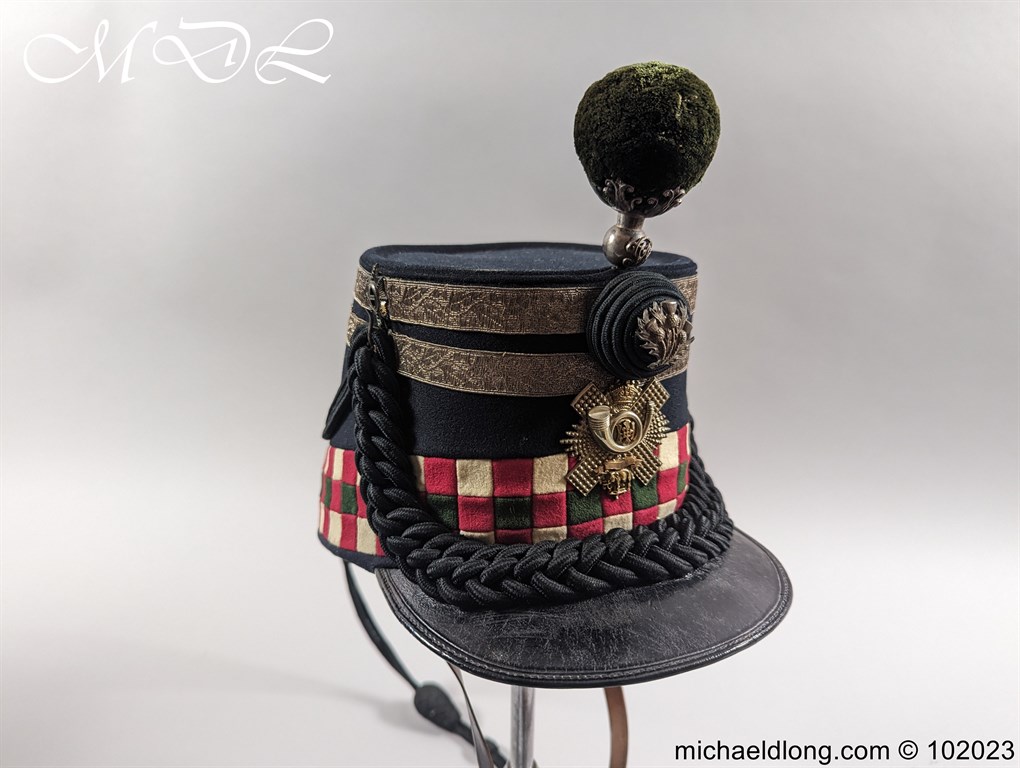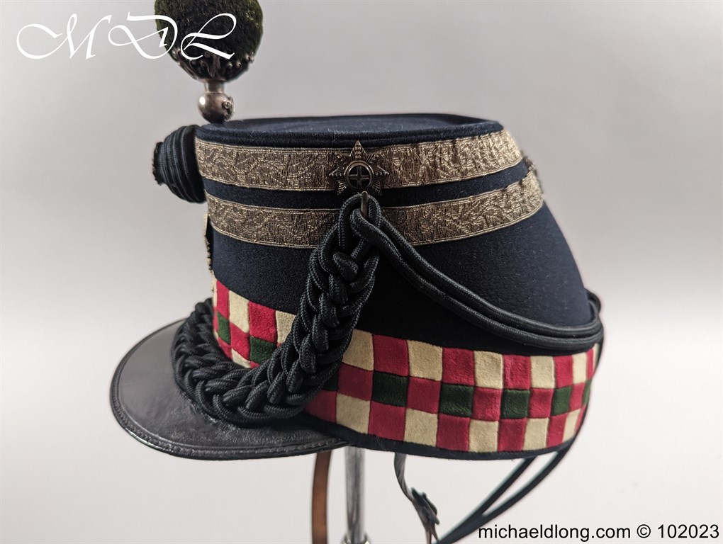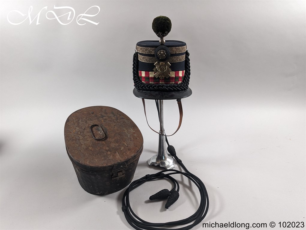 Highland Light Infantry Field Officer’s Shako named to Colonel Clark. A super quality example with dark blue body with diced band red-white-red and red-green-red plus two lines of silver lace to the top edge. To the front, a Kings crown regimental shako badge and black silk rosette mounted with a silver thistle device complete with plaited cap lines and black patent leather peak and chin strap. Complete with green pompom mounted on silver mounting with G R The interior is with leather sweatband and silk liner which is maker marked Herbert and Co London plus named label to rear, complete with storage tin