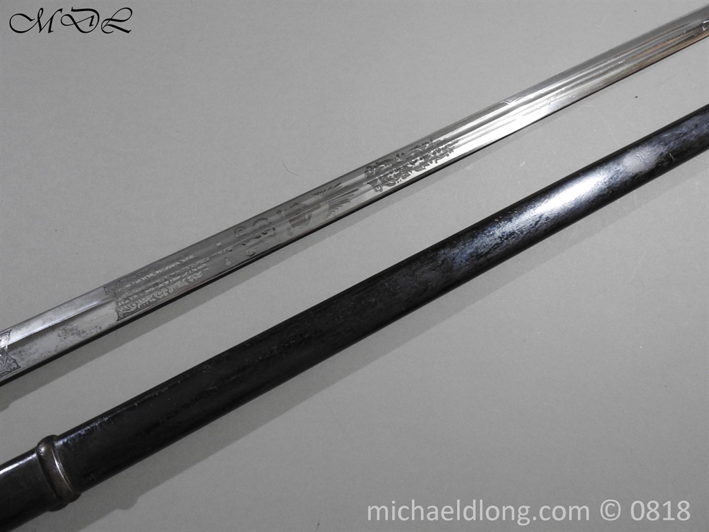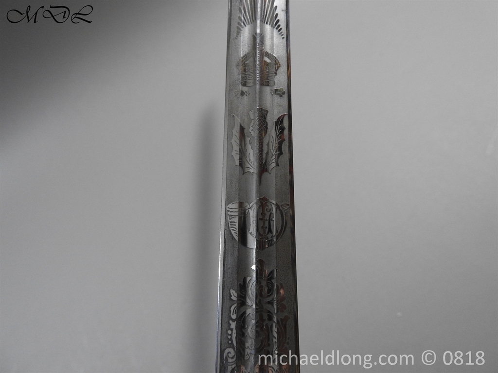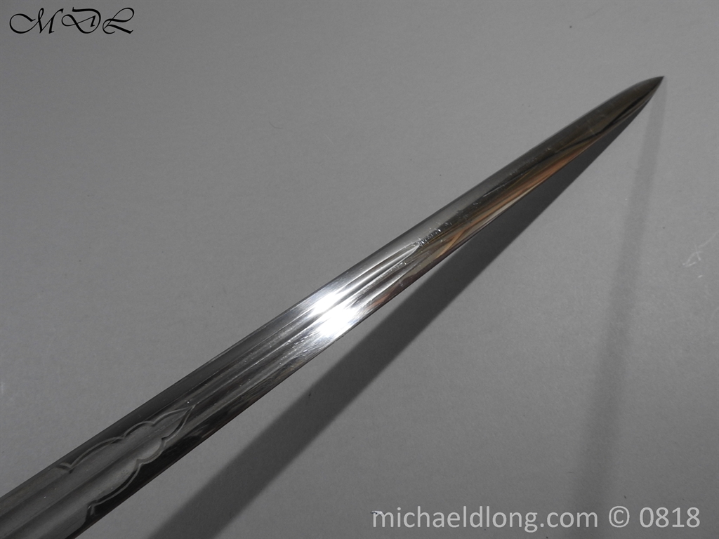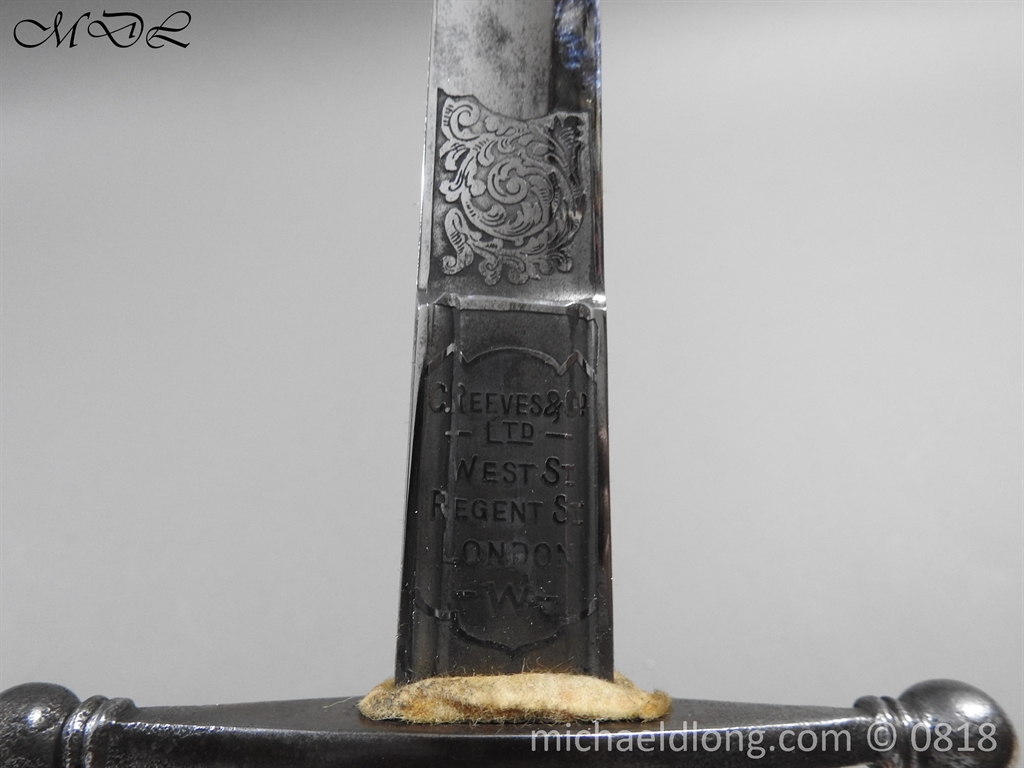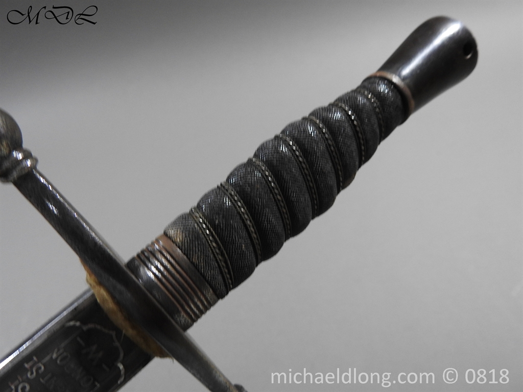 WW1 period George 5th officer’s undress sword with correct regimental pommel plus cross guard and complete with silver wire bound fish skin grip. The blade double edged blade with GR crown and regimental badge to reverse and marked C Reeves and Co Regent Street London complete with steel scabbard. Length 101cm blade 84cm