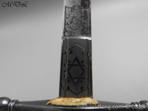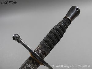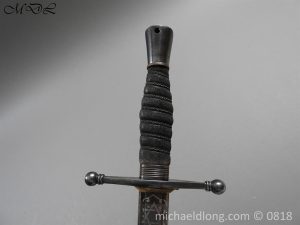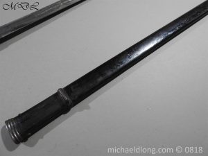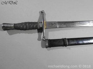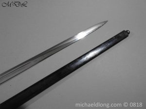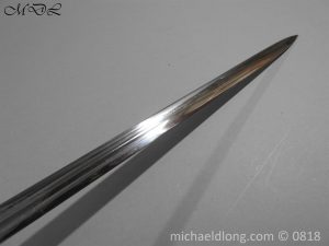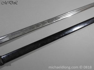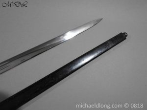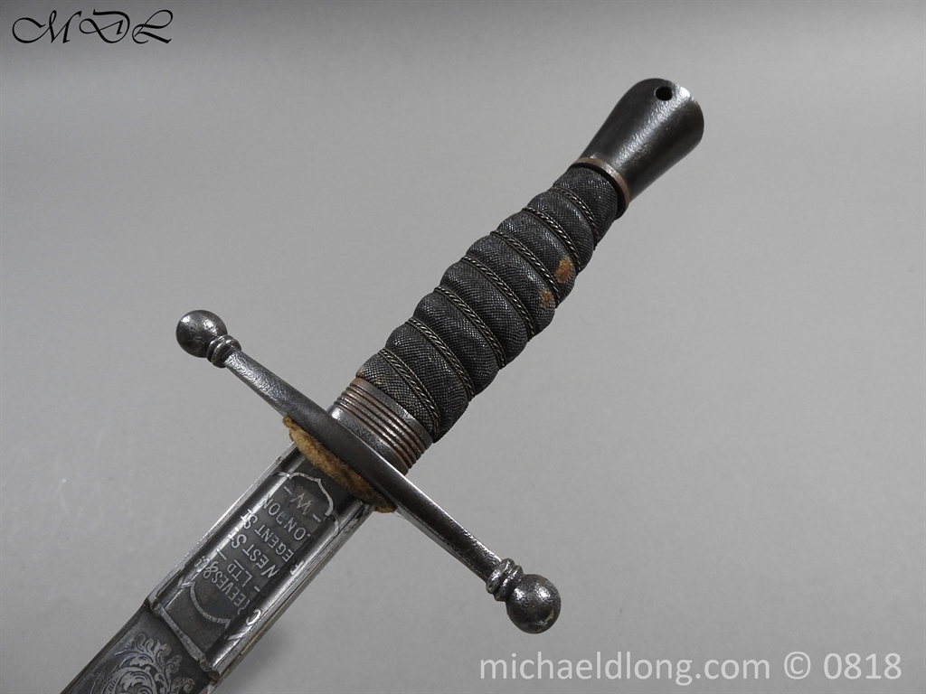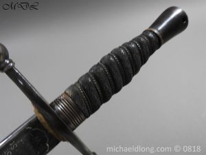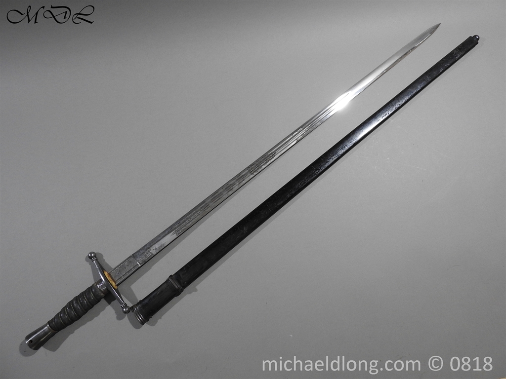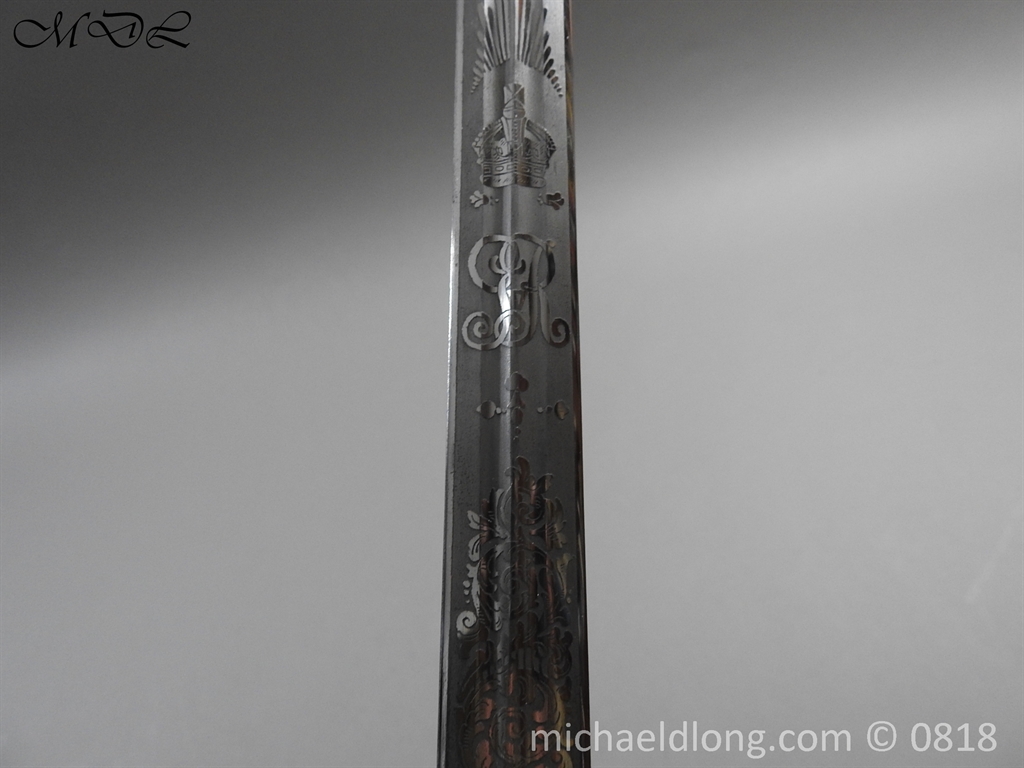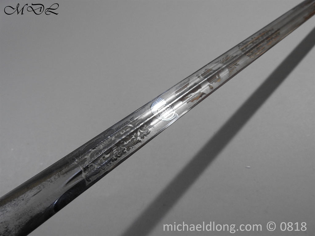 WW1 period George 5th officer’s undress sword with correct regimental pommel plus cross guard and complete with silver wire bound fish skin grip. The blade double edged blade with GR crown and regimental badge to reverse and marked C Reeves and Co Regent Street London complete with steel scabbard. Length 101cm blade 84cm