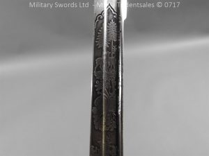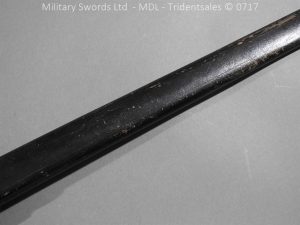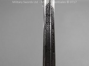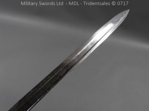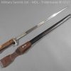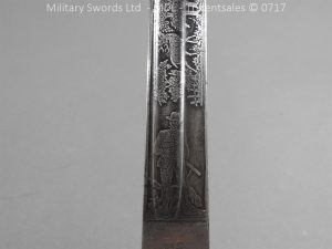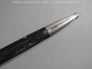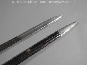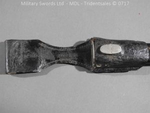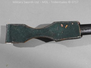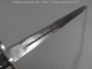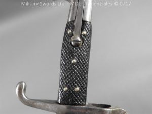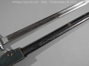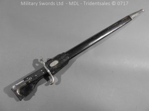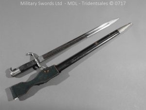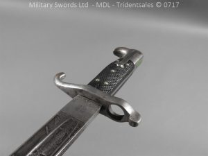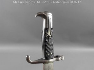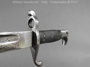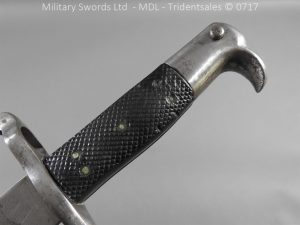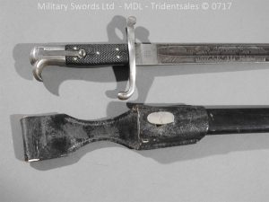 Birds head style steel hilt with a T slot, a round steel push button with an external leaf spring held by a screw, two piece chequered leather grips with an oil hole held by steel pins, S shape steel crossguard with upturned quillion and muzzle ring, rear of the guard unmarked. Single edge pipeback steel blade with square shaped fullers the ricasso marked with the King & Knights heads WK&C, etched and plated with foilage deer and a hunter. Steel mounted black leather scabbard, All metal parts heavily nickel plated. German leather frog and green Jaeger knot. Shown in: The Bayonet Book by Watts & White page 171 No 376