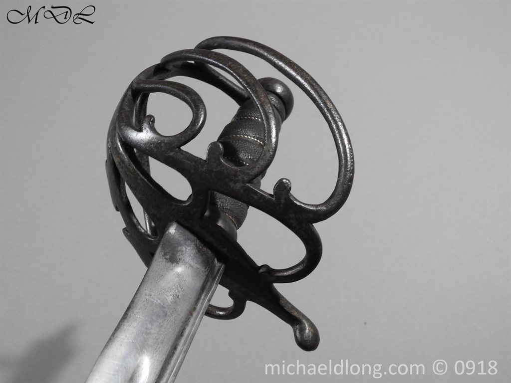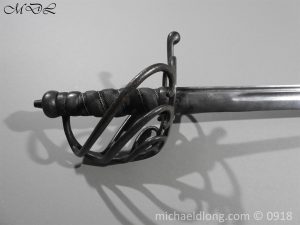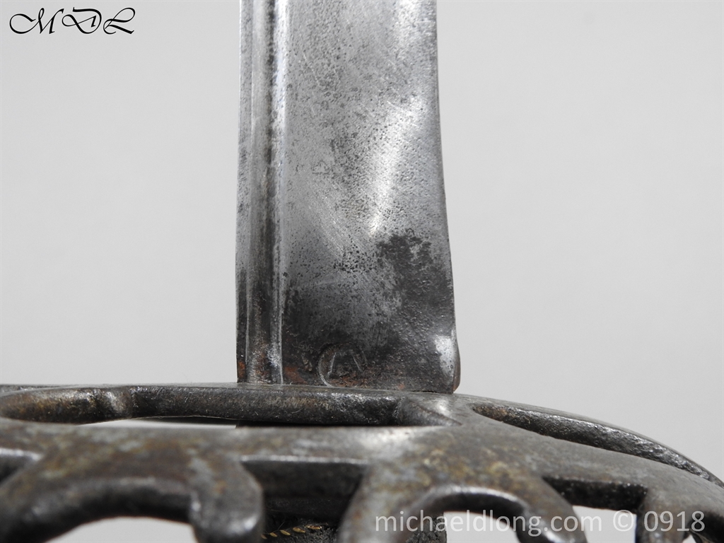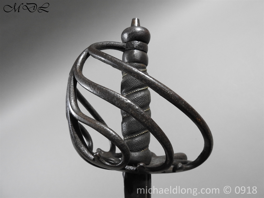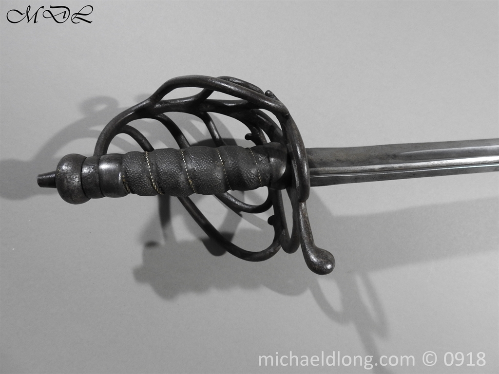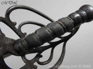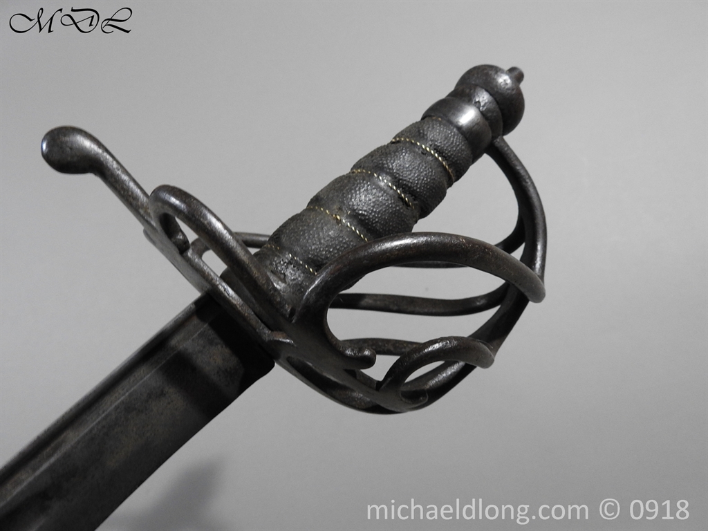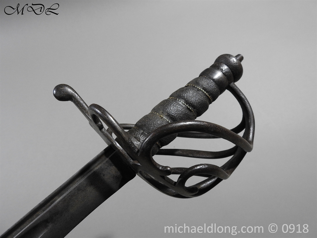 Horse Grenadier Guards Troopers Sword c 1780 the guard is wrought iron bars which form a basket design, round pommel with extended tang button. The grip is fish skin bound with twisted brass wire, straight blade with small top fuller and a further larger one running to the tip. The blade single edged becoming double toward the spear point with makers mark near the hilt M or W within a circle overall length 112 cm blade 94 cm. Please Swords of the British Army by Brian Robson revised edition page 109 for reference.