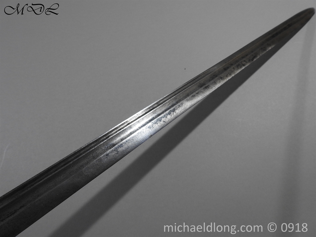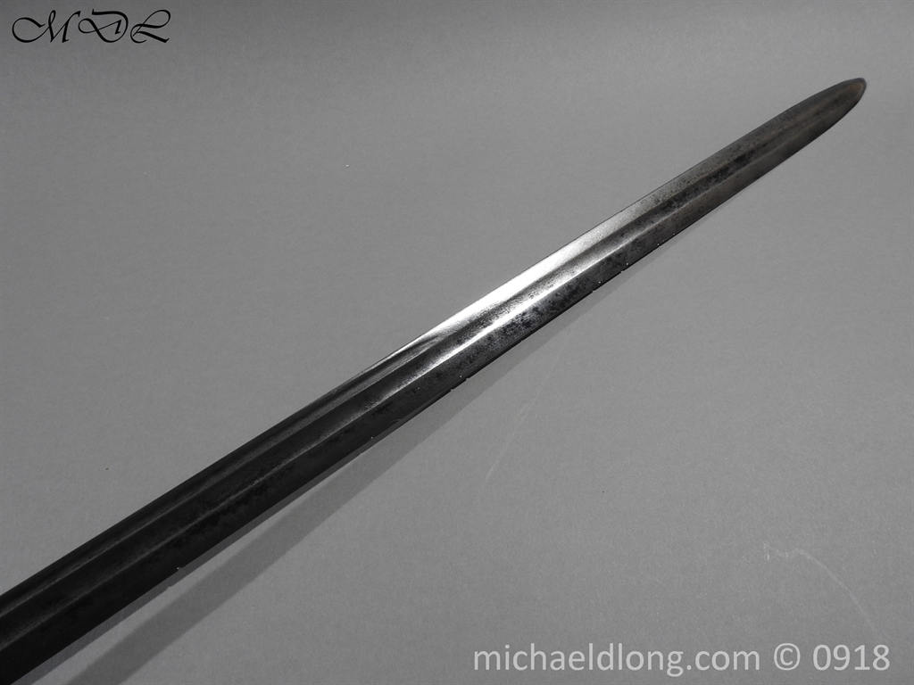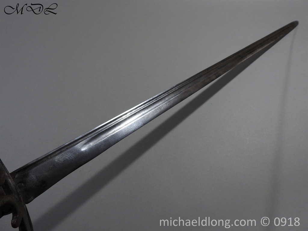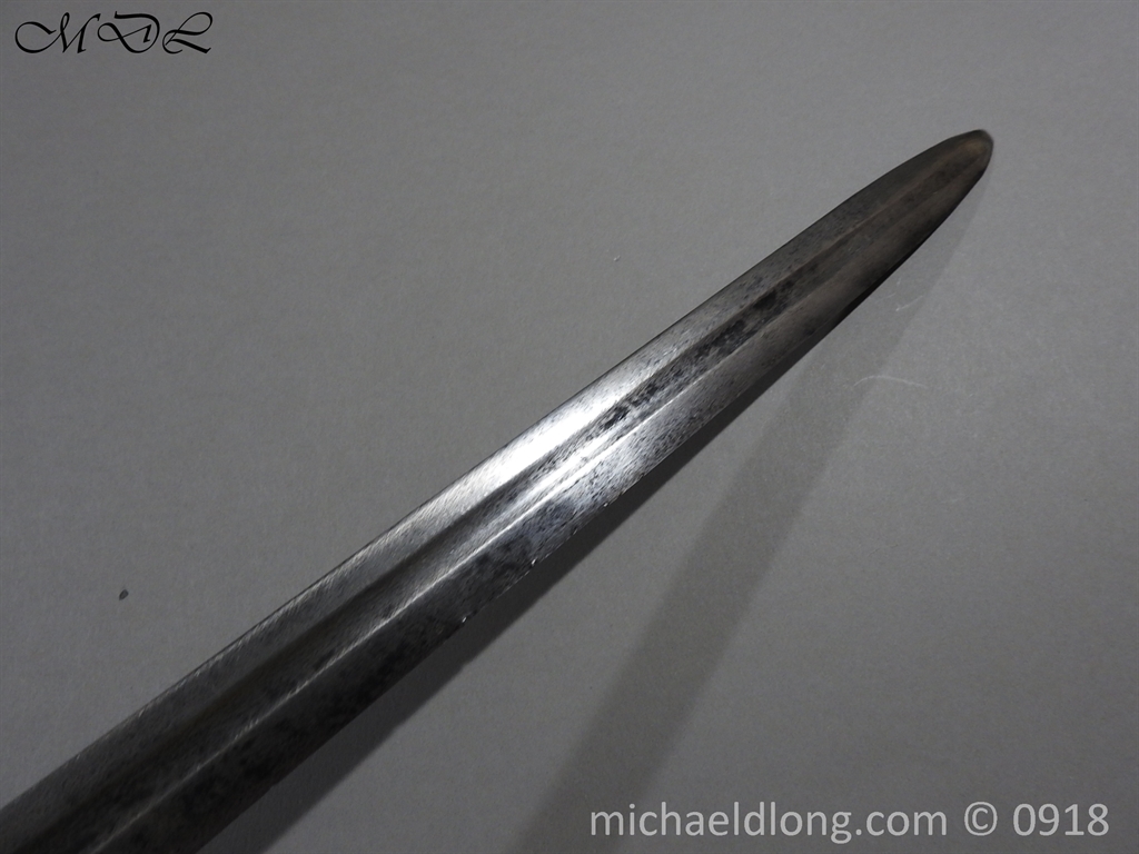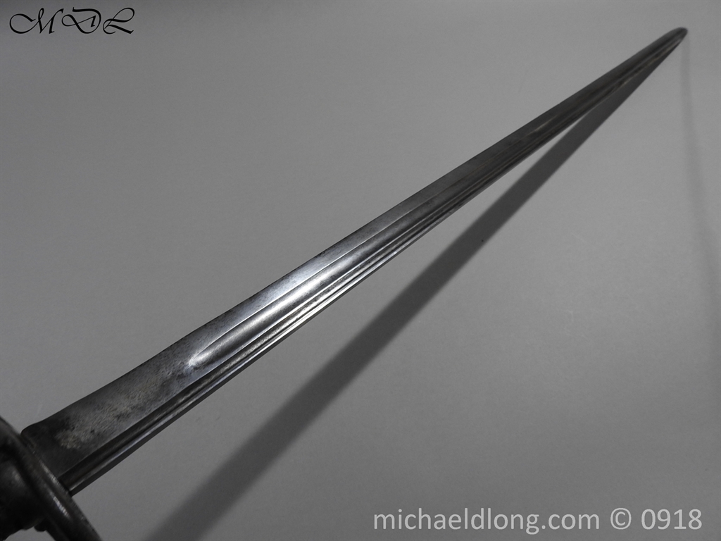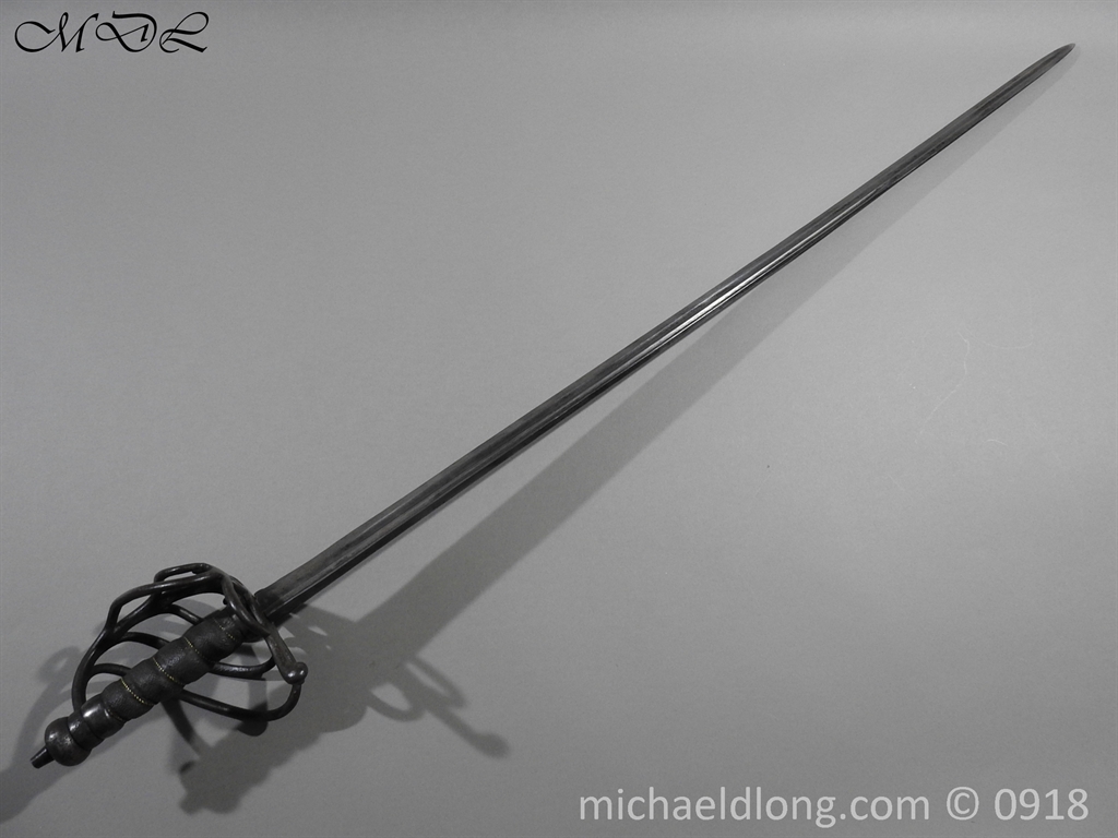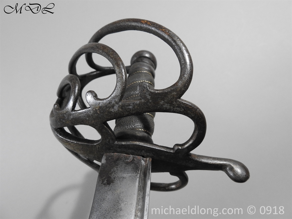 Horse Grenadier Guards Troopers Sword c 1780 the guard is wrought iron bars which form a basket design, round pommel with extended tang button. The grip is fish skin bound with twisted brass wire, straight blade with small top fuller and a further larger one running to the tip. The blade single edged becoming double toward the spear point with makers mark near the hilt M or W within a circle overall length 112 cm blade 94 cm. Please Swords of the British Army by Brian Robson revised edition page 109 for reference.