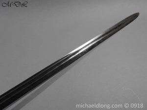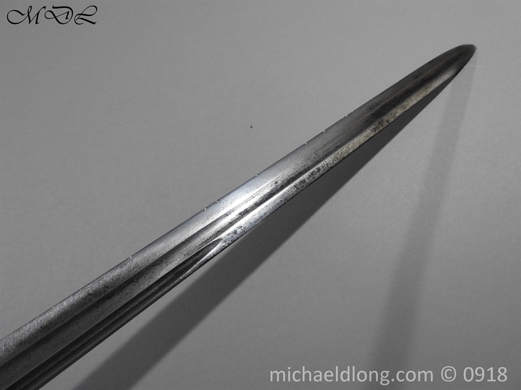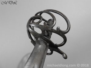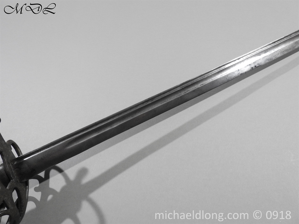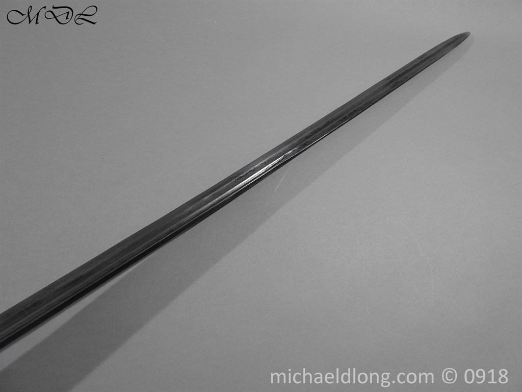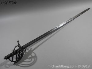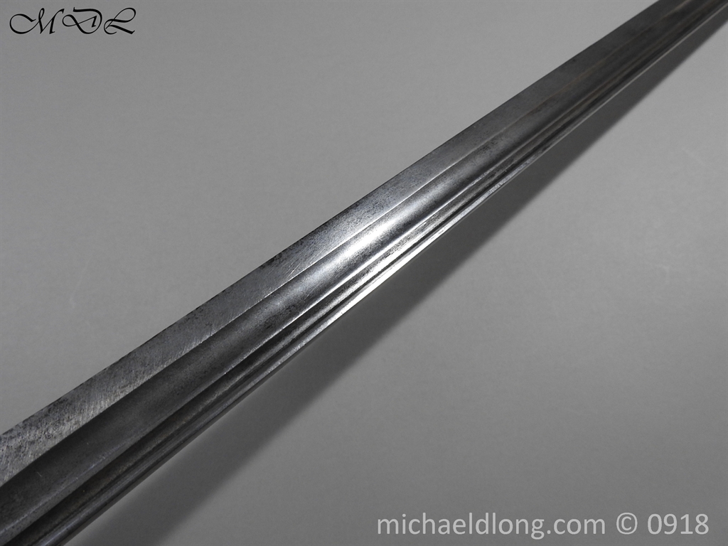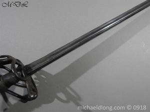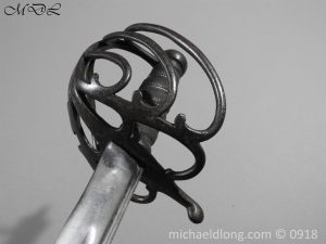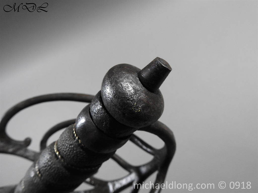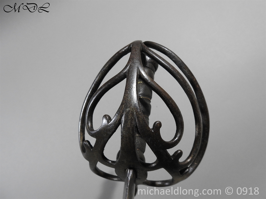 Horse Grenadier Guards Troopers Sword c 1780 the guard is wrought iron bars which form a basket design, round pommel with extended tang button. The grip is fish skin bound with twisted brass wire, straight blade with small top fuller and a further larger one running to the tip. The blade single edged becoming double toward the spear point with makers mark near the hilt M or W within a circle overall length 112 cm blade 94 cm. Please Swords of the British Army by Brian Robson revised edition page 109 for reference.