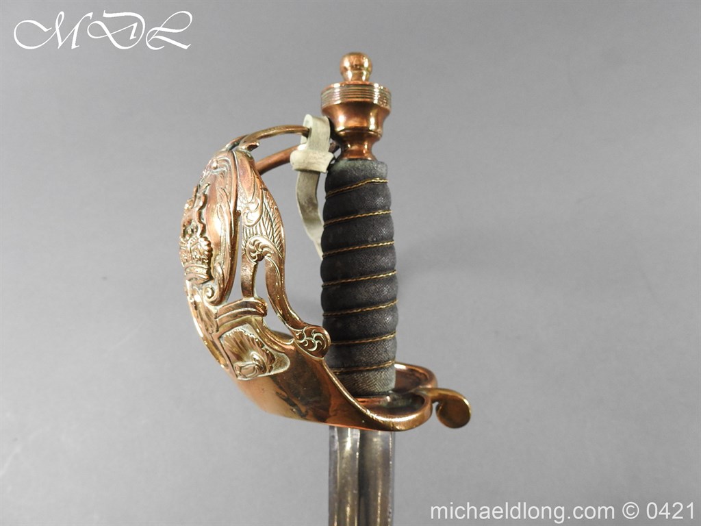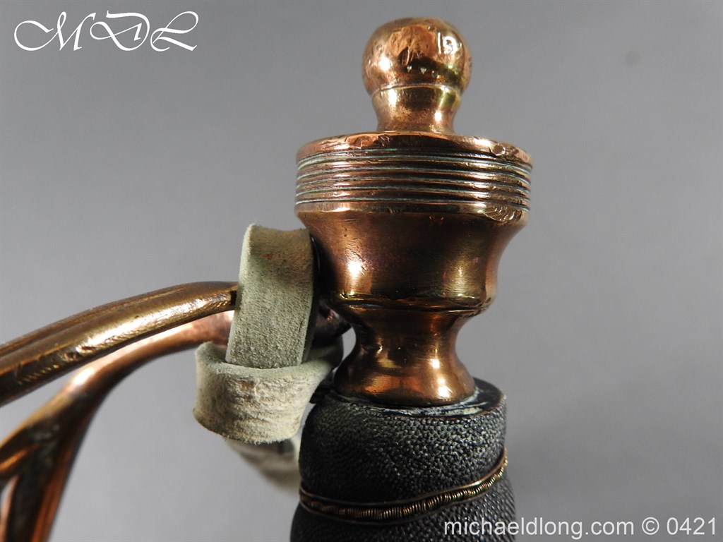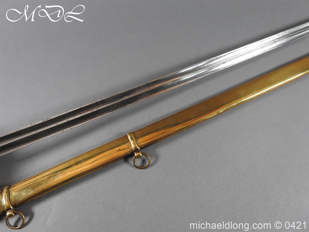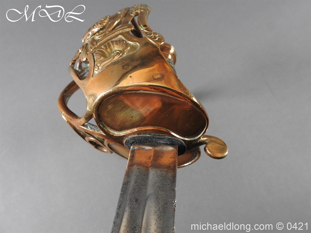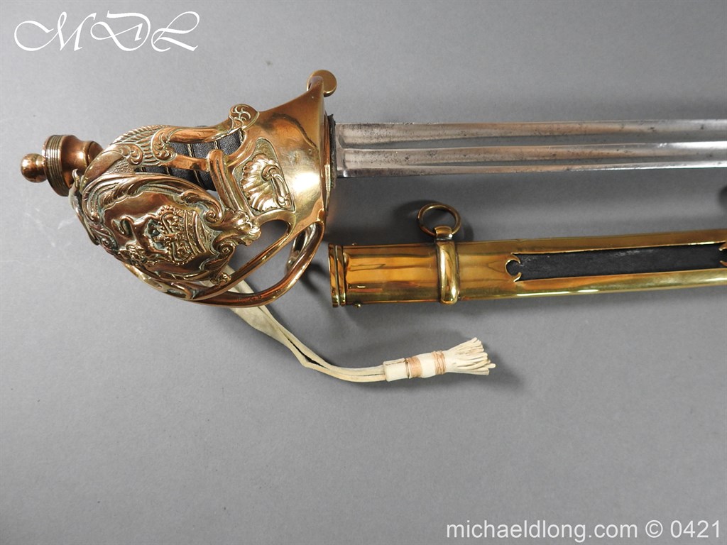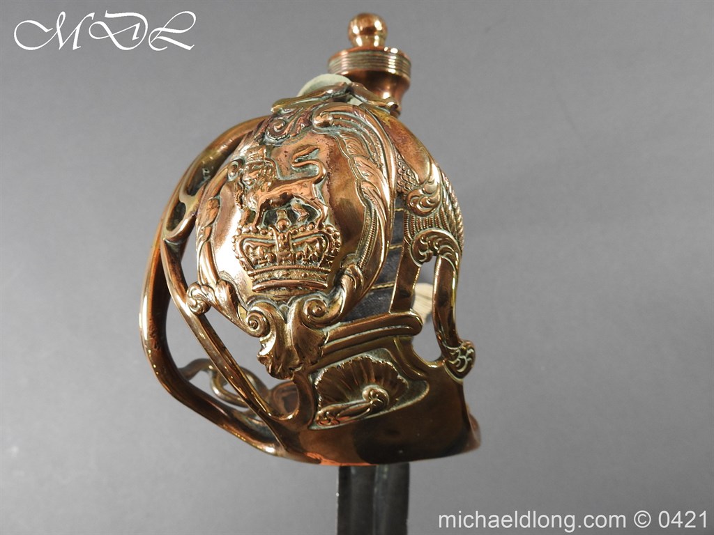 With double fullered blade with hatchet point, gilt brass half-basket hilt with oval shells, the outer guard comprising a crowned cartouche edged with acanthus foliage applied to which is a crowned lion on a crown, the inner guard with small scrolling bar with urn-shaped pommel with a broad band at the shoulder engraved with six concentric grooves, copper wire bound leather covered grip, in its brass scabbard with two openwork panels filled with fish skin, two suspension rings mounted on bands. Please note it is possible the grip has been replaced and is complete with white leather sword knot. Literature: please see D.G. Skinner, A Household Cavalry Sword or The British Cavalry Sword 1788 – 1912 by Richard Dellar plate 20.12 page 202
