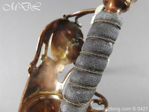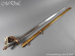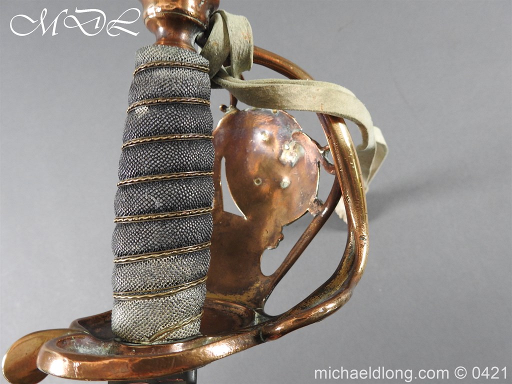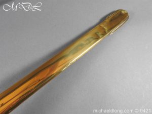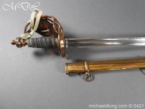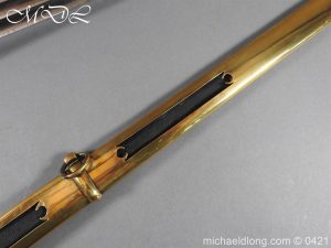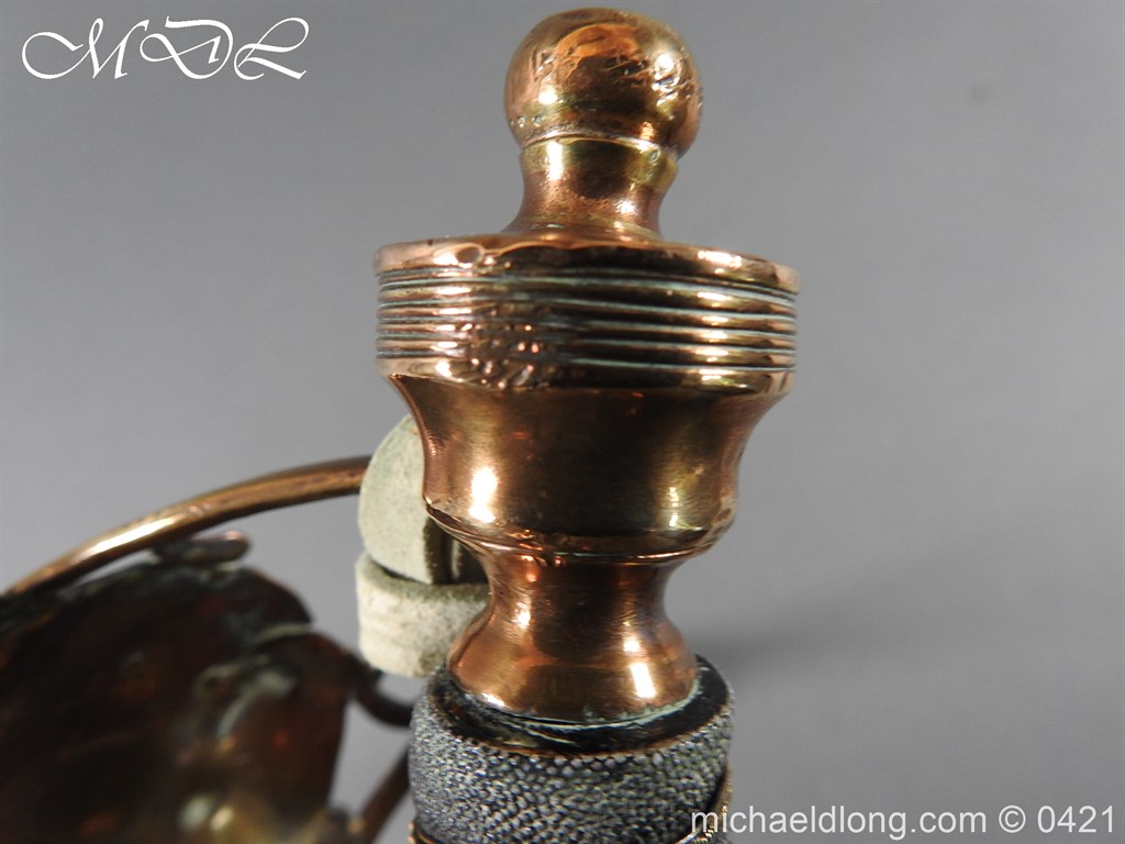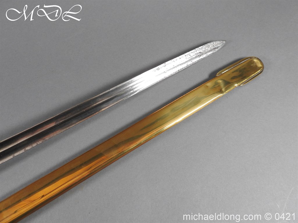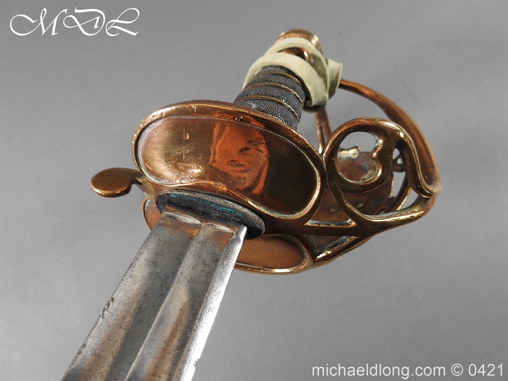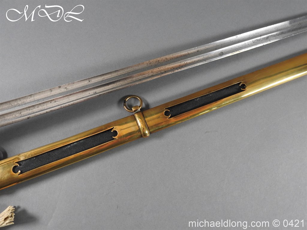 With double fullered blade with hatchet point, gilt brass half-basket hilt with oval shells, the outer guard comprising a crowned cartouche edged with acanthus foliage applied to which is a crowned lion on a crown, the inner guard with small scrolling bar with urn-shaped pommel with a broad band at the shoulder engraved with six concentric grooves, copper wire bound leather covered grip, in its brass scabbard with two openwork panels filled with fish skin, two suspension rings mounted on bands. Please note it is possible the grip has been replaced and is complete with white leather sword knot. Literature: please see D.G. Skinner, A Household Cavalry Sword or The British Cavalry Sword 1788 – 1912 by Richard Dellar plate 20.12 page 202