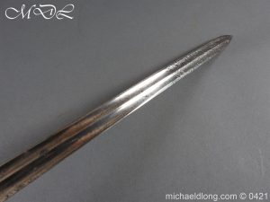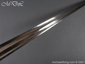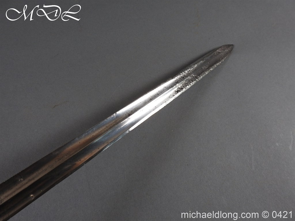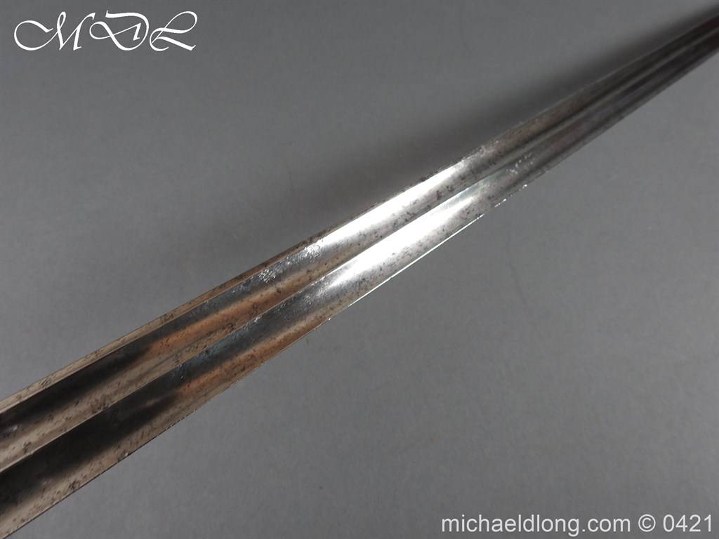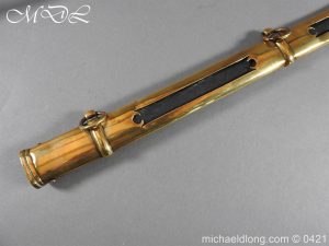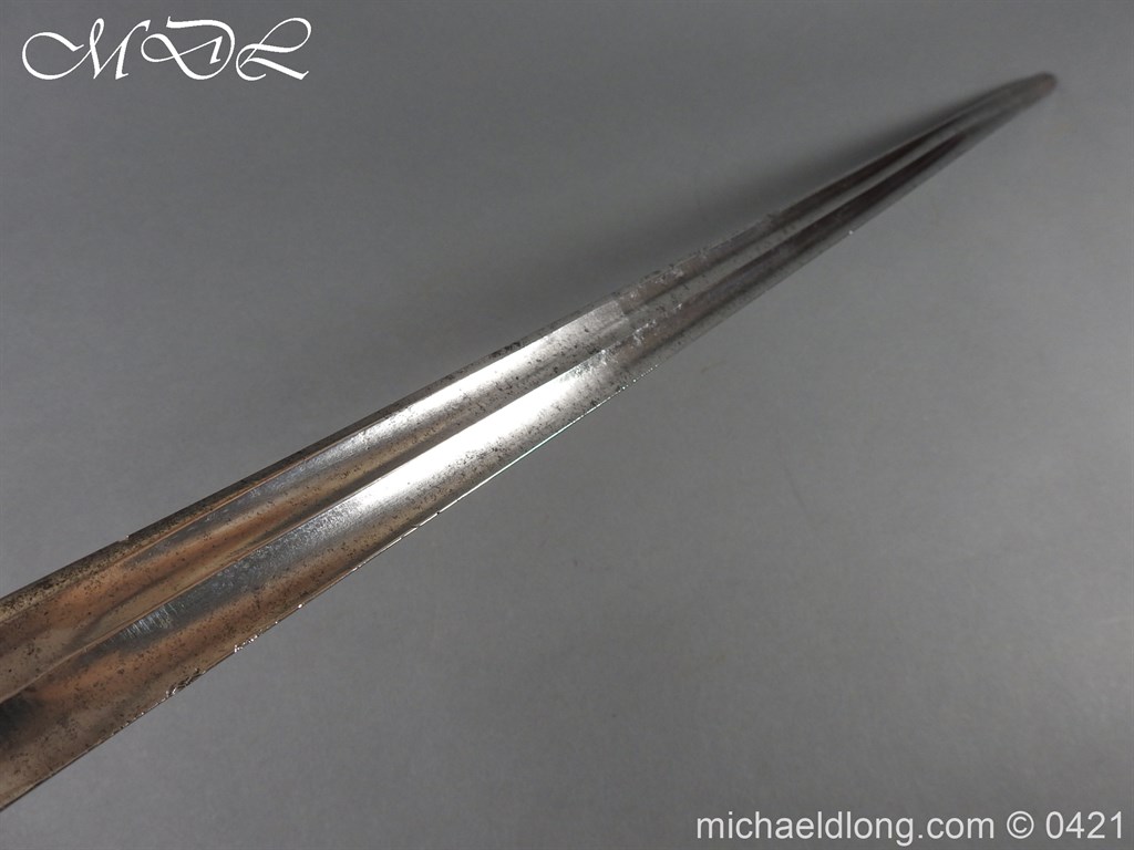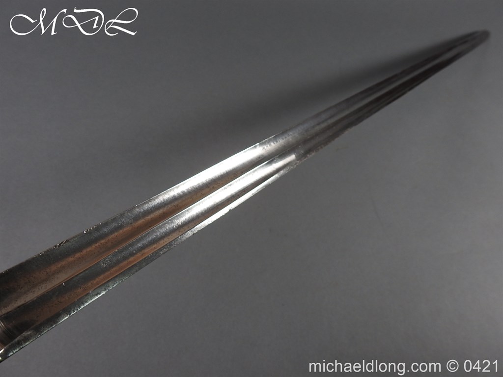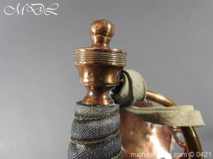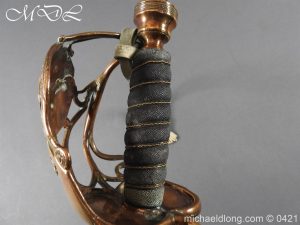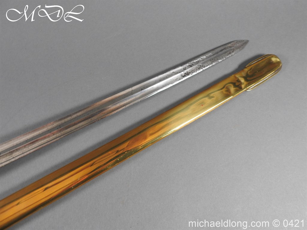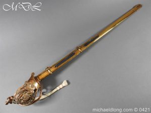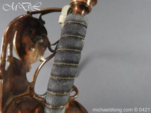 With double fullered blade with hatchet point, gilt brass half-basket hilt with oval shells, the outer guard comprising a crowned cartouche edged with acanthus foliage applied to which is a crowned lion on a crown, the inner guard with small scrolling bar with urn-shaped pommel with a broad band at the shoulder engraved with six concentric grooves, copper wire bound leather covered grip, in its brass scabbard with two openwork panels filled with fish skin, two suspension rings mounted on bands. Please note it is possible the grip has been replaced and is complete with white leather sword knot. Literature: please see D.G. Skinner, A Household Cavalry Sword or The British Cavalry Sword 1788 – 1912 by Richard Dellar plate 20.12 page 202