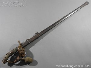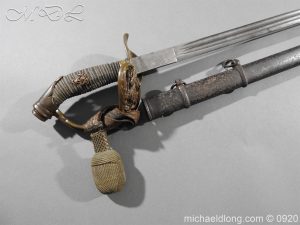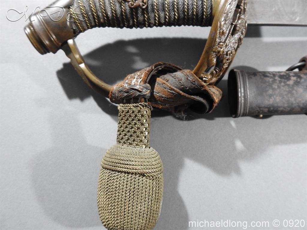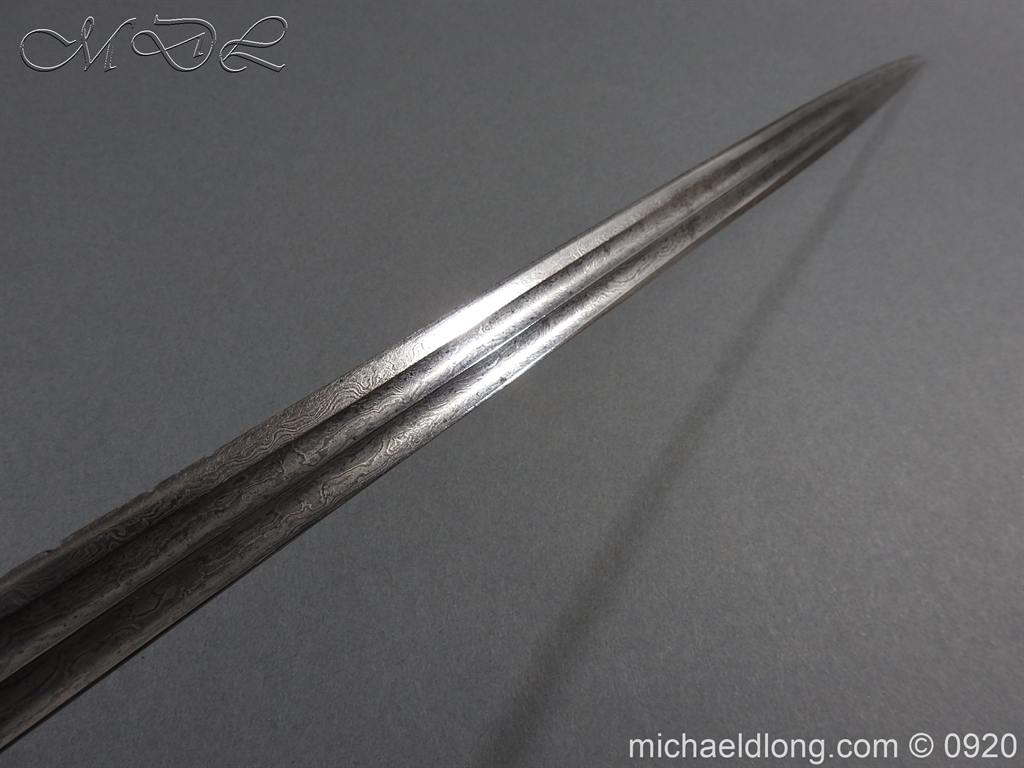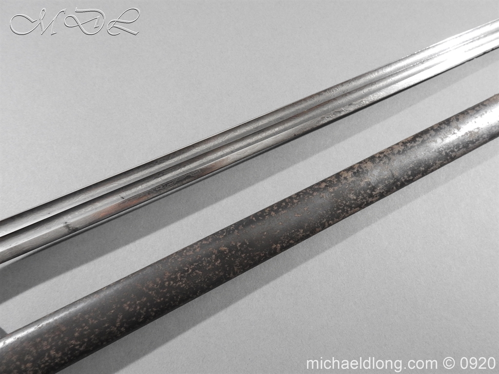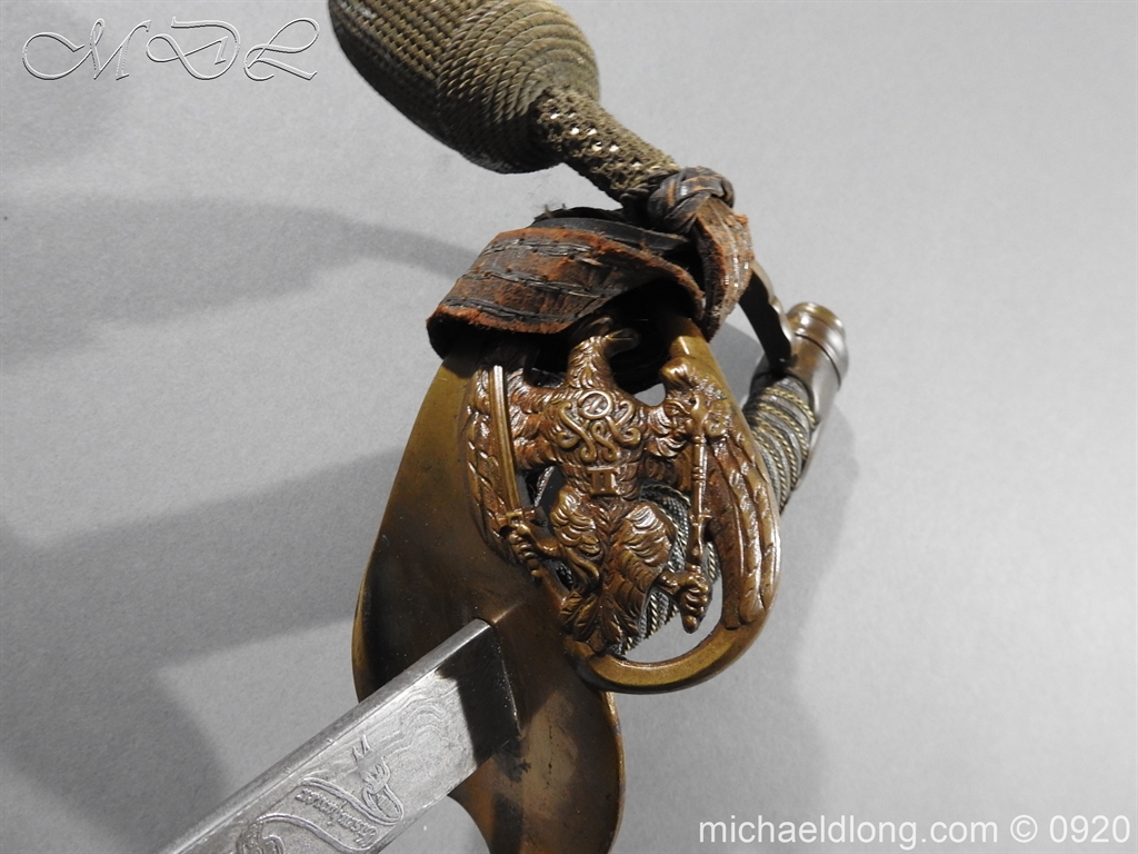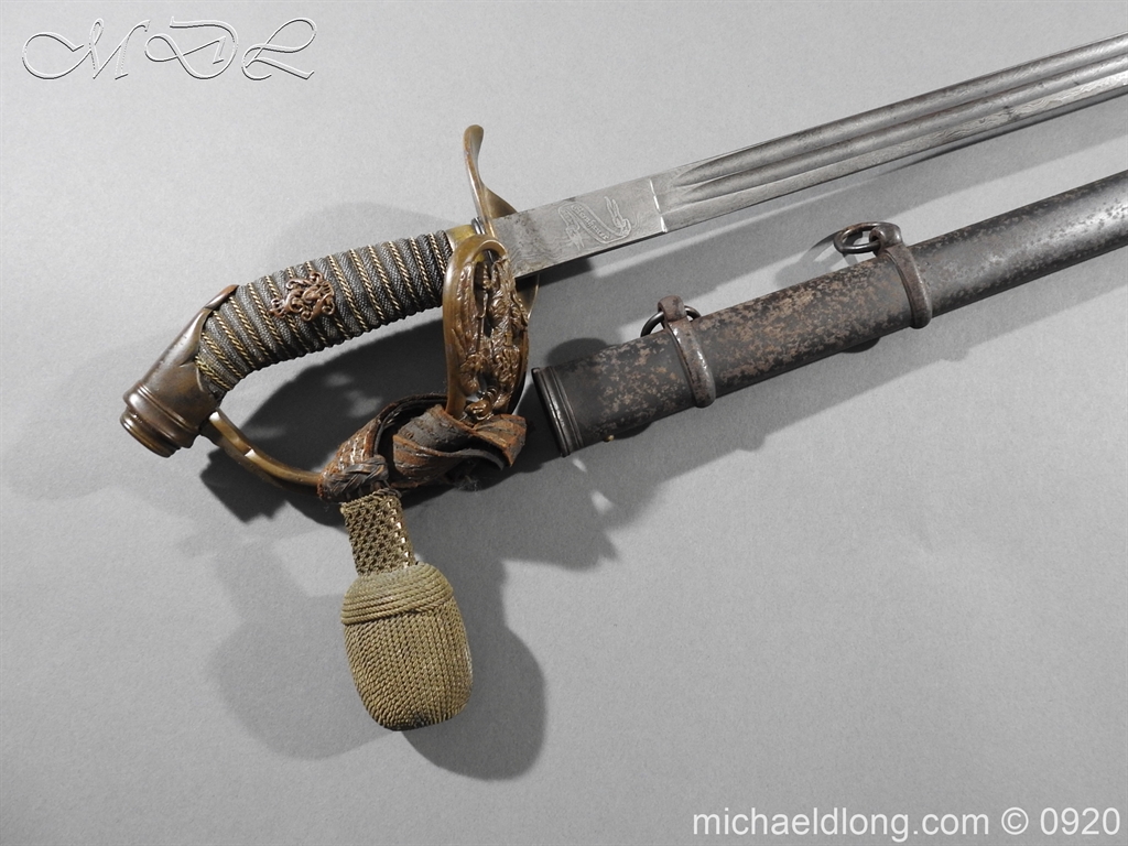 Imperial German Model 1889 Infantry Officers Sword with Damascus Blade, nice untouched example of a Model 1889 Prussian Infantry officers sword, folding guard, knuckle guard and pommel with original knot and hanging belt. Fish skin grip retaining the original wire and gilt monogram. Pipe backed Damascus blade in very condition the Damascus pattern very clear. Complete with its original black painted field service scabbard.