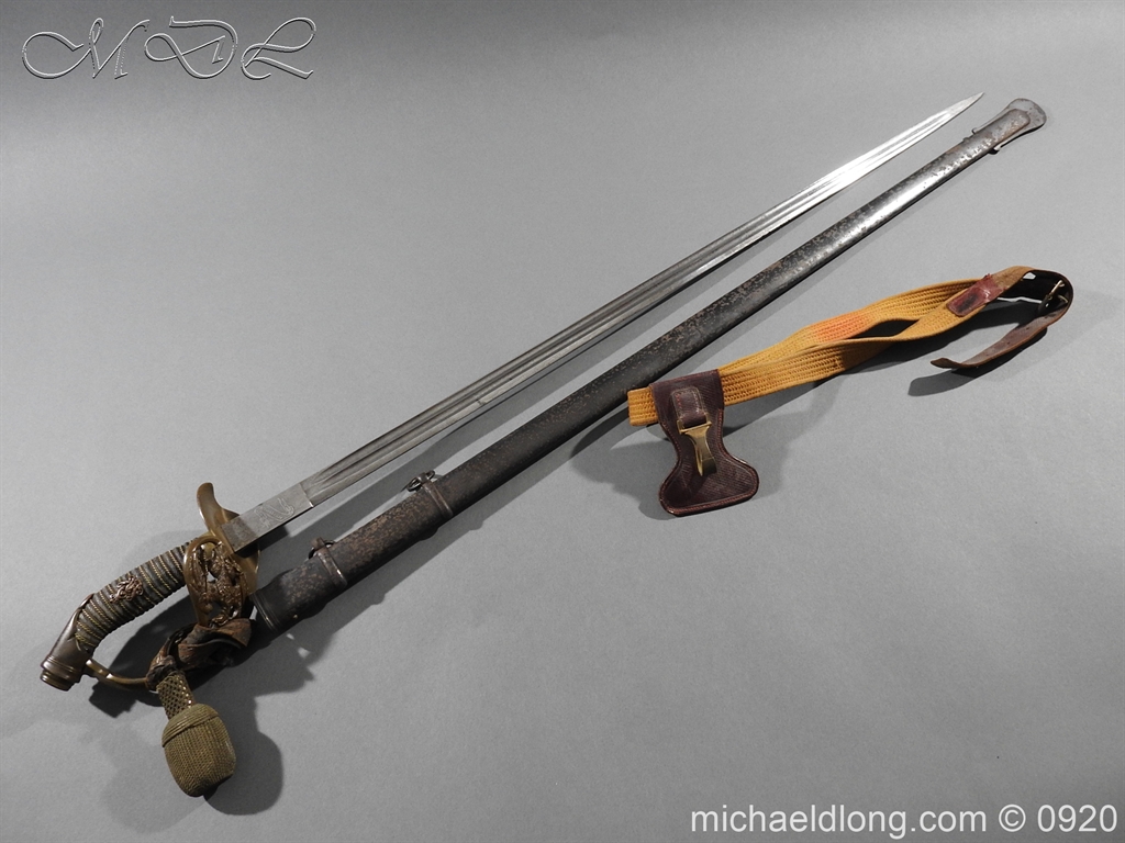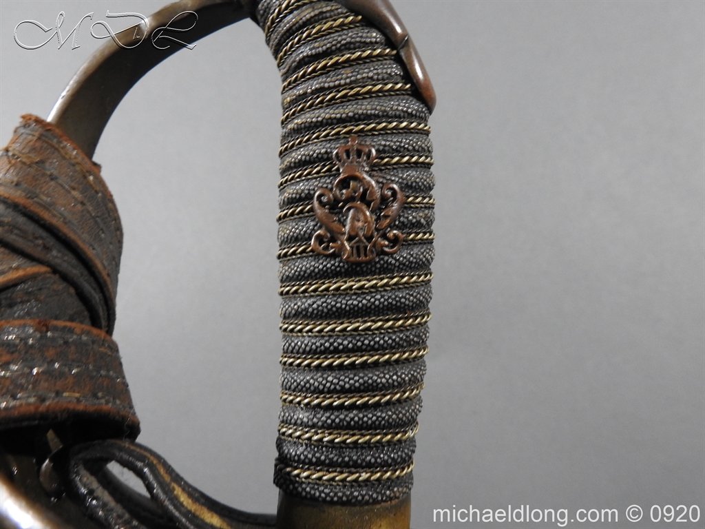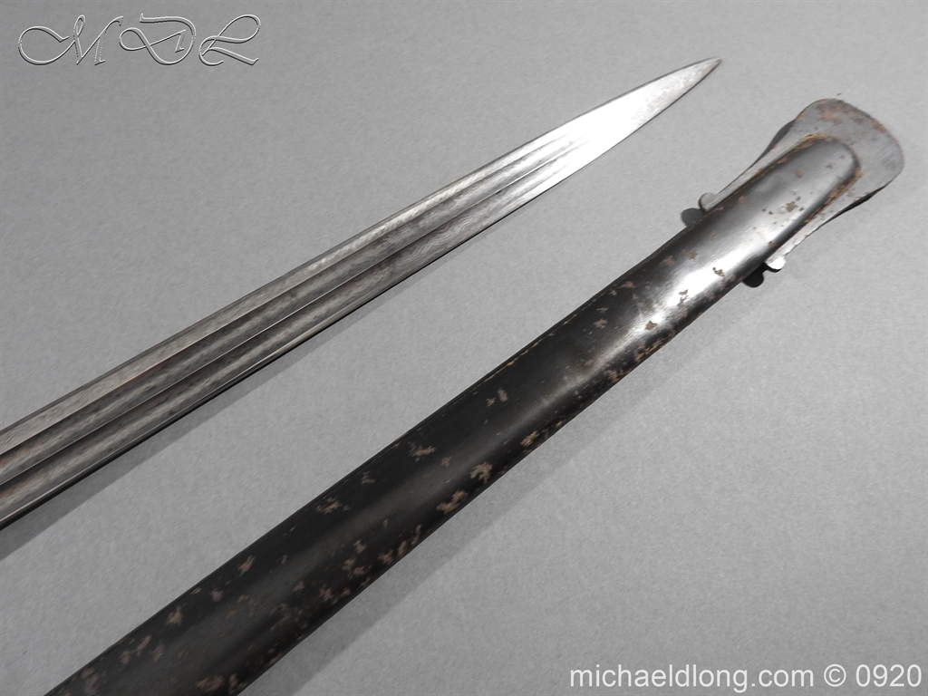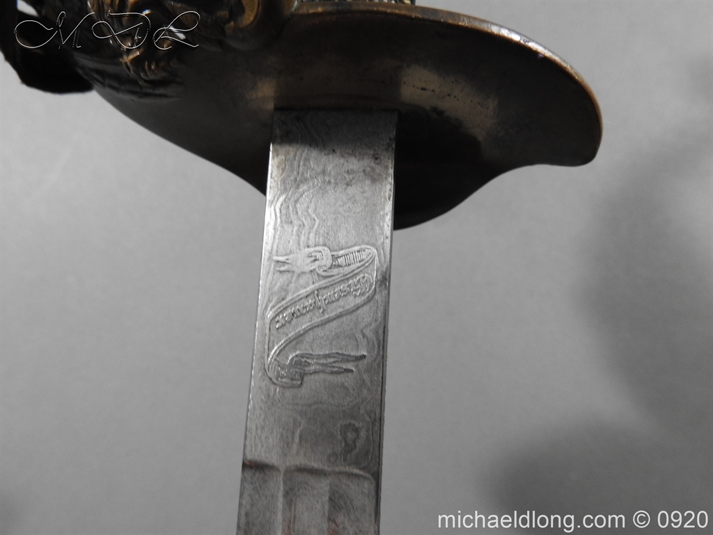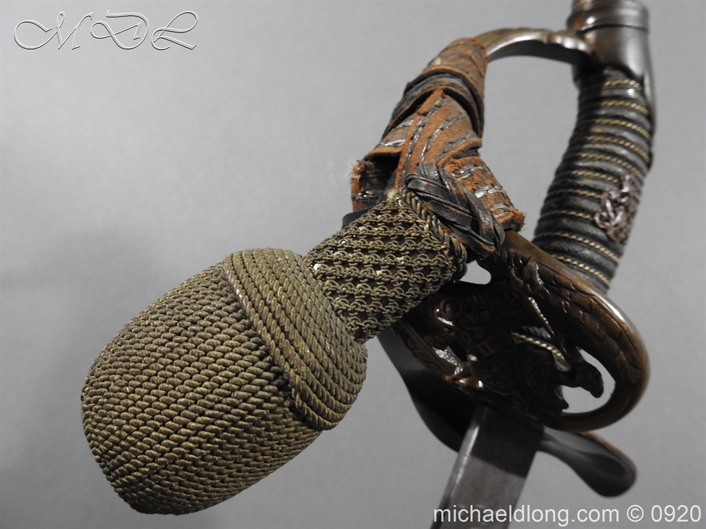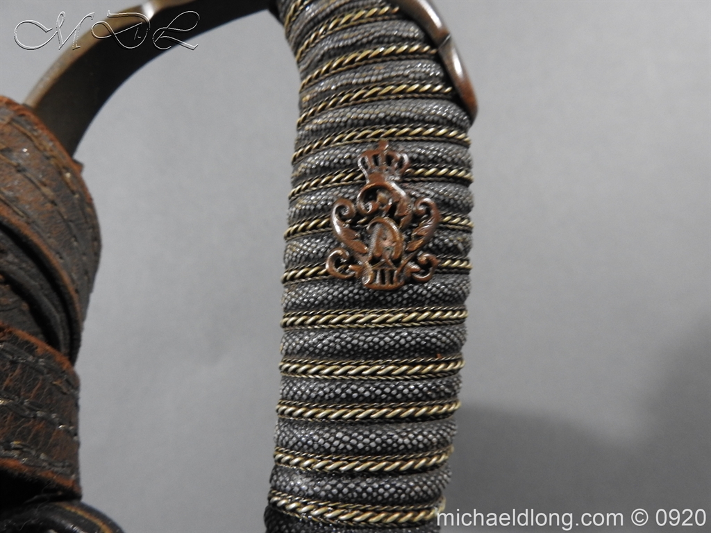 Imperial German Model 1889 Infantry Officers Sword with Damascus Blade, nice untouched example of a Model 1889 Prussian Infantry officers sword, folding guard, knuckle guard and pommel with original knot and hanging belt. Fish skin grip retaining the original wire and gilt monogram. Pipe backed Damascus blade in very condition the Damascus pattern very clear. Complete with its original black painted field service scabbard.