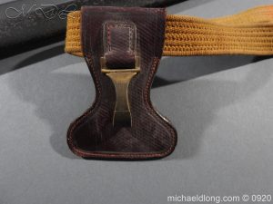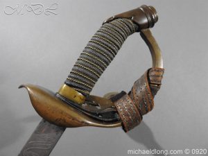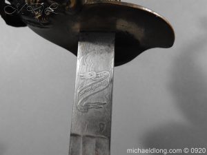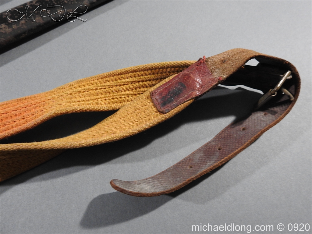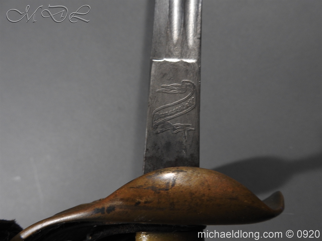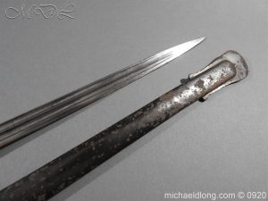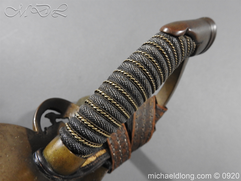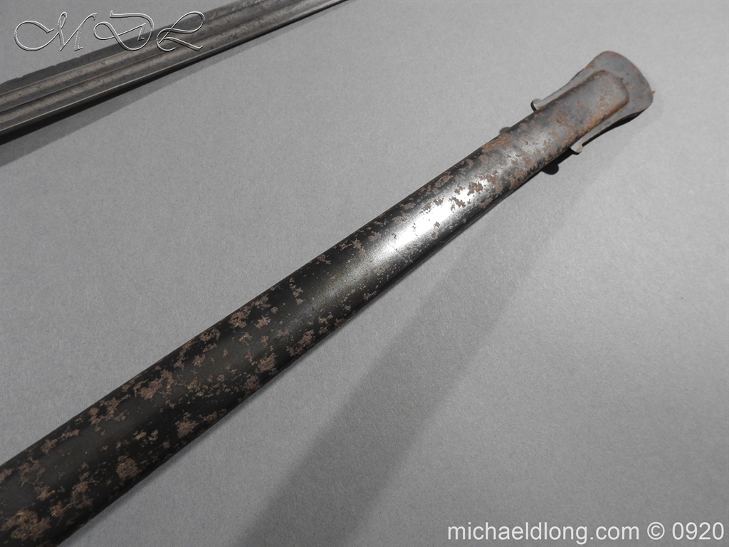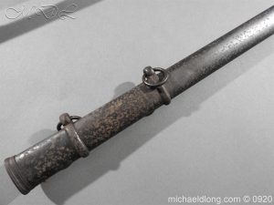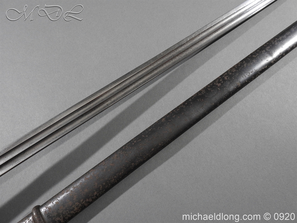 Imperial German Model 1889 Infantry Officers Sword with Damascus Blade, nice untouched example of a Model 1889 Prussian Infantry officers sword, folding guard, knuckle guard and pommel with original knot and hanging belt. Fish skin grip retaining the original wire and gilt monogram. Pipe backed Damascus blade in very condition the Damascus pattern very clear. Complete with its original black painted field service scabbard.