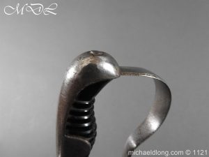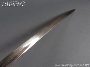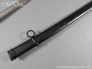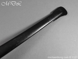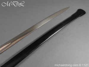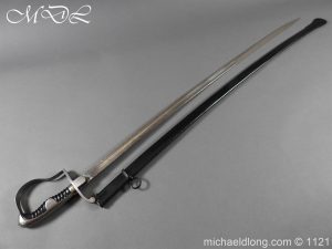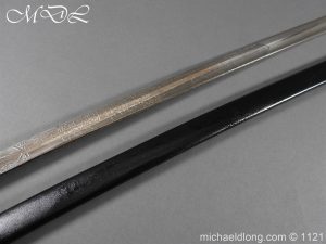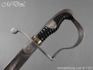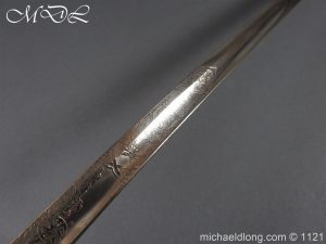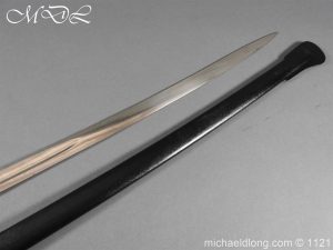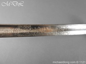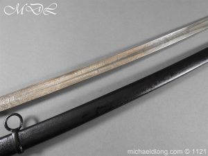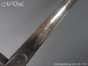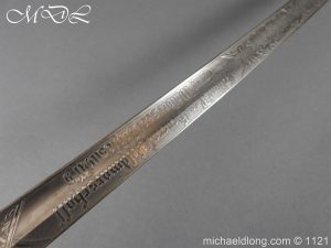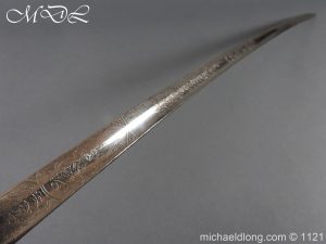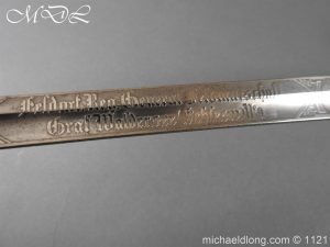 Imperial German Officer’s Field Artillery Sword, Feldartillerie Regiment General-Feldmarschall Graf Waldersee (Schlesw.) No. 9 Slightly curved single-edged blade with wide fuller. One side engraved with soldier on horse and artillery unit pulled by horses plus trophies of arms and floral decoration the reverse similar but with a shorten version of the artillery units name please see images. The back edge also decorated with etchings, maker’s stamp for Carl Eickhorn on ricasso under langet and complete with black steel scabbard