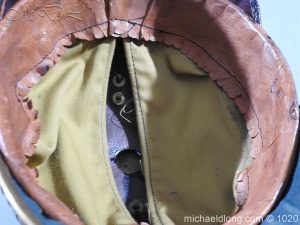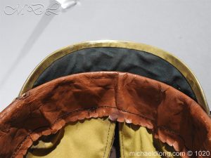 Imperial German Württemberg Officer Pickelhaube leather body. The officer fish scales chin strap, the Wurttemberg front plate, the spike, spike base, and rear spine all show uncleaned patina. The national colors officer cockade is present on the right side, and the on the left side shows age wear colour missing. The full leather sweat band is intact, as is the lining of the helmet. The helmet shows signs of age and wear but remains in overall good condition.
