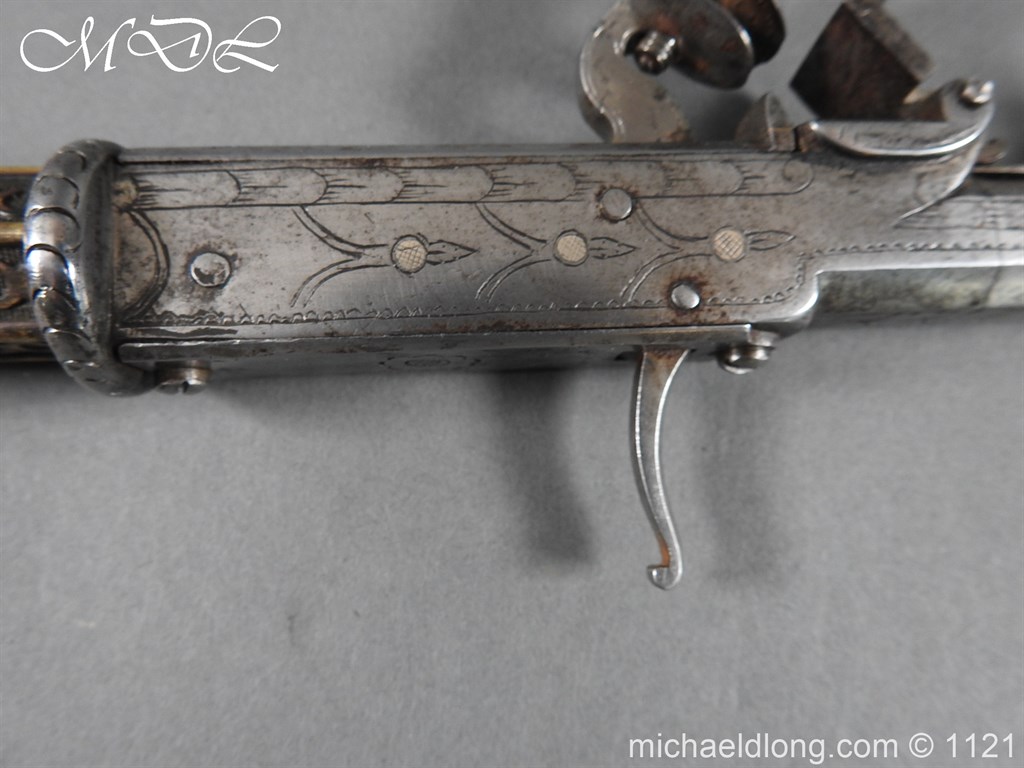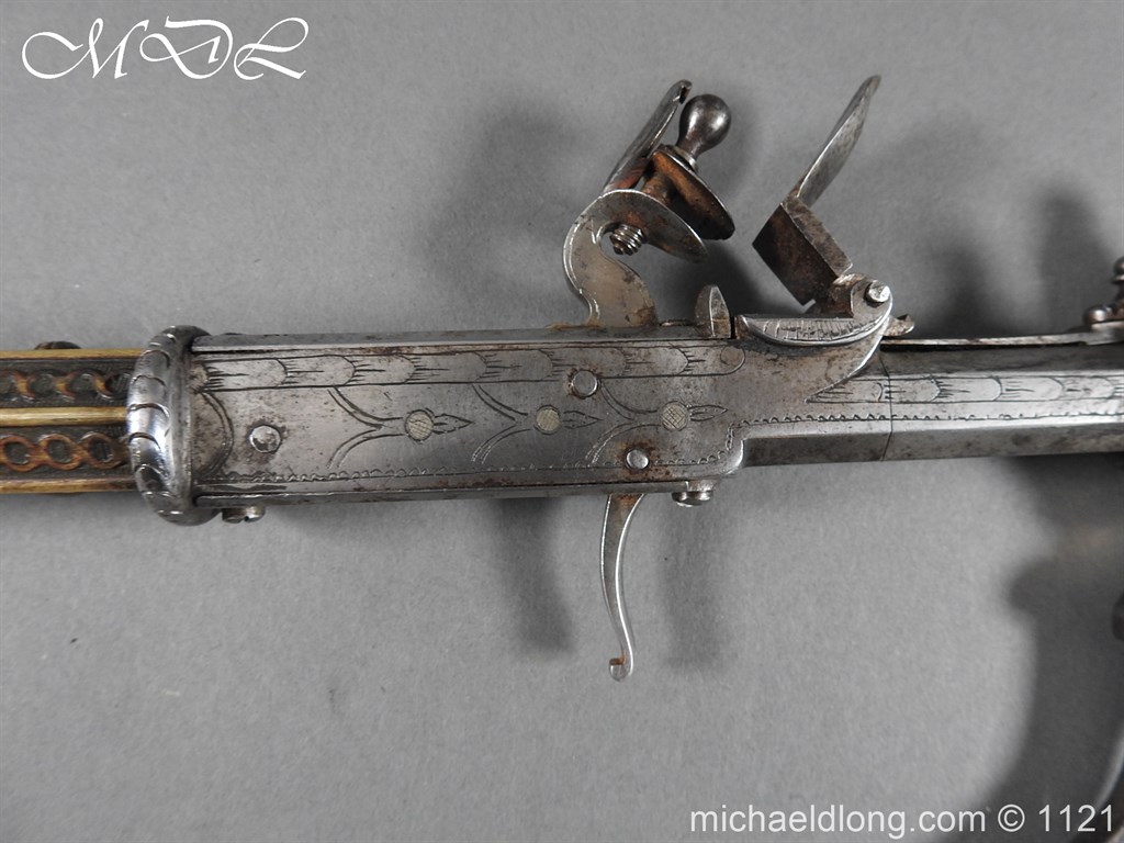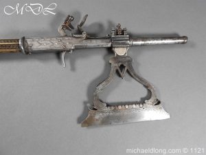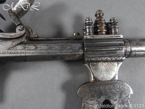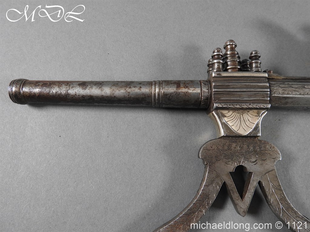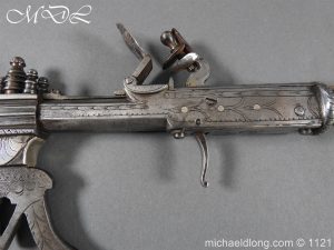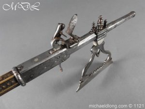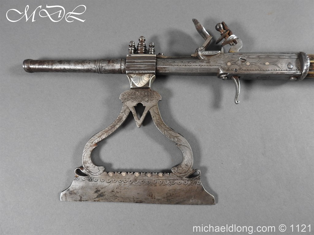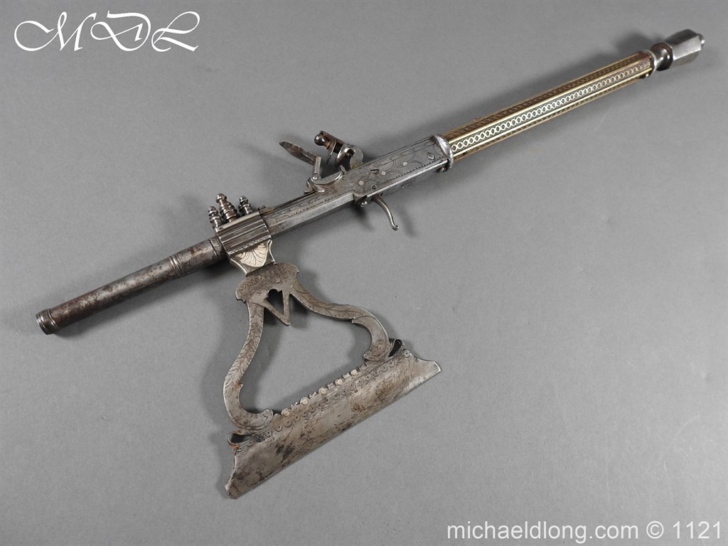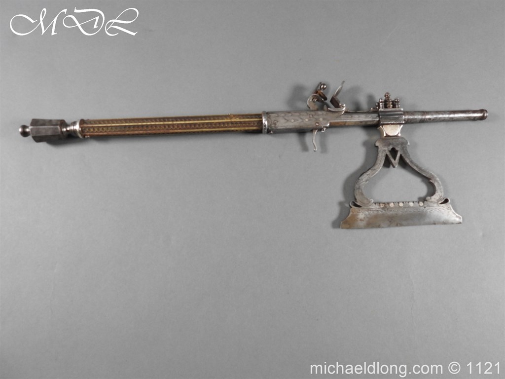 A very rare combination Indian weapon early 19th century. It has a flintlock pistol mounted on the shaft of the steel axe with a concealed blade in the rear of the shaft. The barrel is 6.5 inches long. The axe blade is 5.75 inches long and the concealed steel blade is 6 inches in length. The gilt brass shaft is decorated with circular design and all steel parts with the exception of the last two stages of the barrel have floral engraved design with silver dots inlayed. Overall length 22 inches all parts in working order some age discolour to metal work no pitting please see blades and barrels by Gordon Frost chapter 5 Axe – Pistols for reference