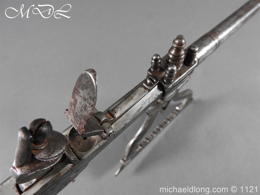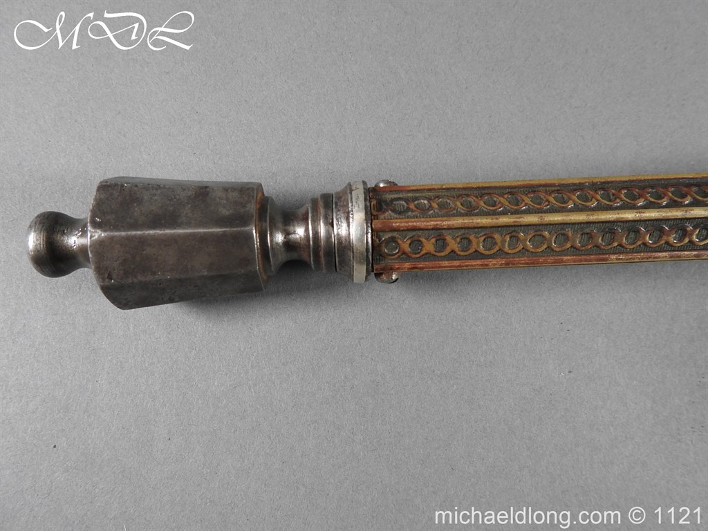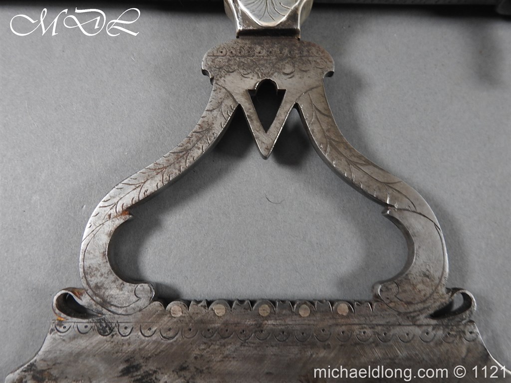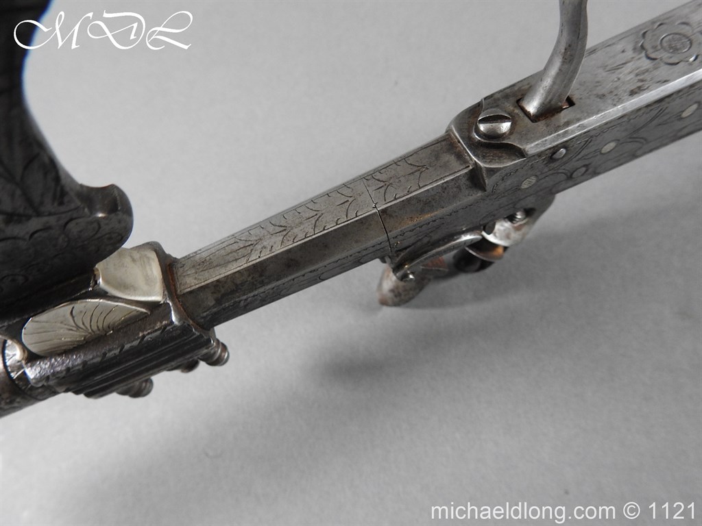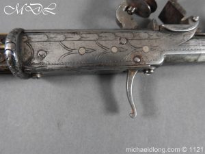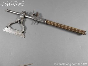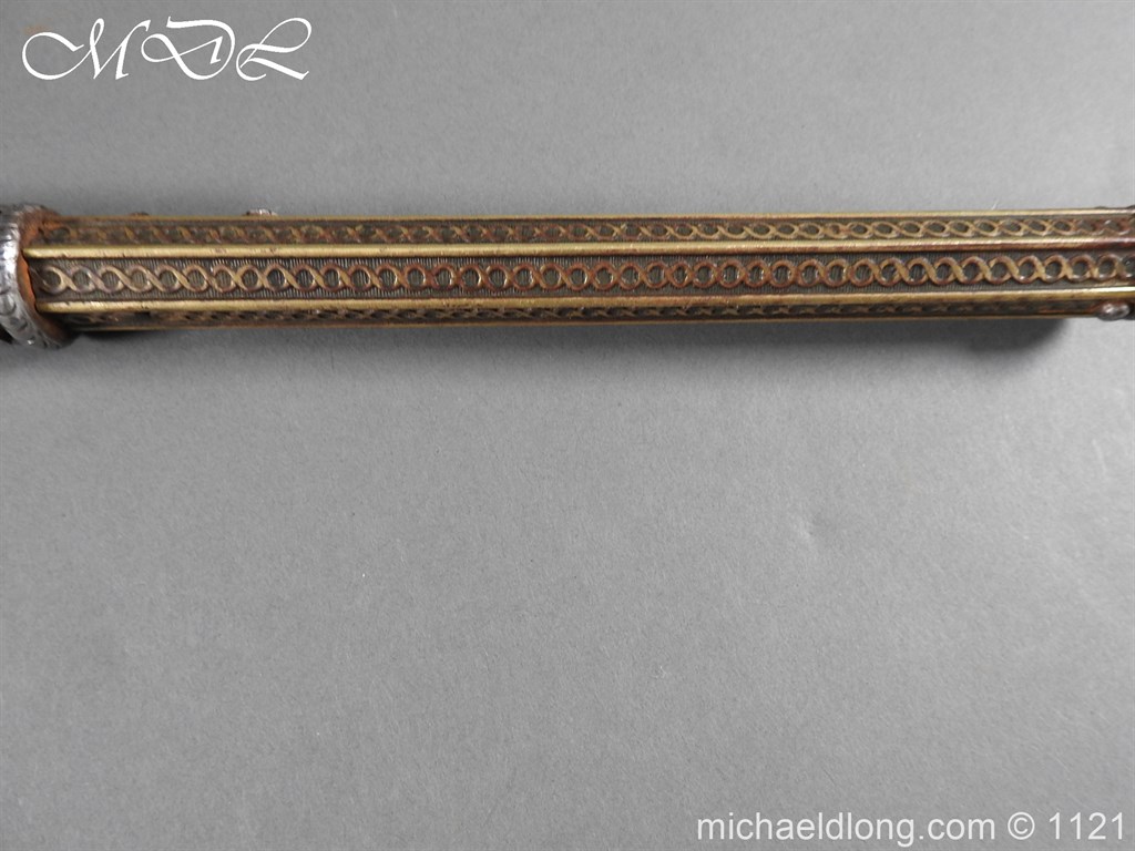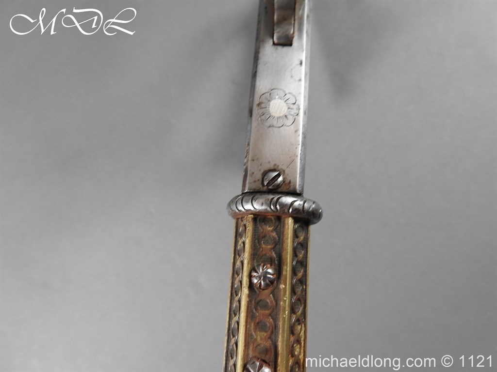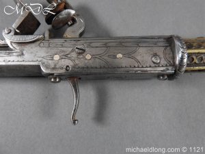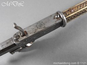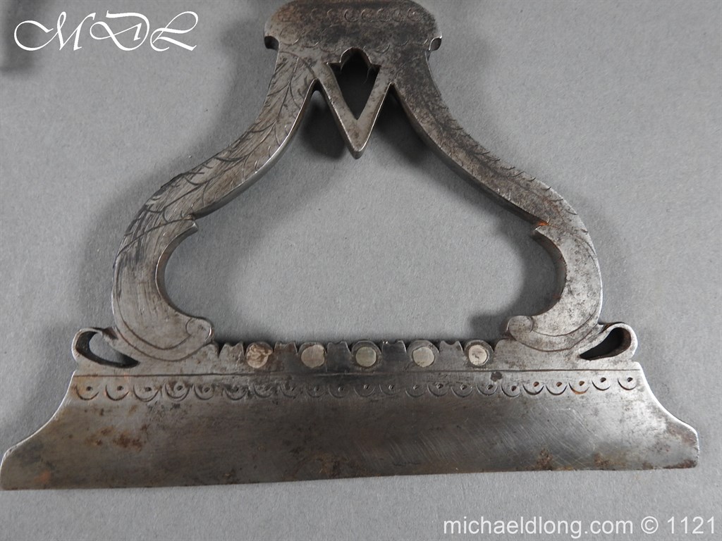A very rare combination Indian weapon early 19th century. It has a flintlock pistol mounted on the shaft of the steel axe with a concealed blade in the rear of the shaft. The barrel is 6.5 inches long. The axe blade is 5.75 inches long and the concealed steel blade is 6 inches in length. The gilt brass shaft is decorated with circular design and all steel parts with the exception of the last two stages of the barrel have floral engraved design with silver dots inlayed. Overall length 22 inches all parts in working order some age discolour to metal work no pitting please see blades and barrels by Gordon Frost chapter 5 Axe – Pistols for reference