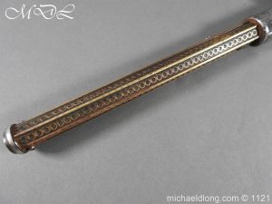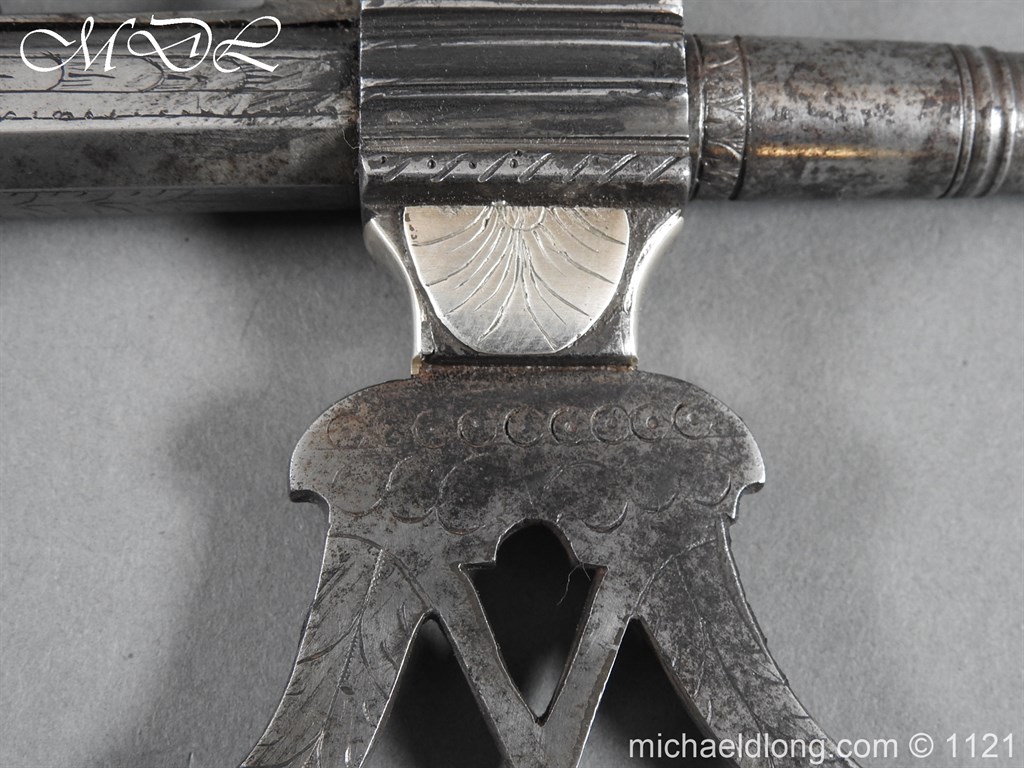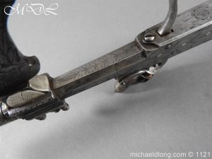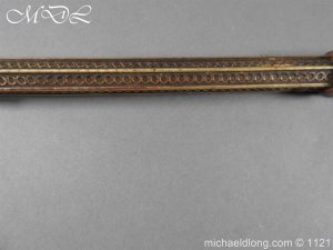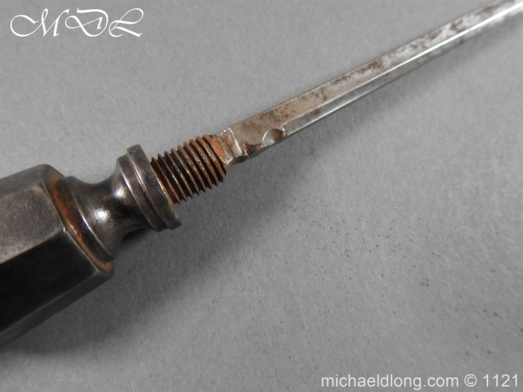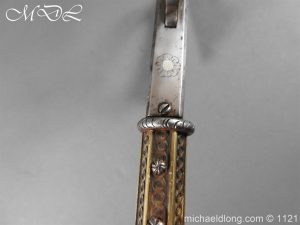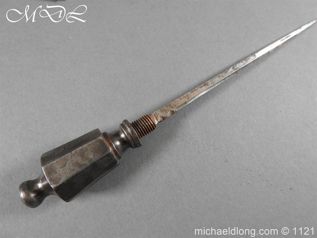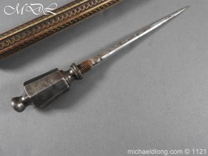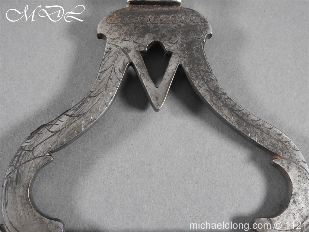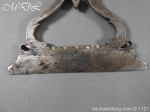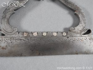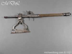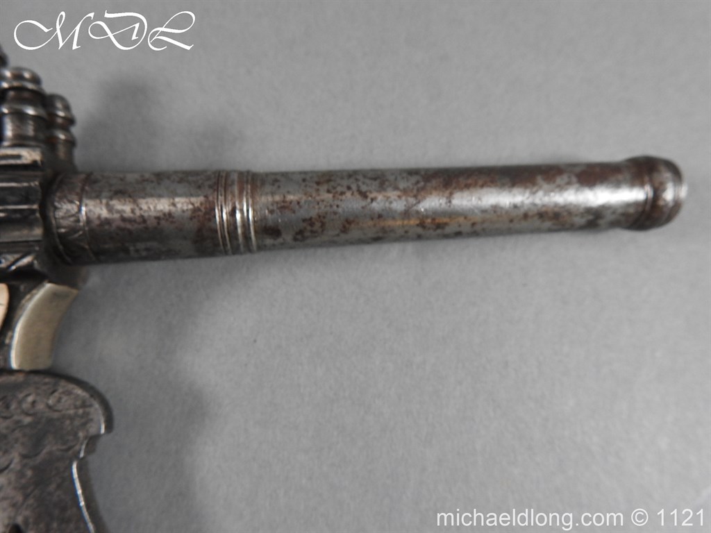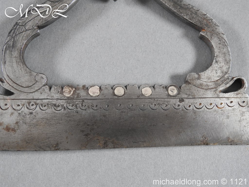 A very rare combination Indian weapon early 19th century. It has a flintlock pistol mounted on the shaft of the steel axe with a concealed blade in the rear of the shaft. The barrel is 6.5 inches long. The axe blade is 5.75 inches long and the concealed steel blade is 6 inches in length. The gilt brass shaft is decorated with circular design and all steel parts with the exception of the last two stages of the barrel have floral engraved design with silver dots inlayed. Overall length 22 inches all parts in working order some age discolour to metal work no pitting please see blades and barrels by Gordon Frost chapter 5 Axe – Pistols for reference