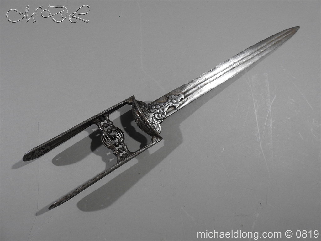 Excellent all steel Indian Katar H section hilt with super decoration and matching central bar. The double edge blade with 2 fullers overall length 50cm blade 33cm. Notes: The katar or katara, is a type of push dagger from the Indian subcontinent. The dagger is characterised by its H-shaped horizontal hand grip which results in the blade sitting above the user’s knuckles. Unique to the Indian subcontinent, it is the most famous and characteristic of Indian daggers