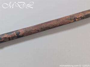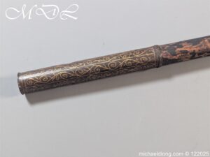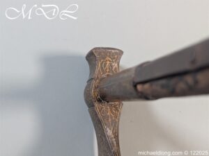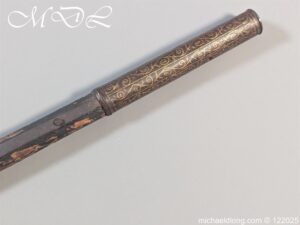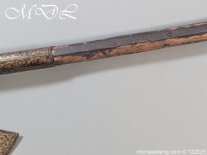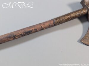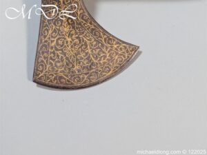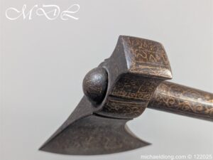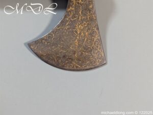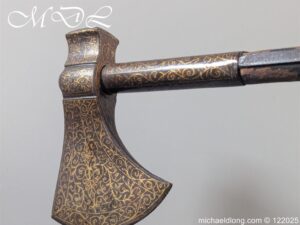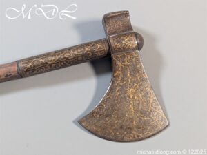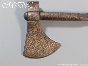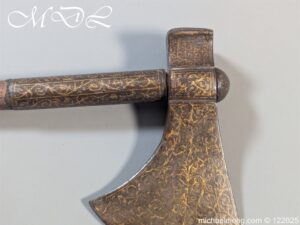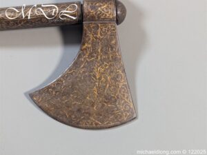Indian 18th Century Battle Axe with super gilt inlaid floral decoration all metal surfaces. The width of blade is 4.25 inch the height of the head 6.25 inch. The wooden shaft which is missing the wrap is fitted with a metal reinforcement strip which leads to the matching grip which is 6 inches in length. Overall length 24.25 inch and please note slight movement in the axe head on the shaft.