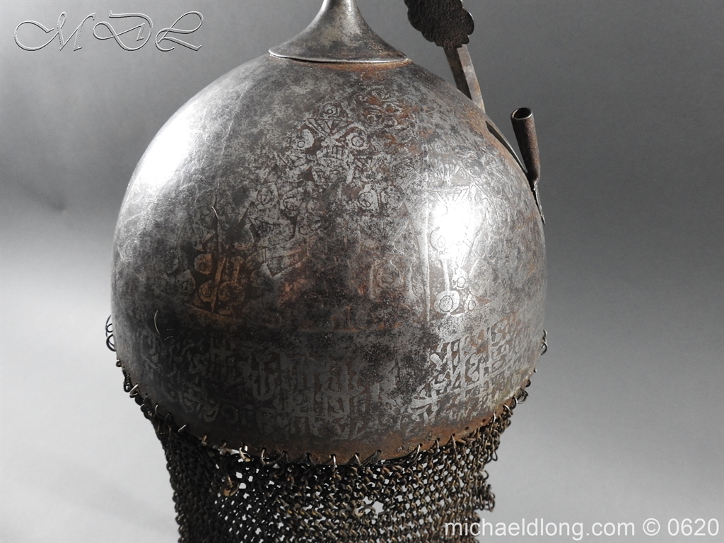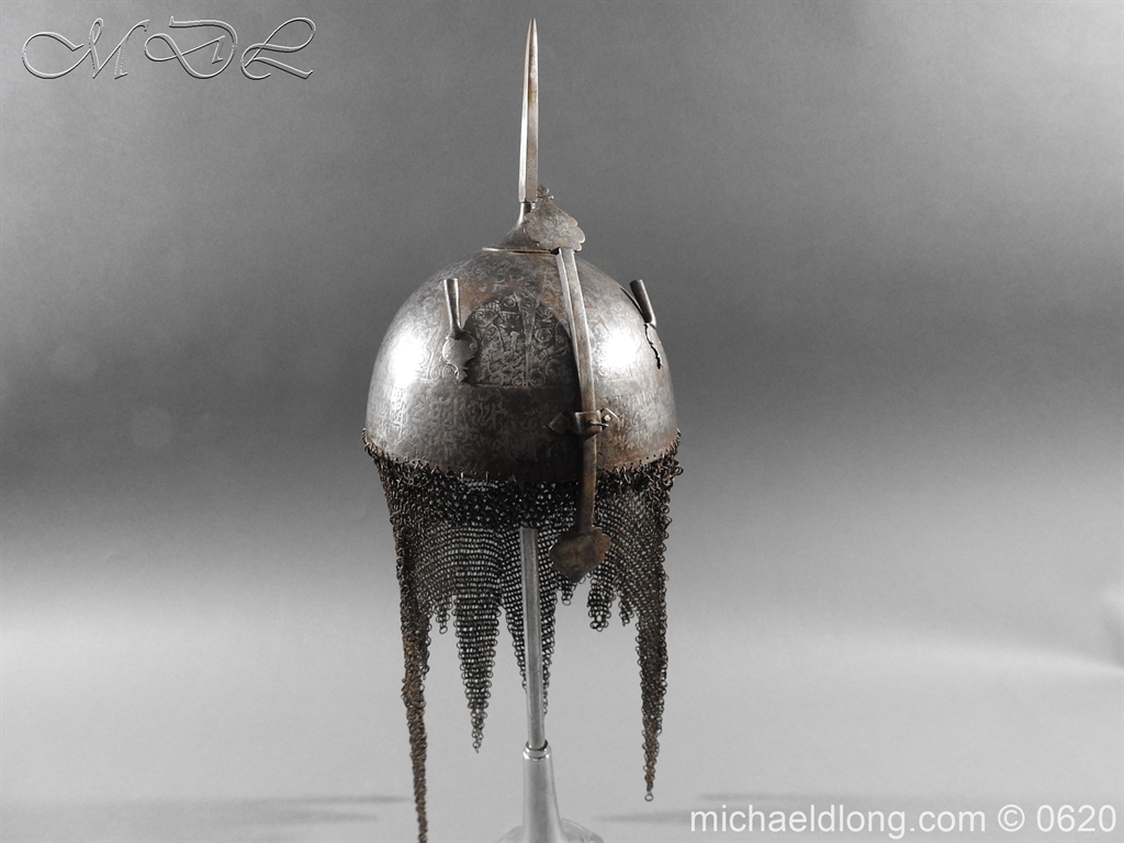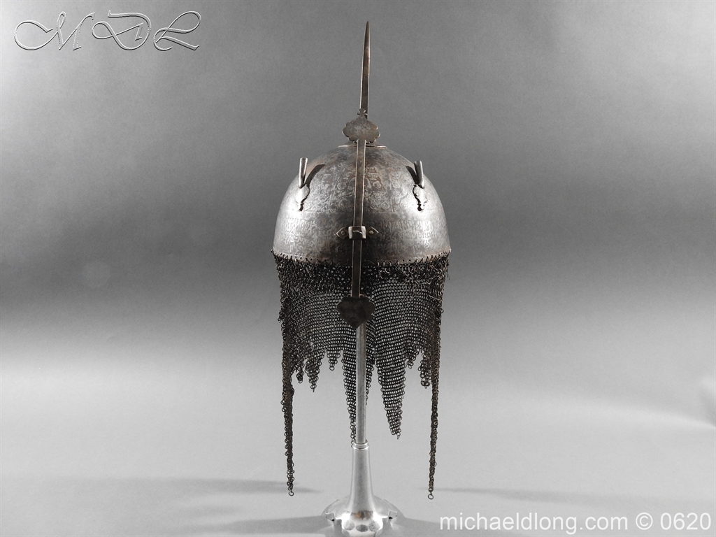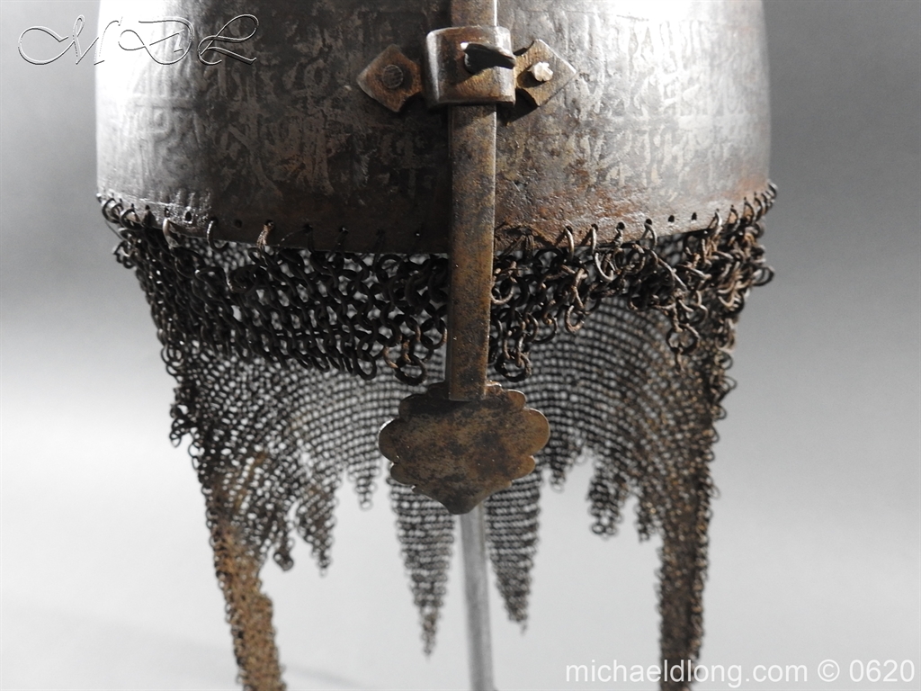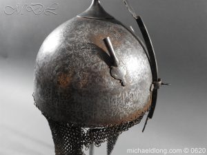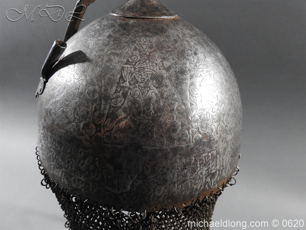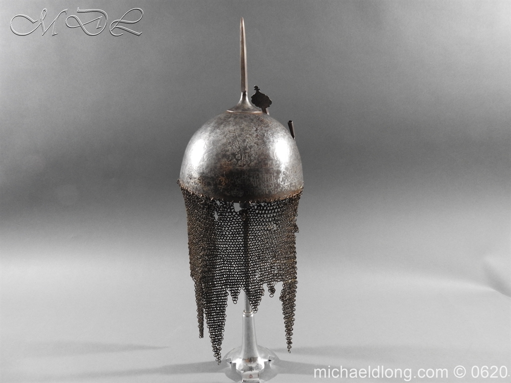 Indo Persia 19th Century. A Kula Khud helmet of traditional form with chain mail neck protector, tall helmet spike on top centre, a curved spike on front, with two metal holders for plumes. Beautifully etched with figures across helmet with script decoration to rim. 8″W x 10″H. Chain mail hangs down 12 inches. The helmet would clean if required however has a nice age patina
