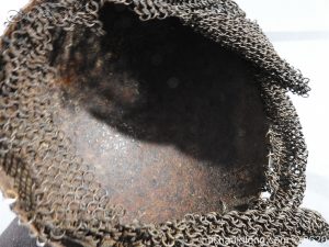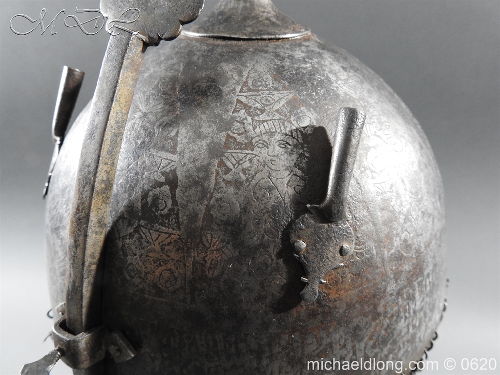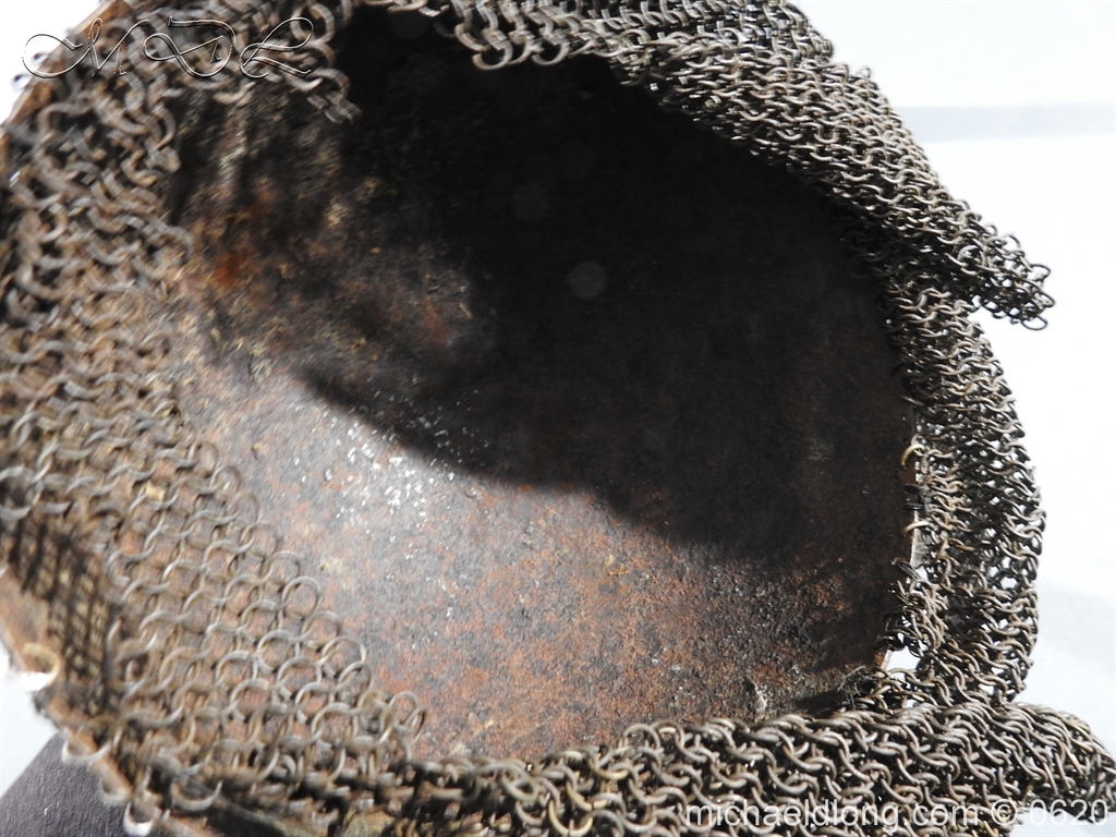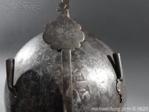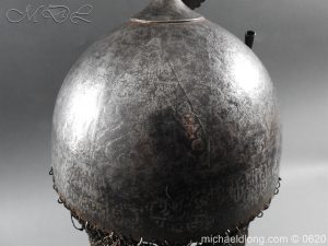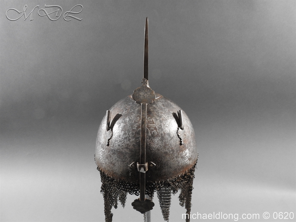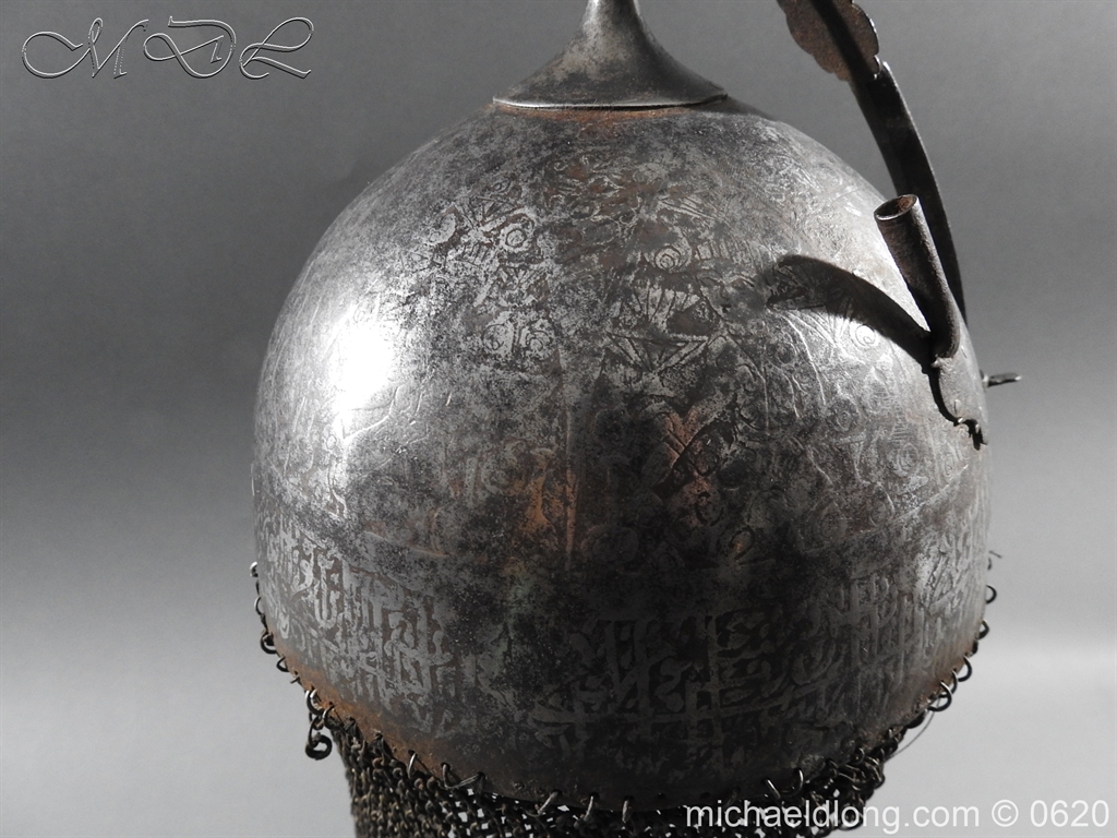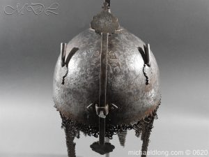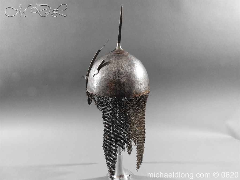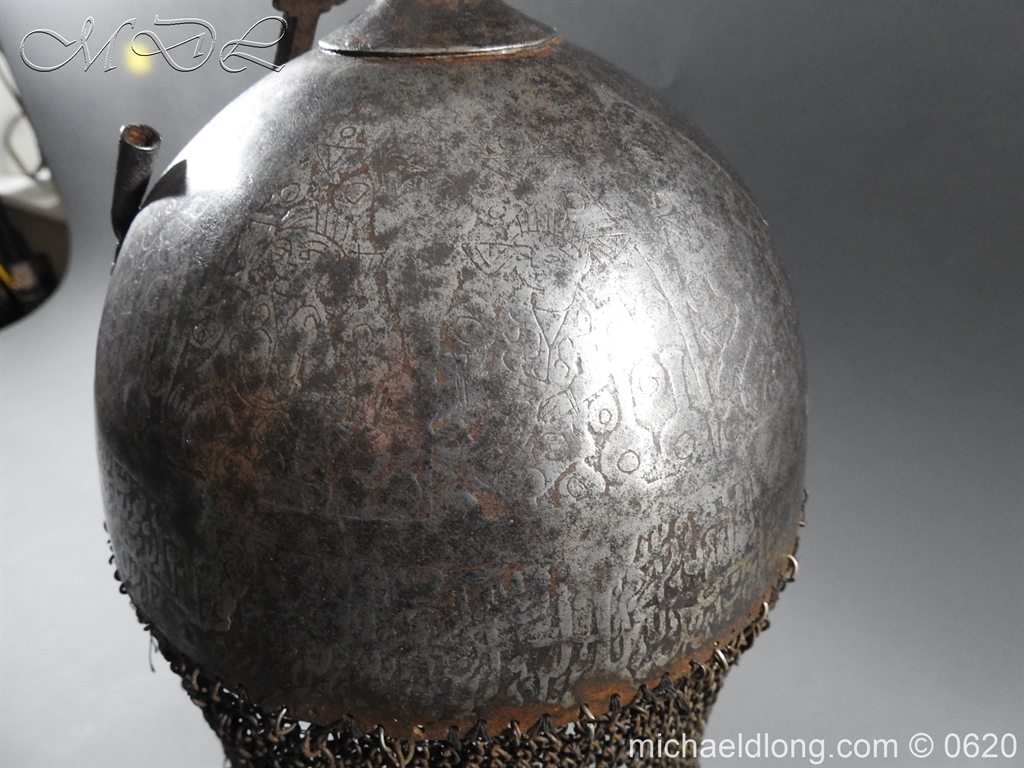 Indo Persia 19th Century. A Kula Khud helmet of traditional form with chain mail neck protector, tall helmet spike on top centre, a curved spike on front, with two metal holders for plumes. Beautifully etched with figures across helmet with script decoration to rim. 8″W x 10″H. Chain mail hangs down 12 inches. The helmet would clean if required however has a nice age patina