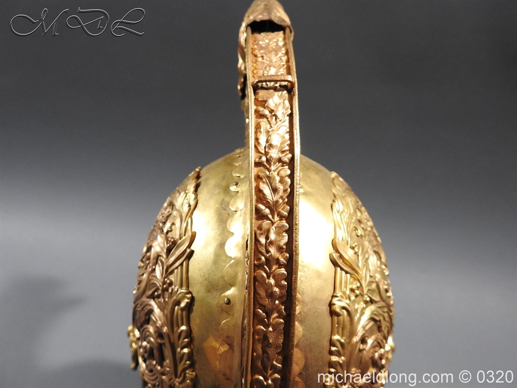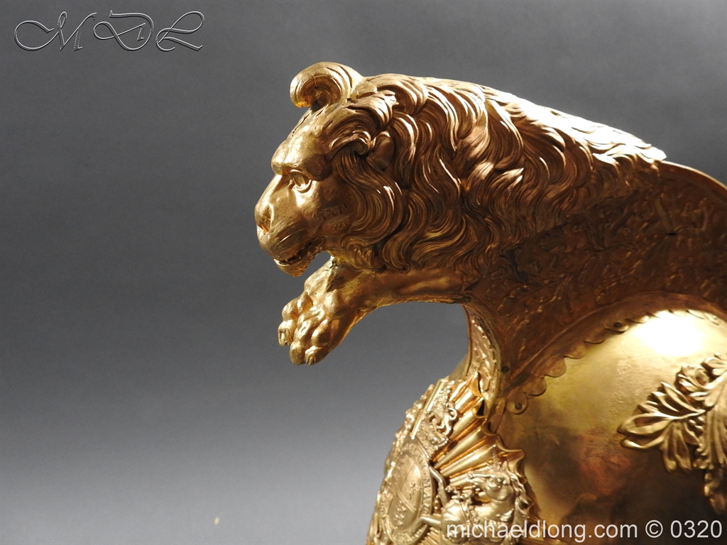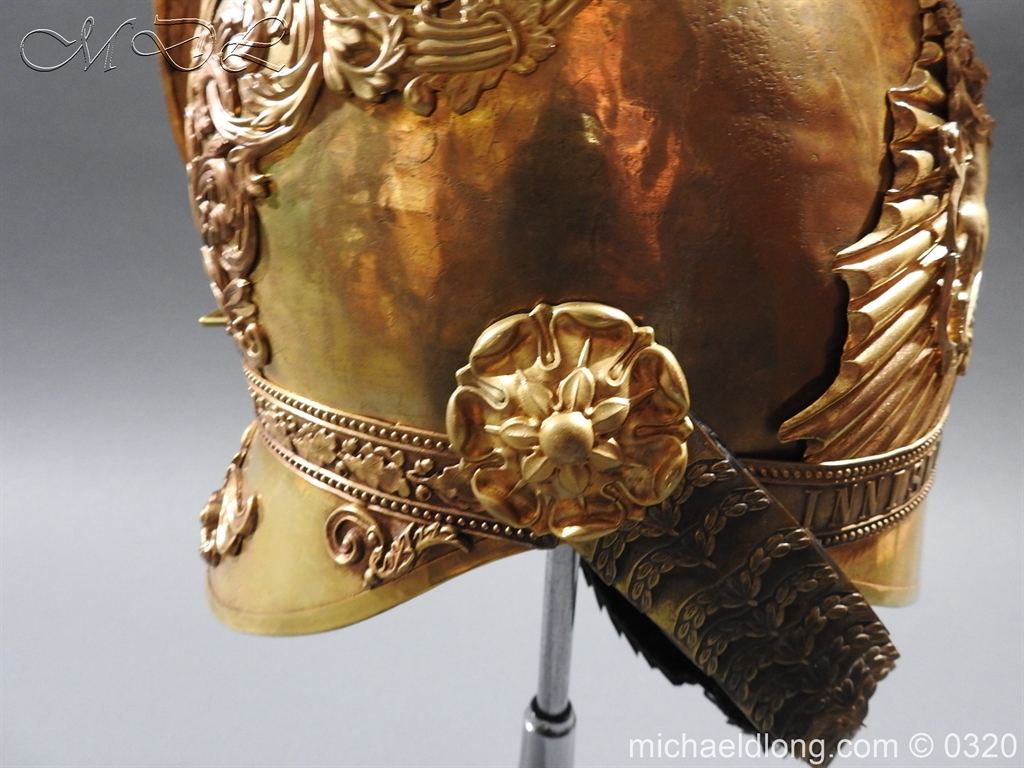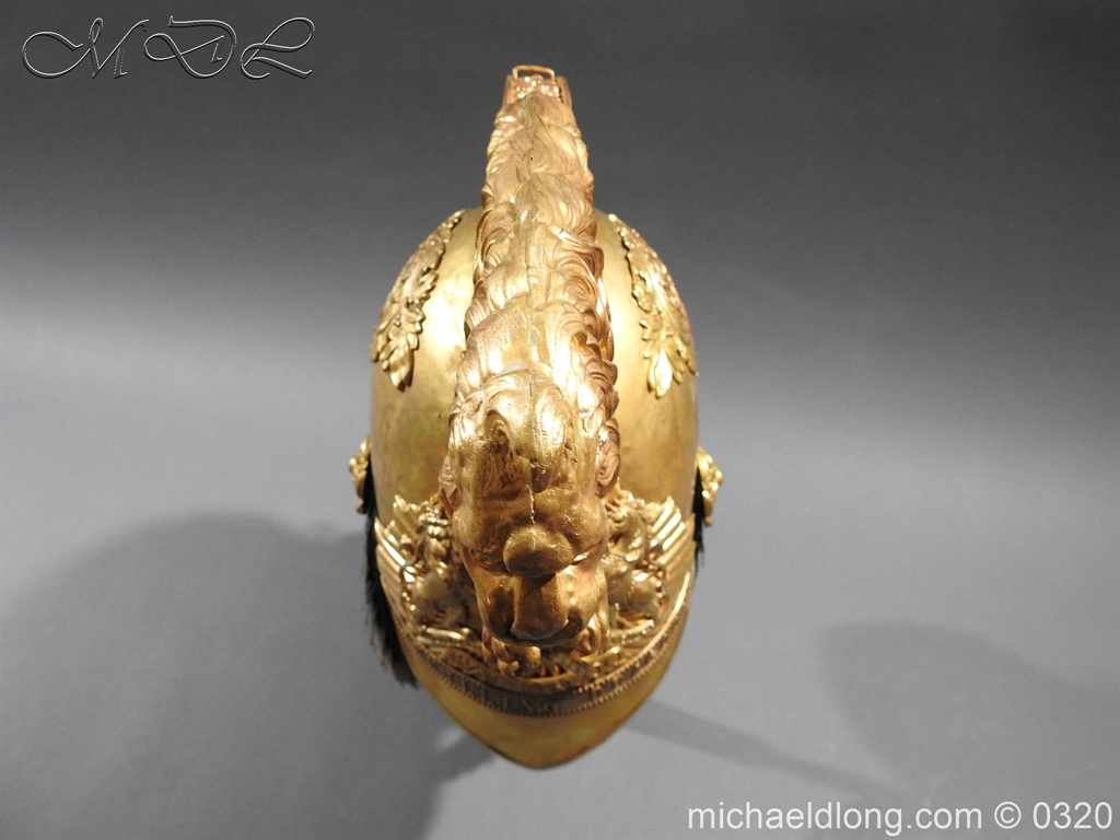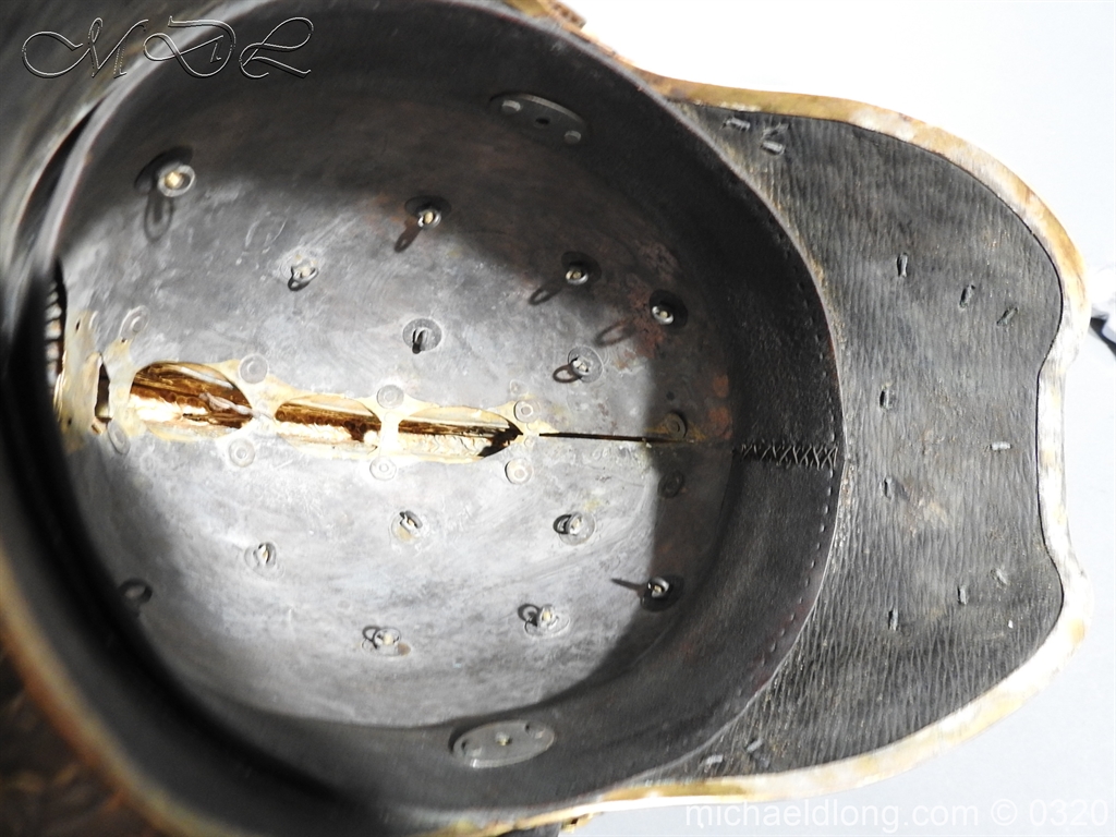 Inniskilling Dragoons Officer’s 1834 Pattern Helmet with gilt copper helmet with tall crest moulded with oak branches and with leaping lion terminal sides of skull with floral scroll panels front plate with the Royal arms and regimental battle honours Peninsula and Waterloo above a beaded band at the lower rim embossed Inniskilling Dragoons. Leather-backed gilt brass chin scales embossed with oak branches. Blossom-form rosettes. Front peak lined in green leather, the rear with brown. No internal lining and what looks to be an age repair behind the badge to the body of the helmet please see image plus age stuff and contact marks to skull.