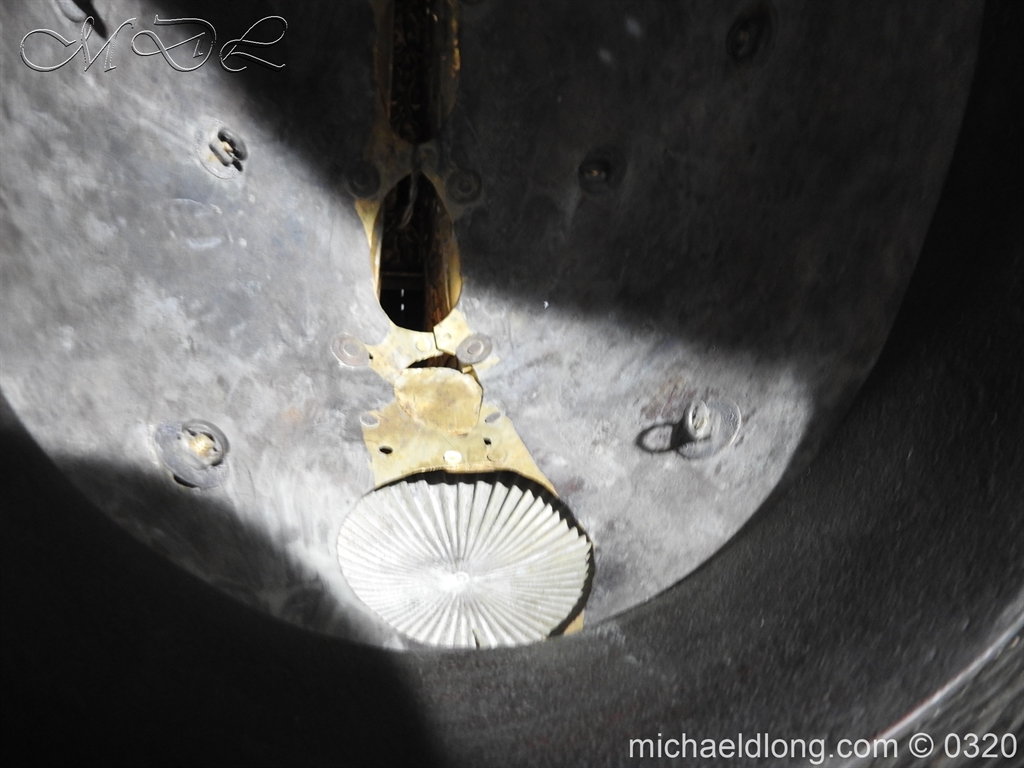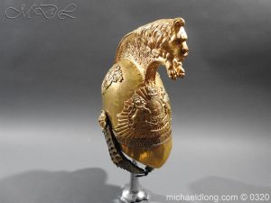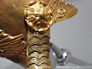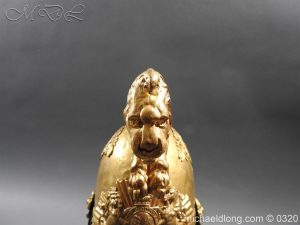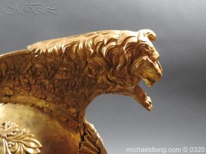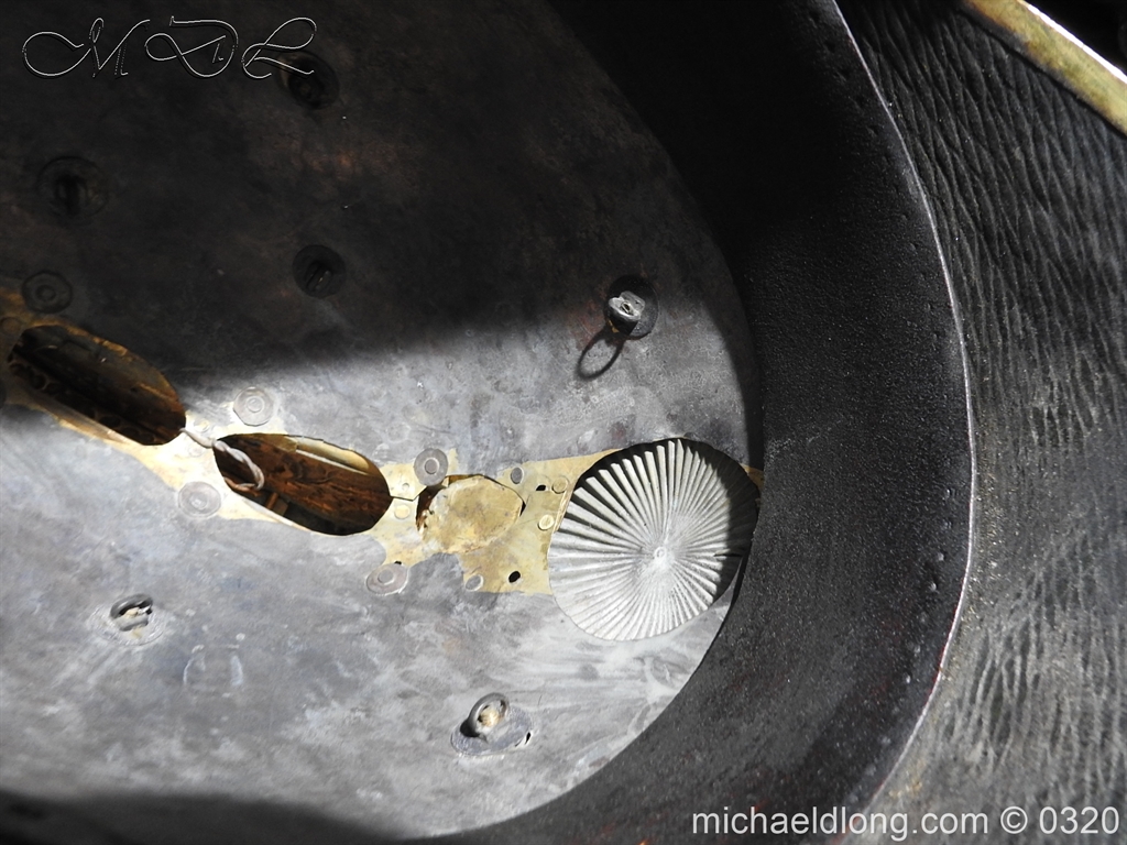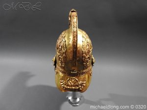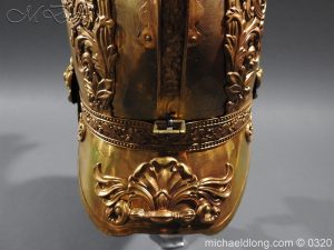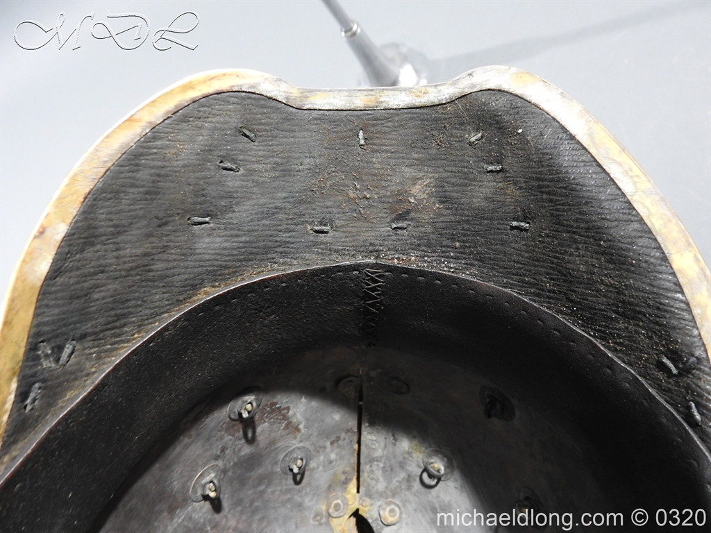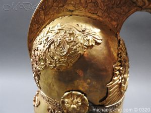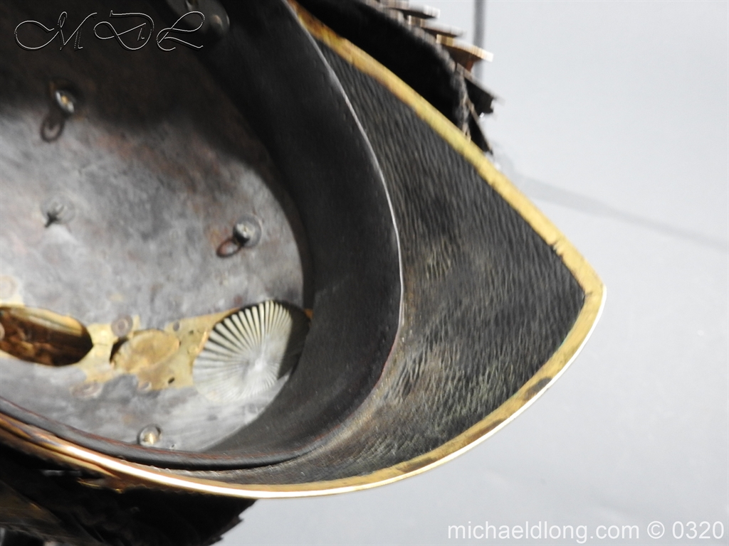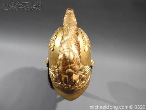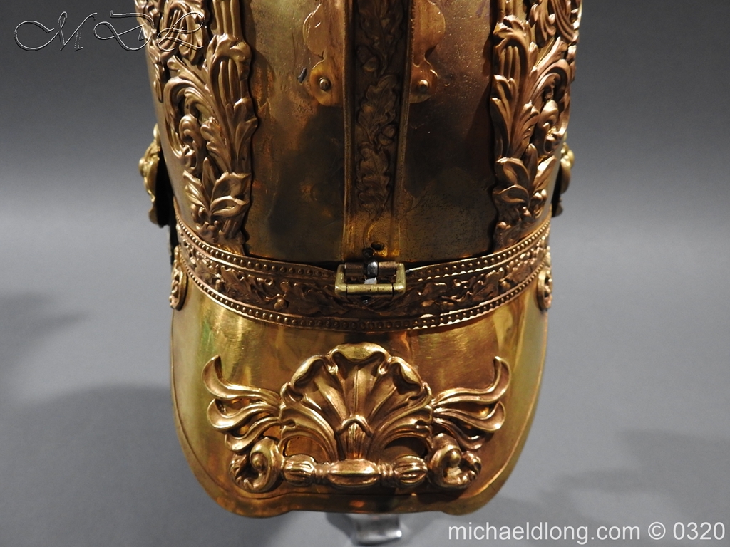 Inniskilling Dragoons Officer’s 1834 Pattern Helmet with gilt copper helmet with tall crest moulded with oak branches and with leaping lion terminal sides of skull with floral scroll panels front plate with the Royal arms and regimental battle honours Peninsula and Waterloo above a beaded band at the lower rim embossed Inniskilling Dragoons. Leather-backed gilt brass chin scales embossed with oak branches. Blossom-form rosettes. Front peak lined in green leather, the rear with brown. No internal lining and what looks to be an age repair behind the badge to the body of the helmet please see image plus age stuff and contact marks to skull.