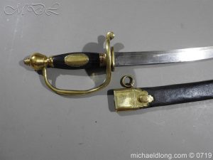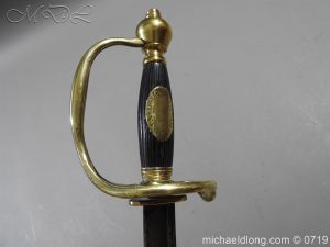 A very rare Walworth Yeomanry sword or hanger in very good condition brass hilt with half shell guard ebony fluted grip with oval brass plate which is engraved Walworth Yeomany. The reverse is numbered 7 Curved single edge blade with small top fuller 60cm in length complete with leather period scabbard with brass fittings hanging ring and frog stud. Notes: The Walworth Yeomanry was a unit of 18 to 20 men from Londonderry. Walworth is just outside Limavady in Ballykelly and used to belong to the ancient guild of the Fishmongers the most famous City fishmonger is Sir William Walworth