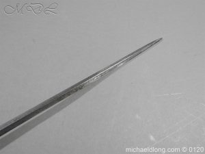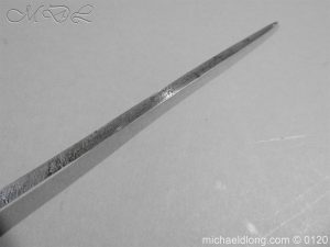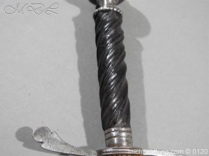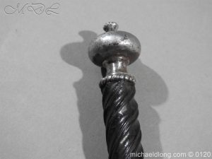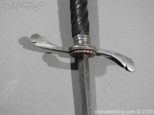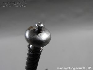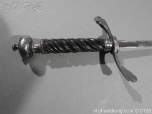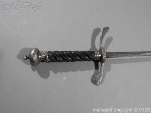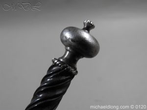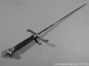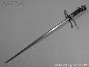 Iron hilt dome pommel with turned ebony grip and decorative tang button. Flatted cross guard sweeping up and down with fine triangular blade 17th century no visible markings. Overall length 40cm the blade 28cm