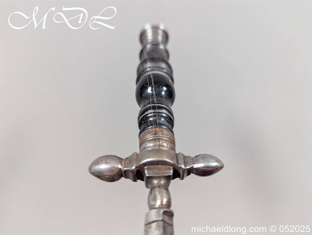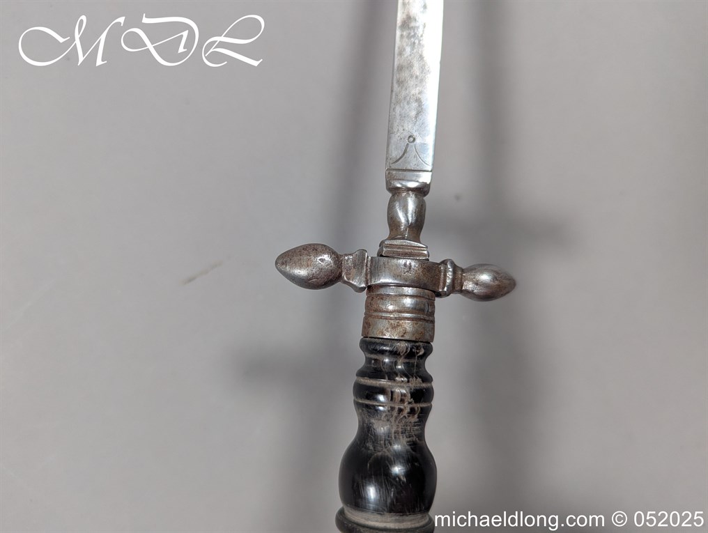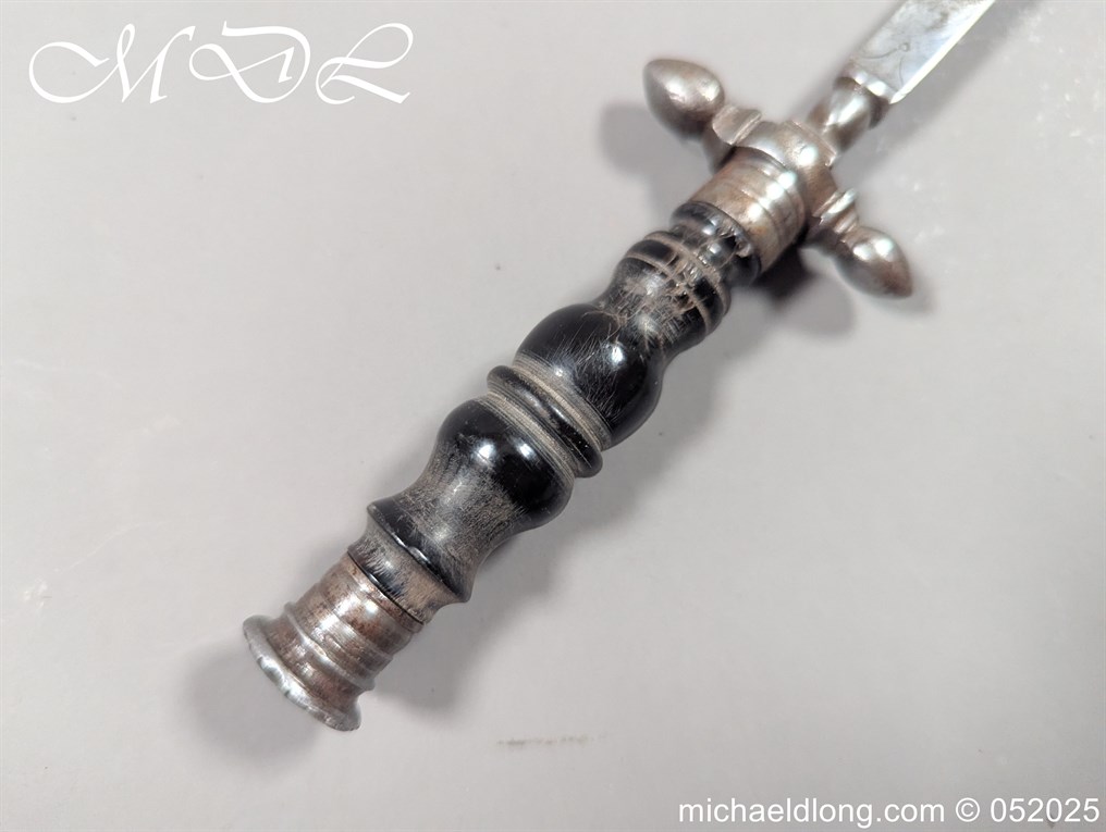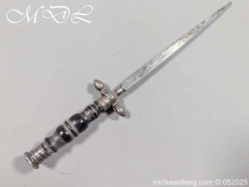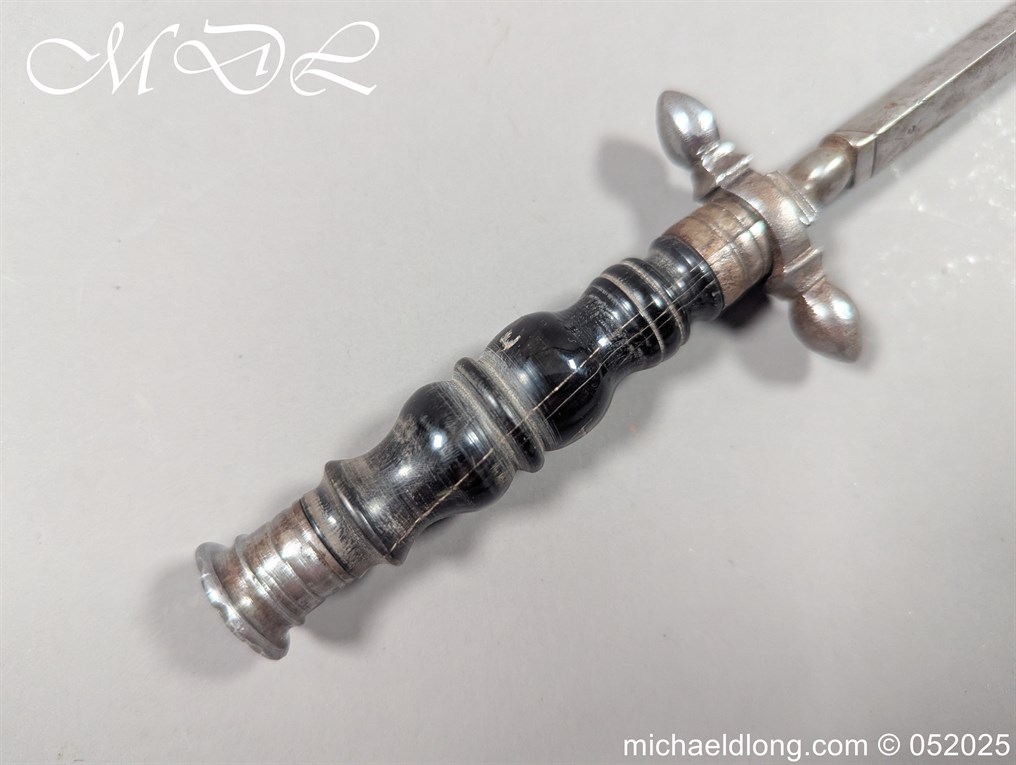 Italian Stiletto Dagger 17th century with 7.5 inch tapered triangular blade, turned black horn grip with decorative flat pommel secured by matching bands top and bottom. Small cross guard with bud shape finials, well balanced in the hand over all length 11.5 inches