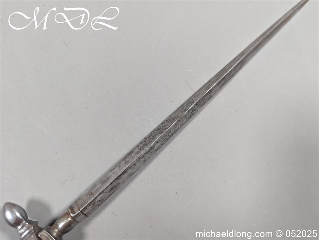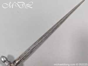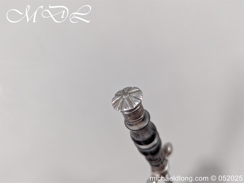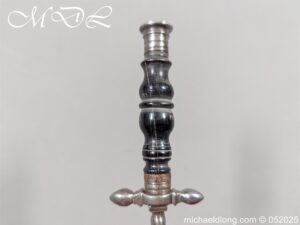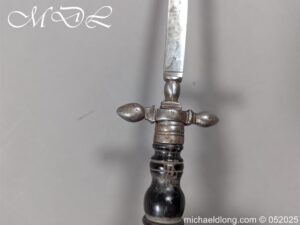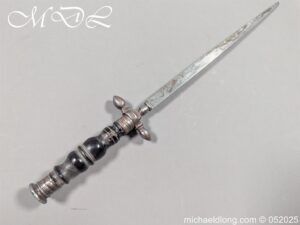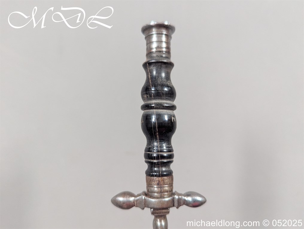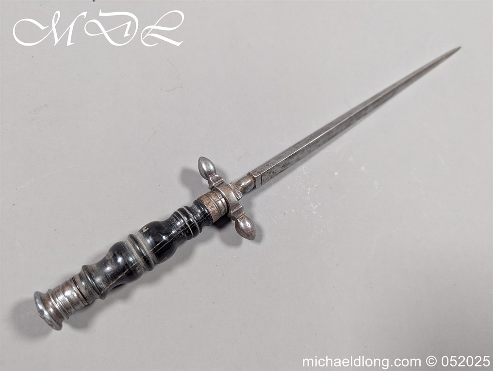 Italian Stiletto Dagger 17th century with 7.5 inch tapered triangular blade, turned black horn grip with decorative flat pommel secured by matching bands top and bottom. Small cross guard with bud shape finials, well balanced in the hand over all length 11.5 inches