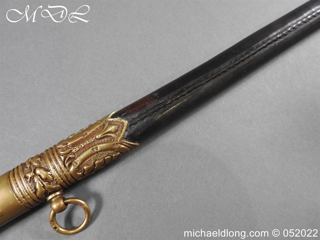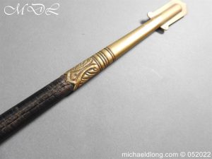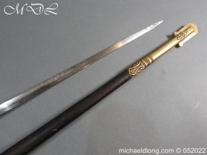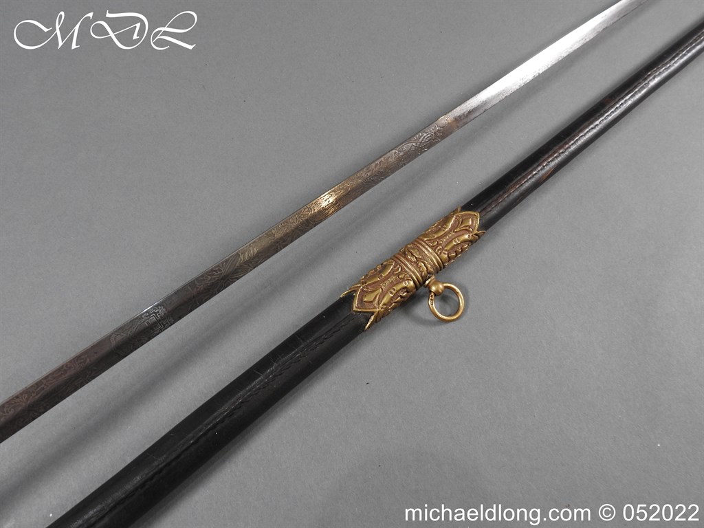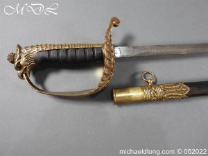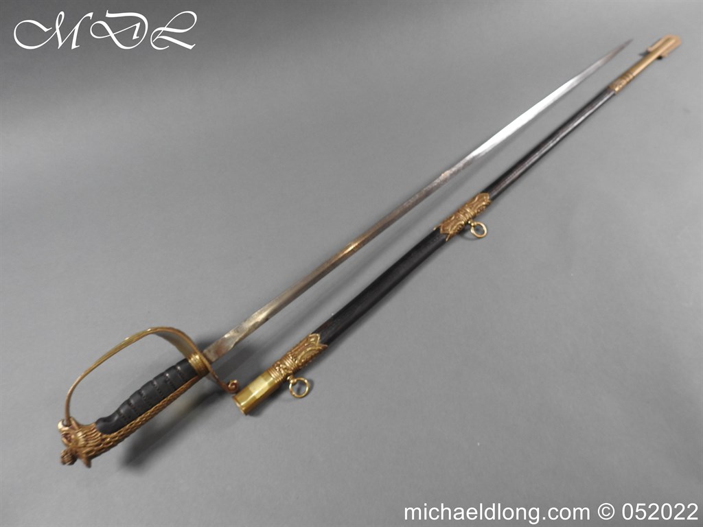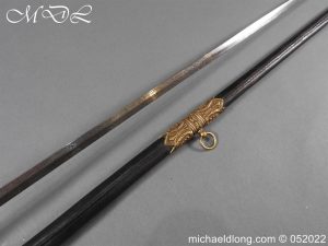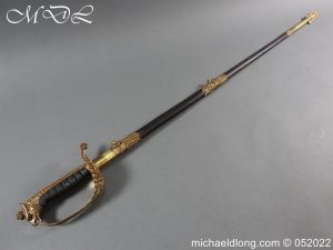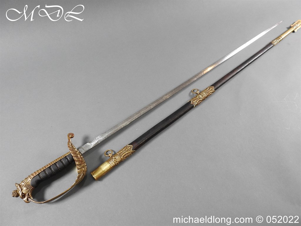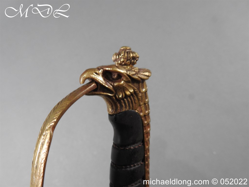 Italian WW 2 Air Force dress sword. One-piece gilt feathered back strap/crowned eagle head pommel. Age toned gilt guard with relief feathering. Wire wrapped black wood grip. Blade is etched with the House of Savoy shield, military motifs and floral work. Solid black leather scabbard with embossed floral mounts