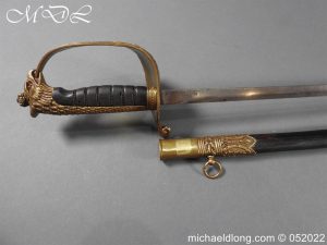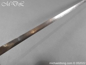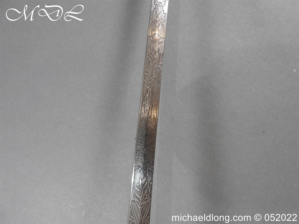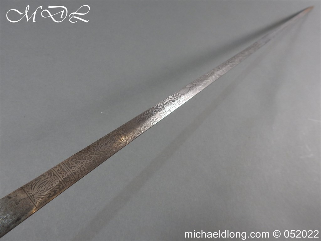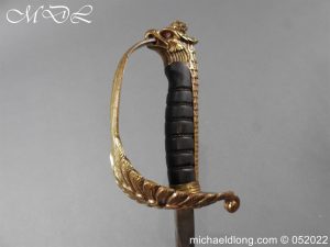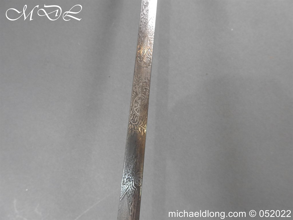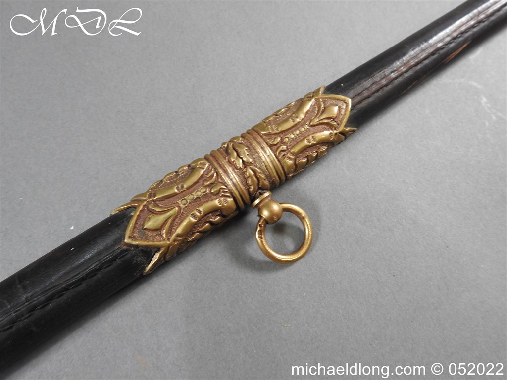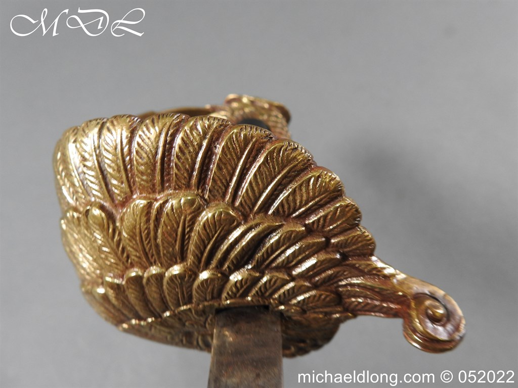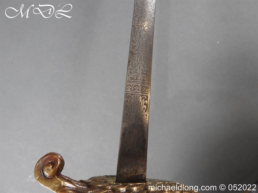 Italian WW 2 Air Force dress sword. One-piece gilt feathered back strap/crowned eagle head pommel. Age toned gilt guard with relief feathering. Wire wrapped black wood grip. Blade is etched with the House of Savoy shield, military motifs and floral work. Solid black leather scabbard with embossed floral mounts