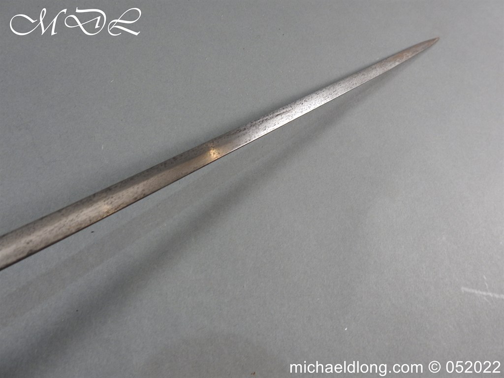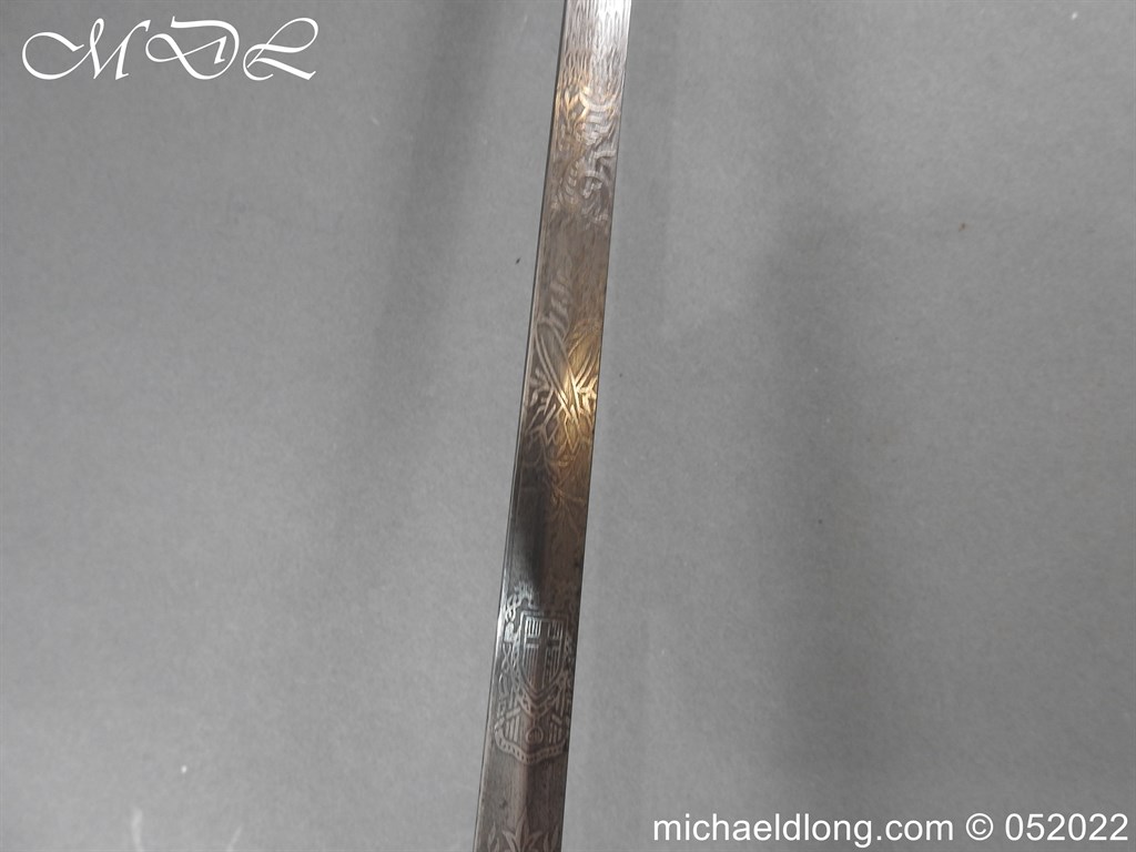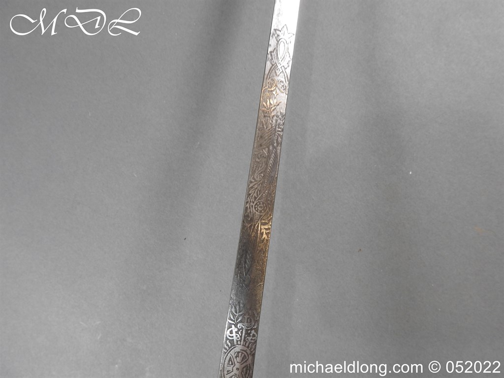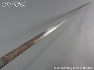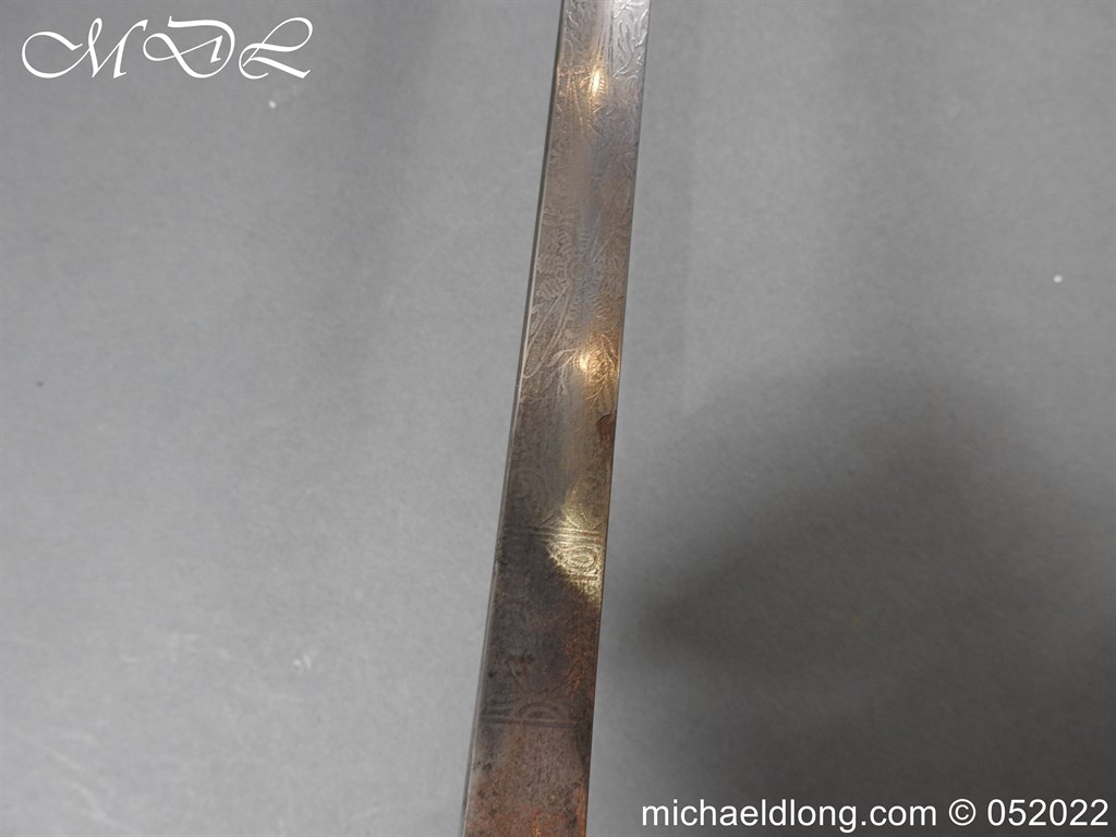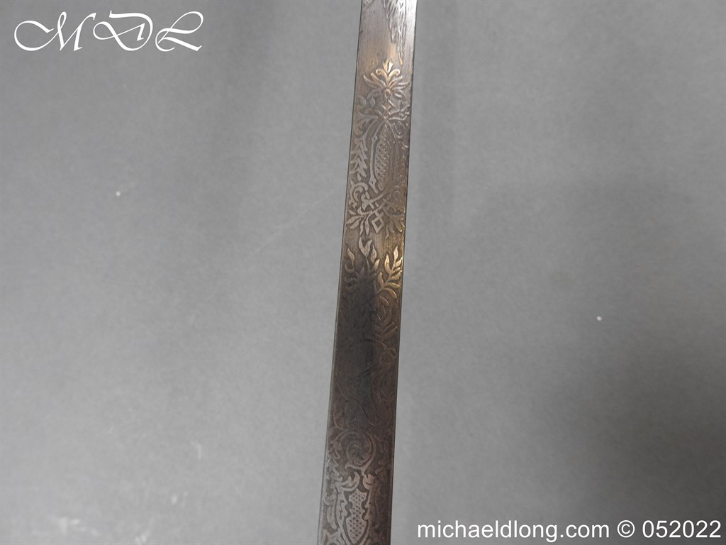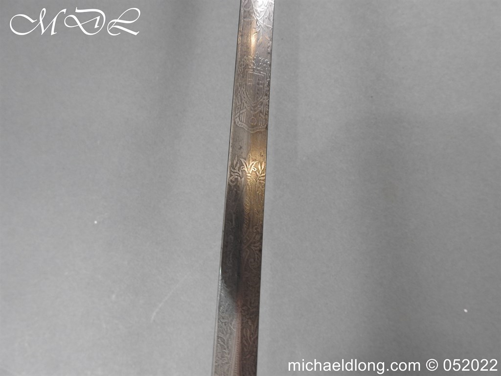 Italian WW 2 Air Force dress sword. One-piece gilt feathered back strap/crowned eagle head pommel. Age toned gilt guard with relief feathering. Wire wrapped black wood grip. Blade is etched with the House of Savoy shield, military motifs and floral work. Solid black leather scabbard with embossed floral mounts