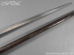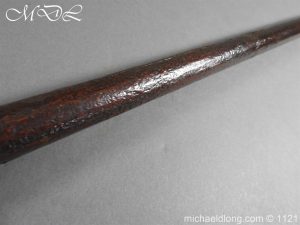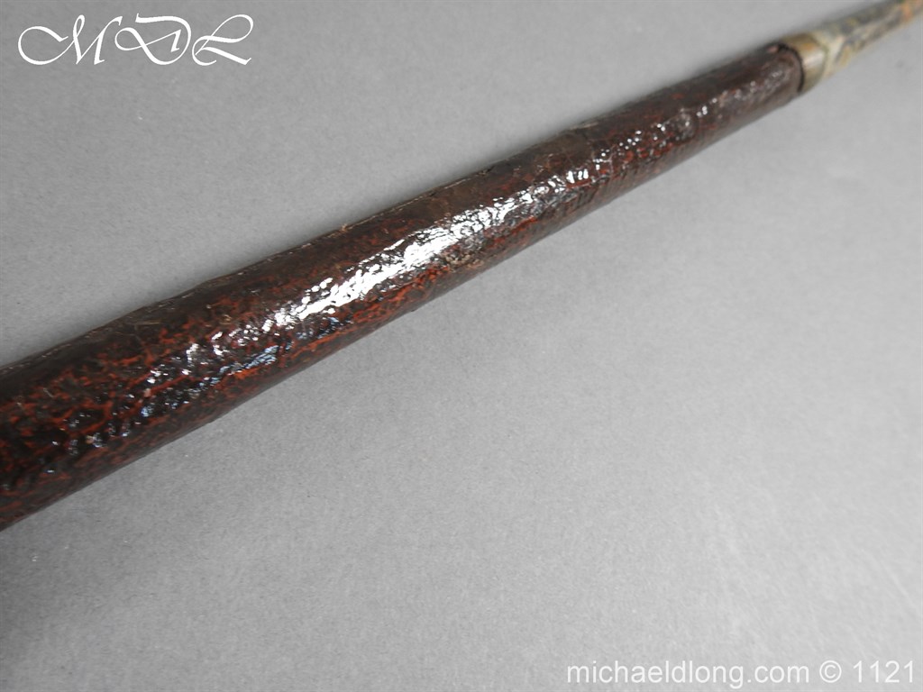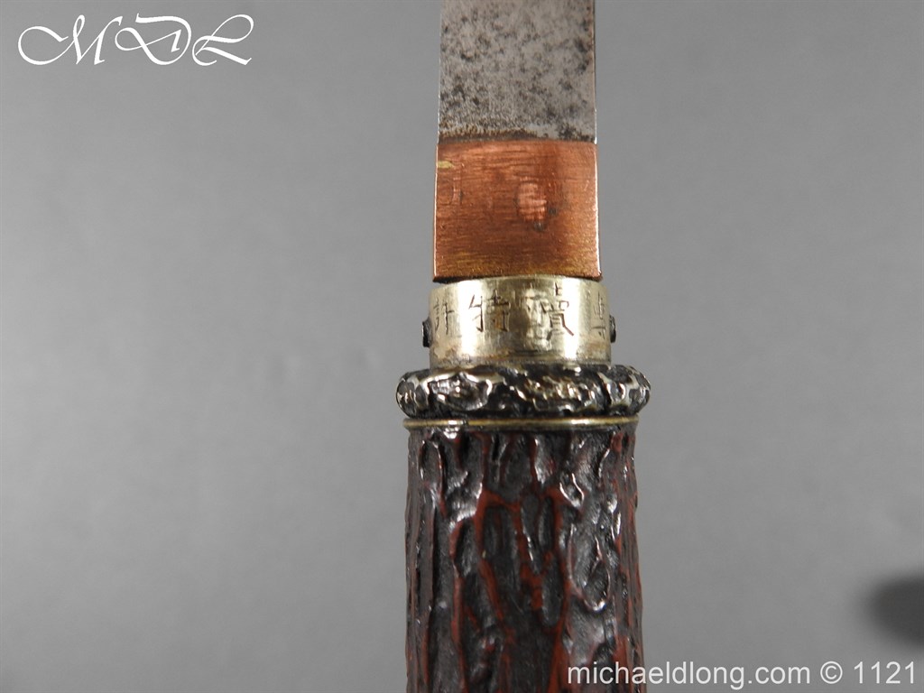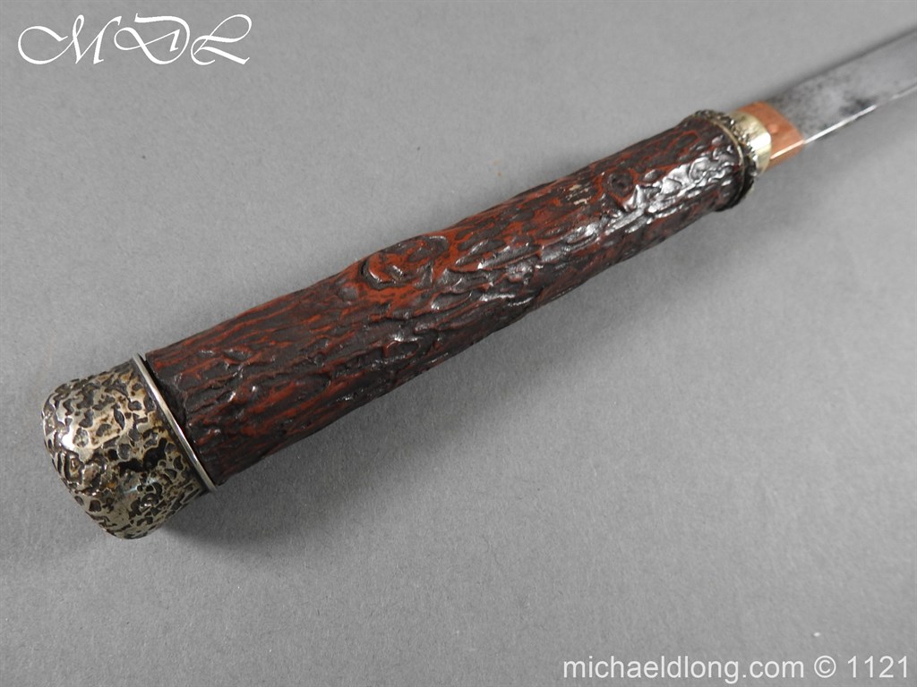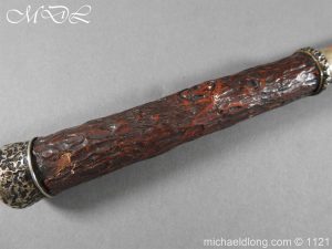 Japanese 19th Century Sword Cane of high quality with silver mounts one being a locking collar to release the blade. The white metal collar which secures the blade engrave with what I assume are the makers details as on the tang of a sword. The grip and sheath wood bark effect and complete with white metal base. Offer all length 34.5 inches the blade 18 inches