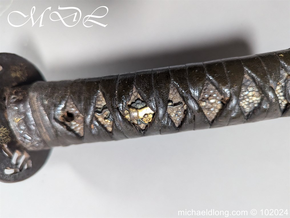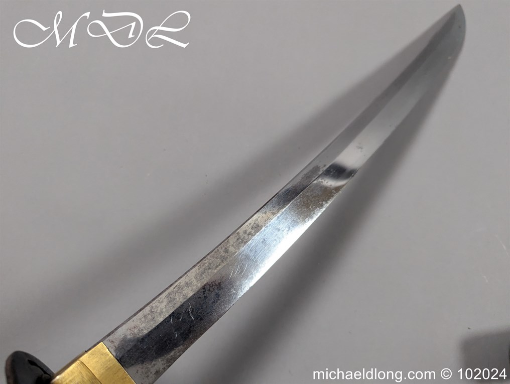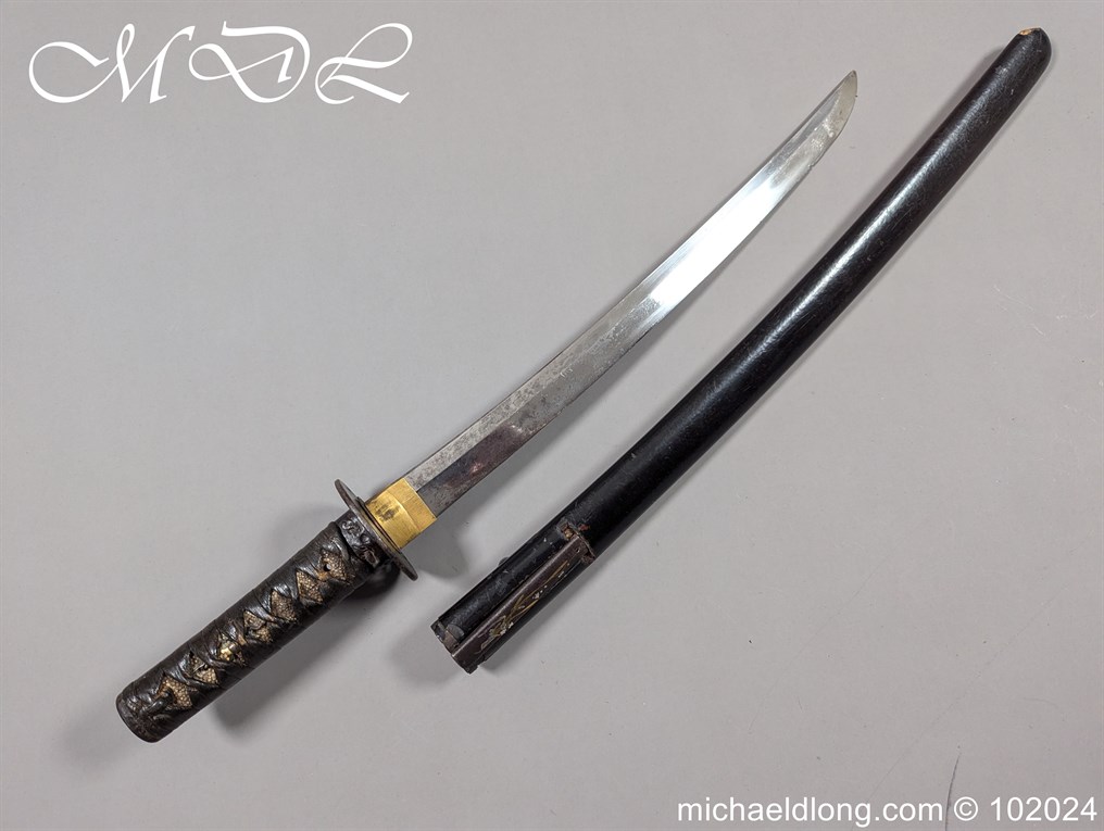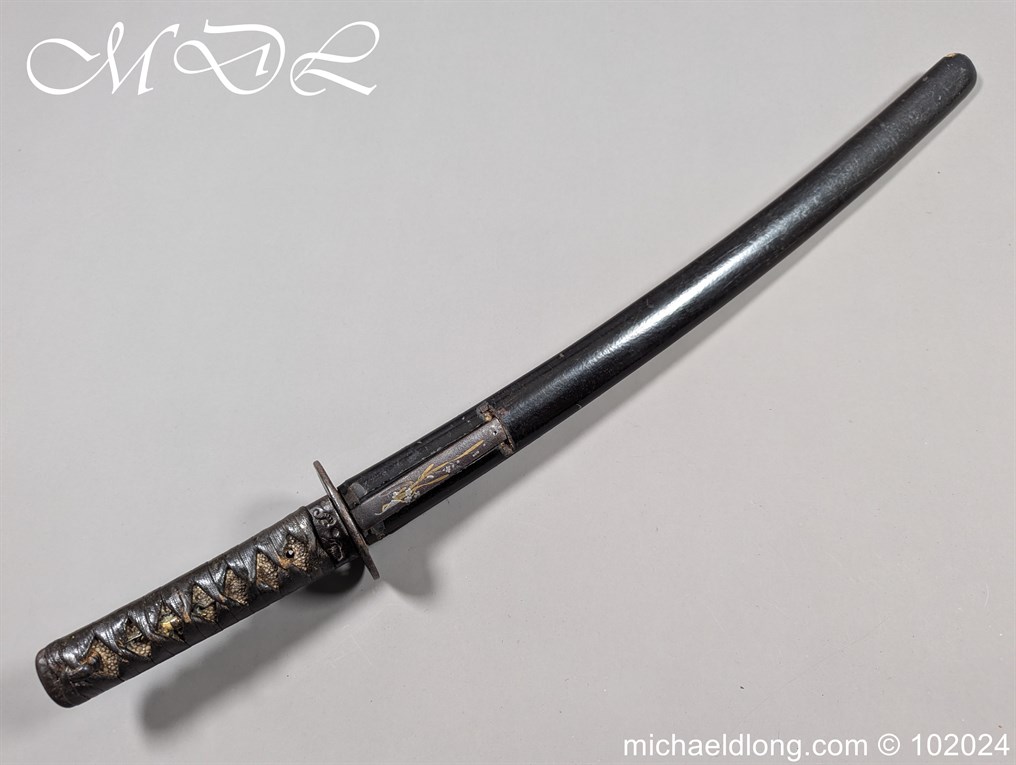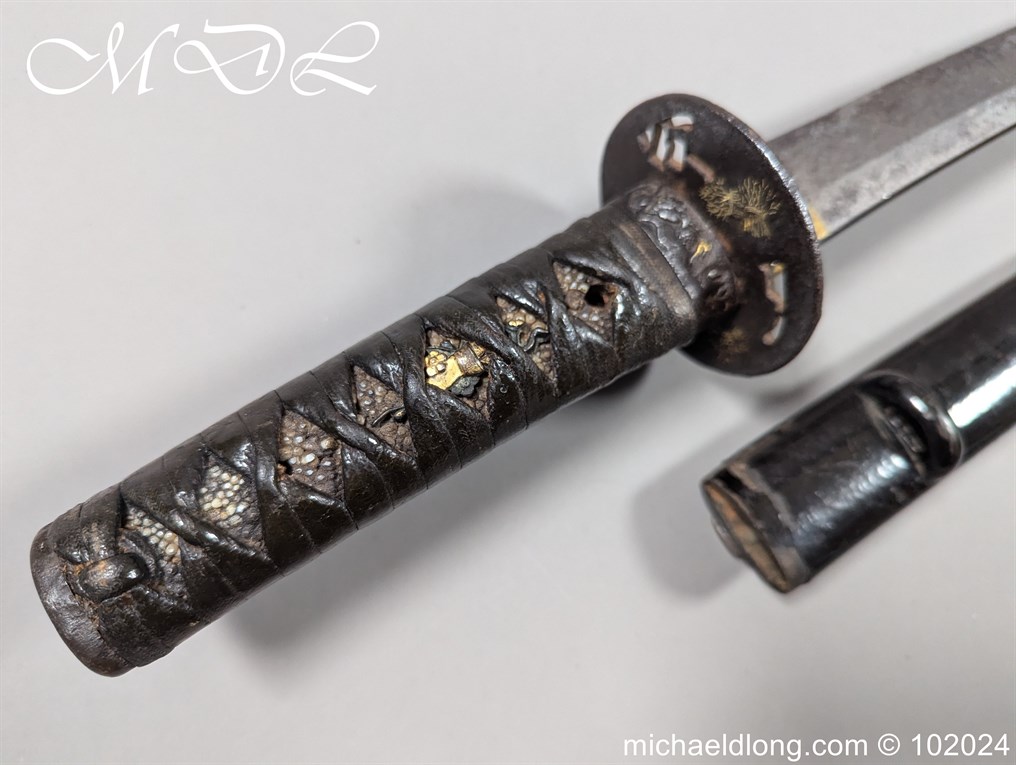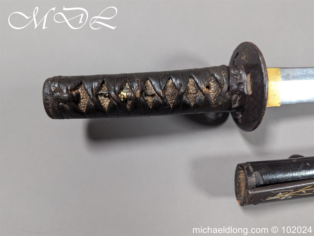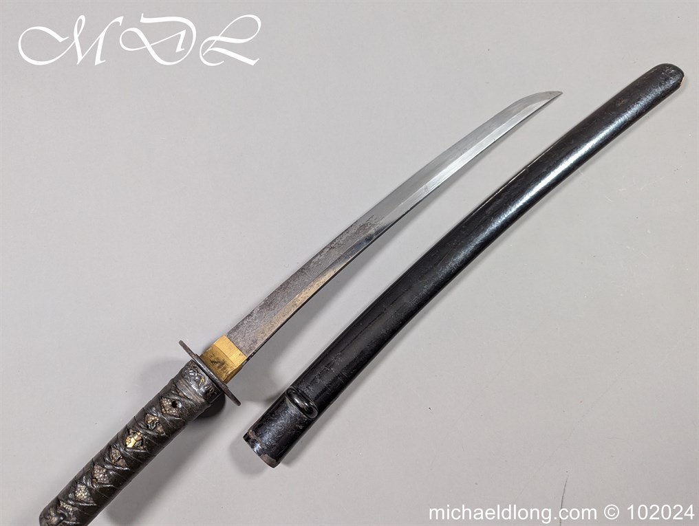 Japanese 19th Century Wakizashi age wear single hole tang unsigned, good darken matching fittings. In need of some refurbishment please see images complete with scabbard overall length 60cm the blade 43cm