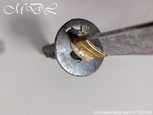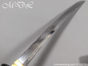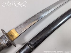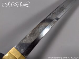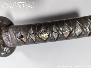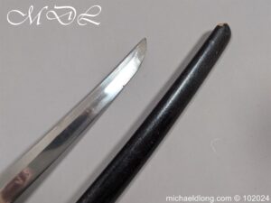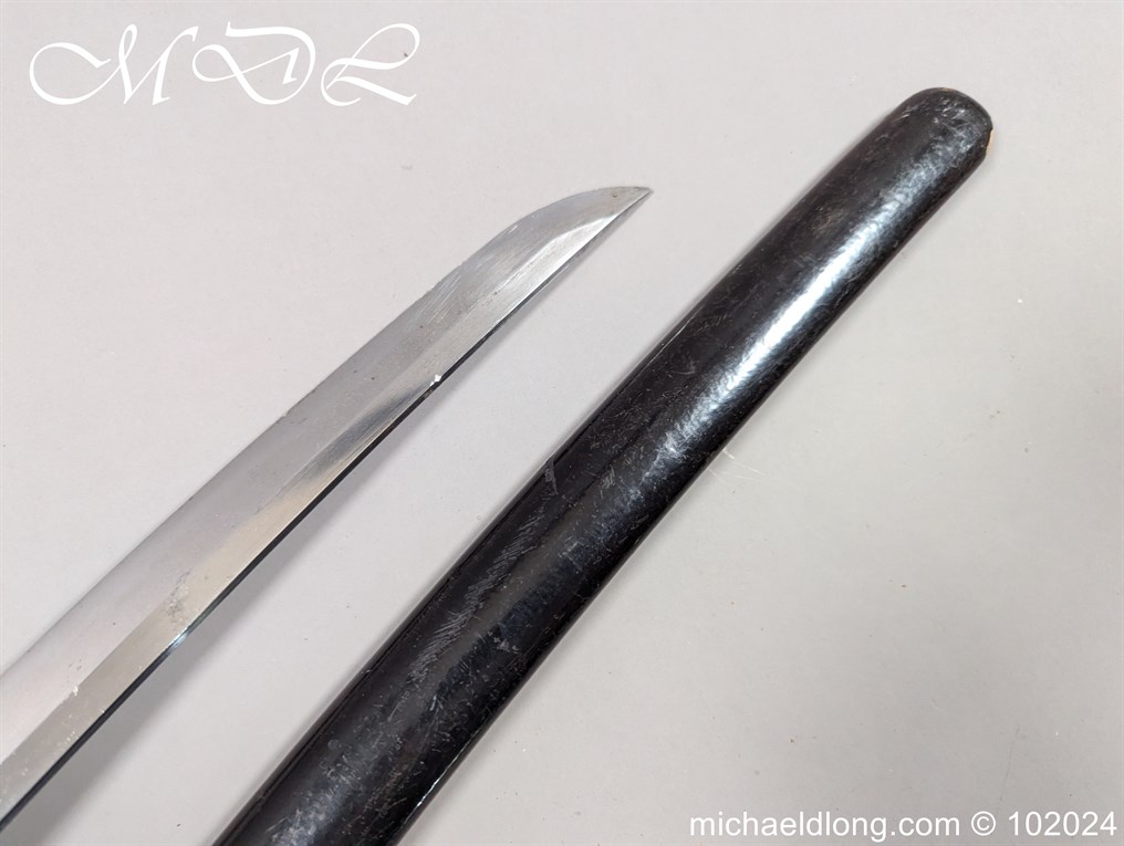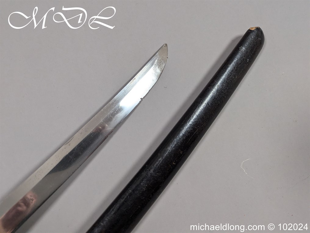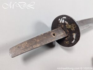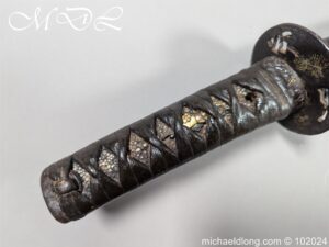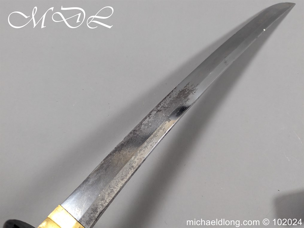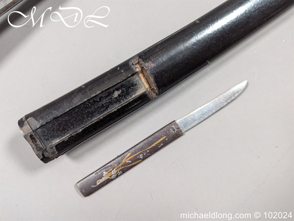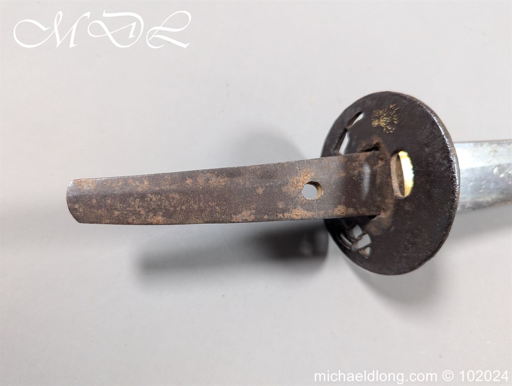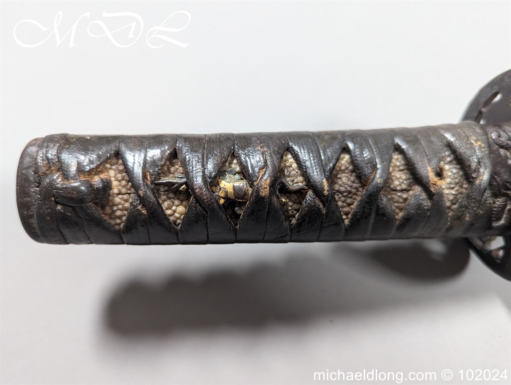 Japanese 19th Century Wakizashi age wear single hole tang unsigned, good darken matching fittings. In need of some refurbishment please see images complete with scabbard overall length 60cm the blade 43cm