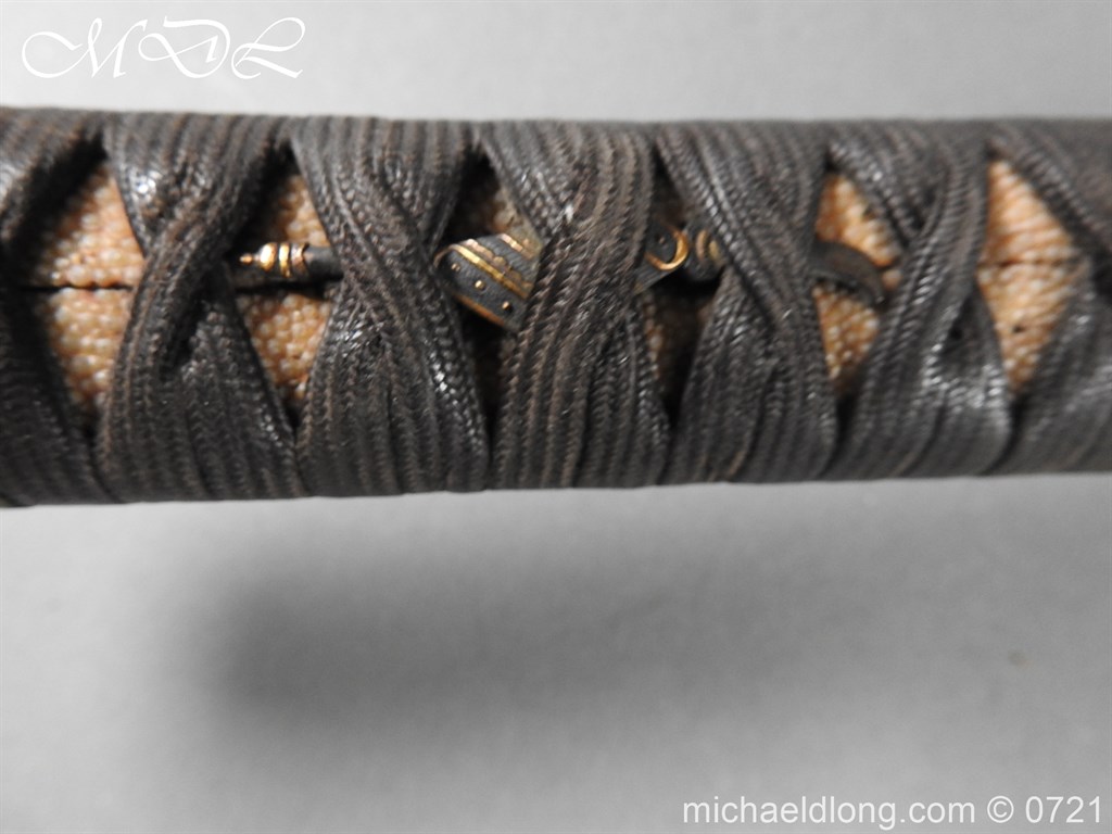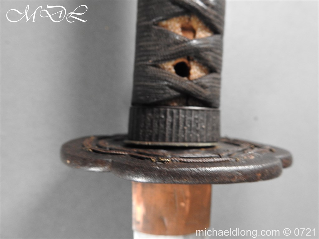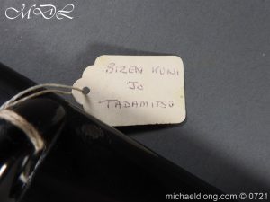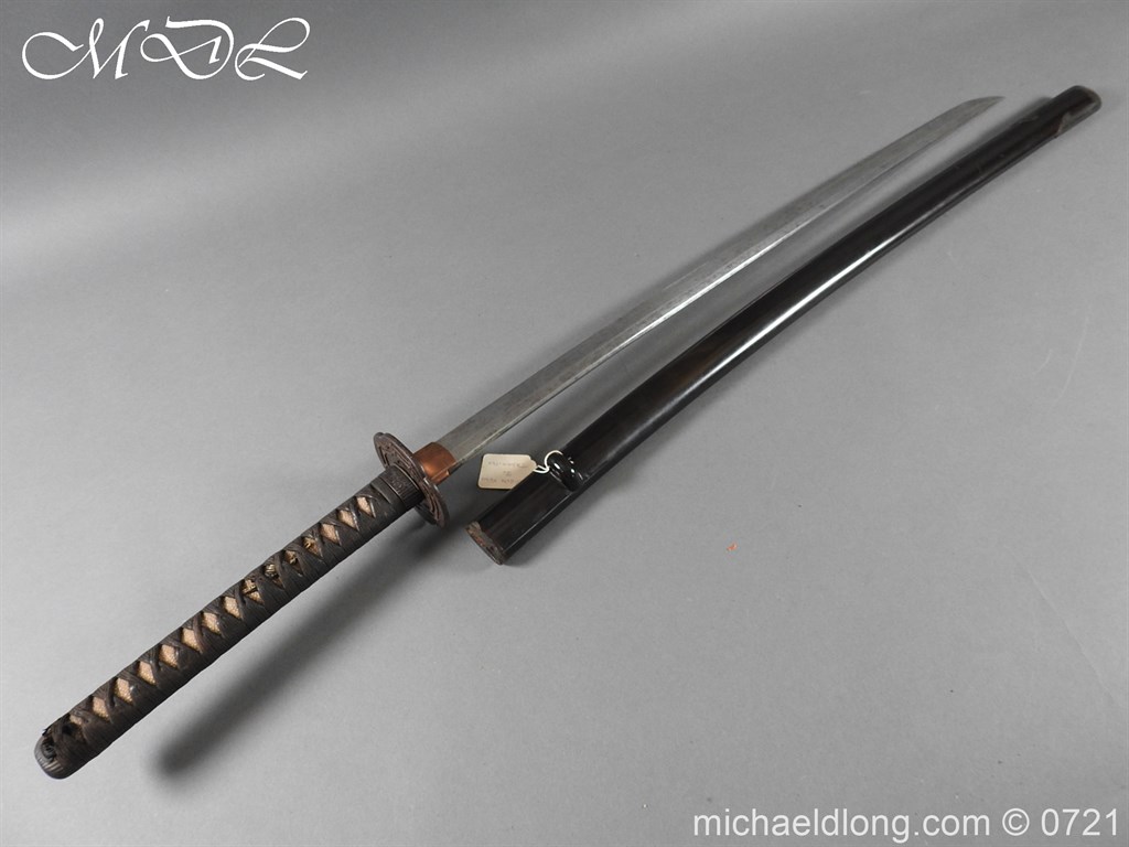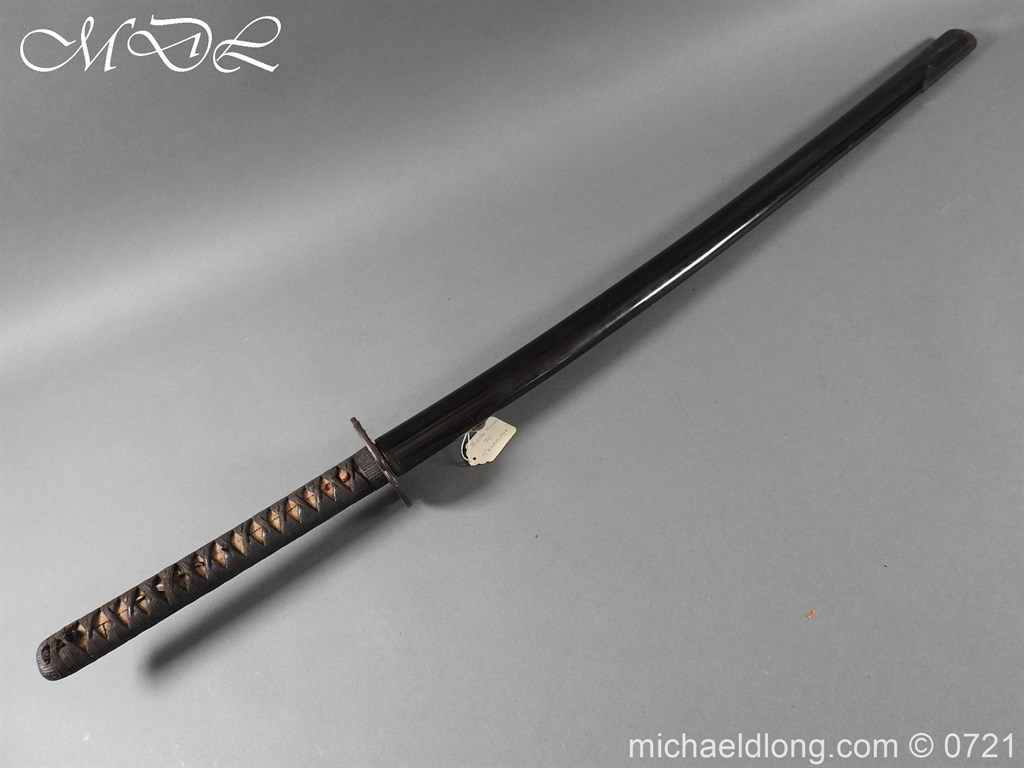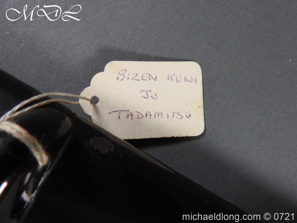 Japanese sword with good matching iron mounts, well bound hilt. The slightly curved 28 inch blade in need of polish tang not signed single hole but tag attached stating maker as Bizen Kuni Ju Tadamitsu complete with black lacquered scabbard