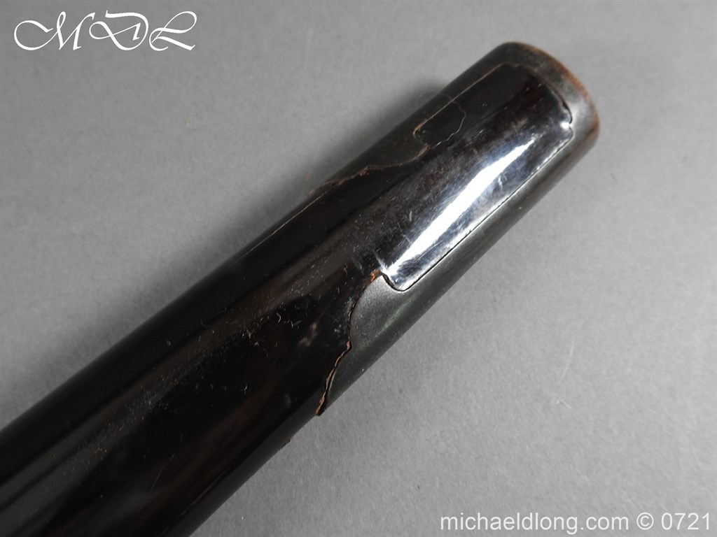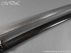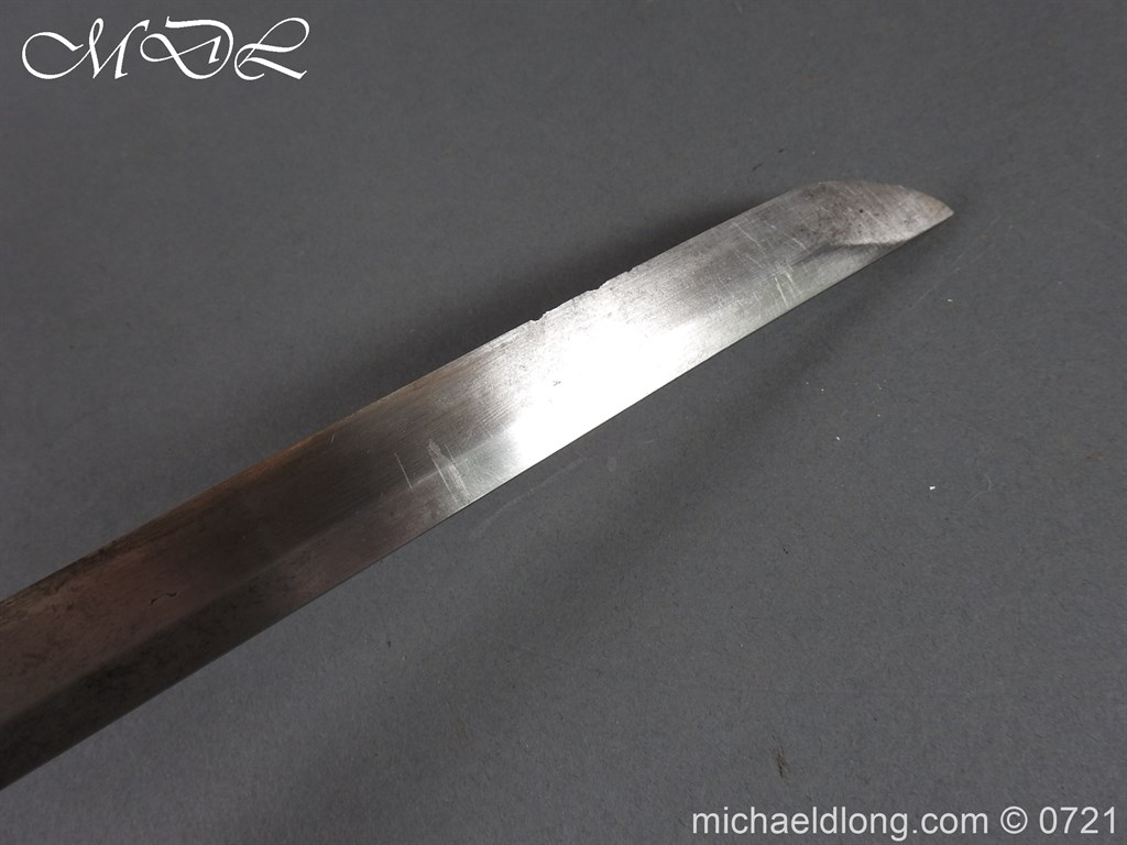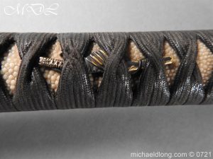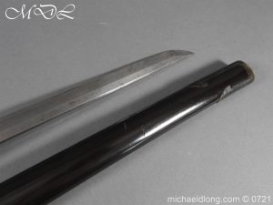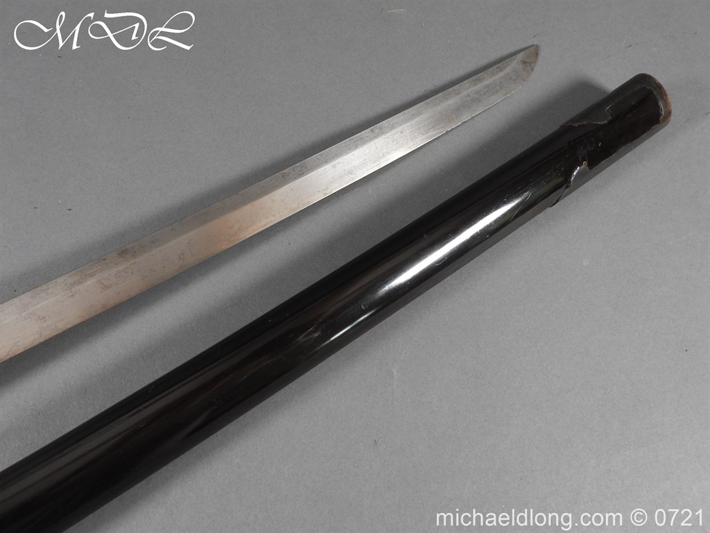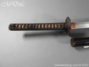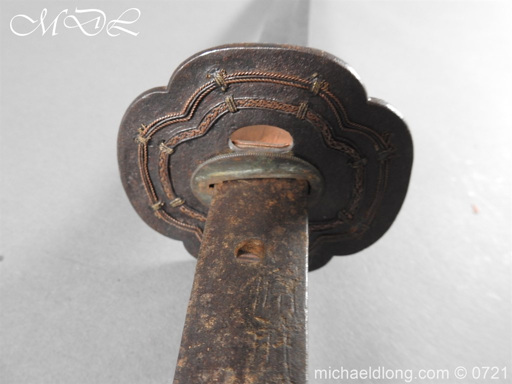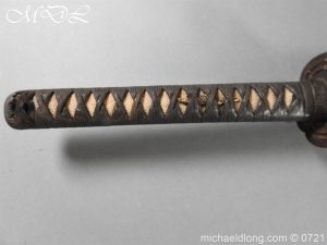 Japanese sword with good matching iron mounts, well bound hilt. The slightly curved 28 inch blade in need of polish tang not signed single hole but tag attached stating maker as Bizen Kuni Ju Tadamitsu complete with black lacquered scabbard
