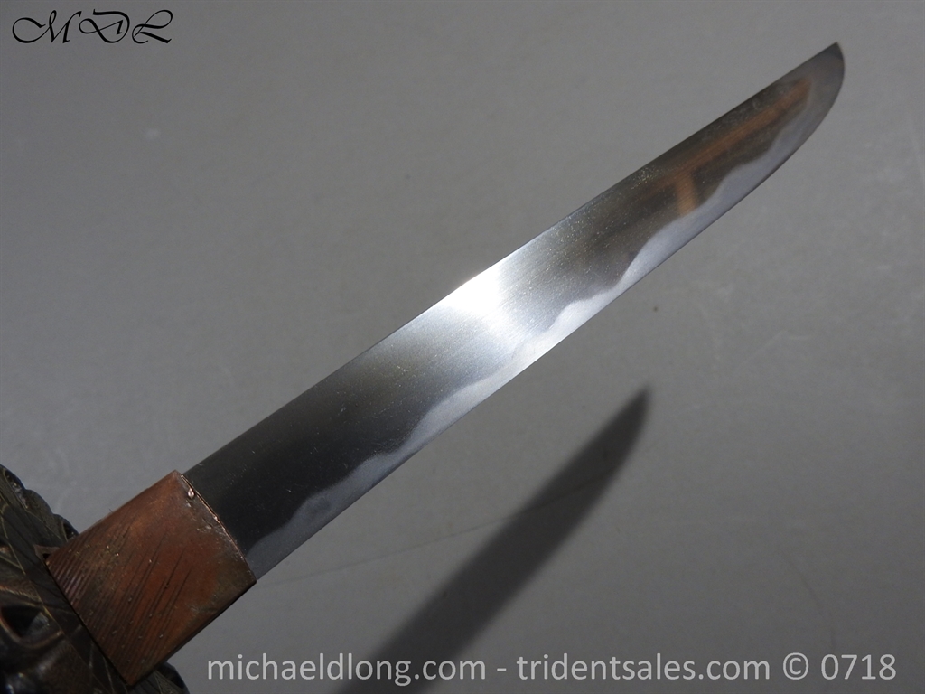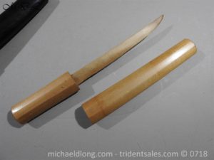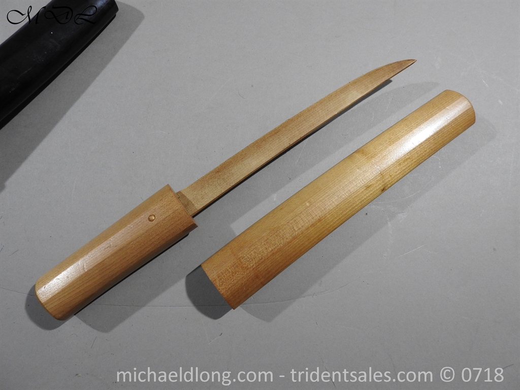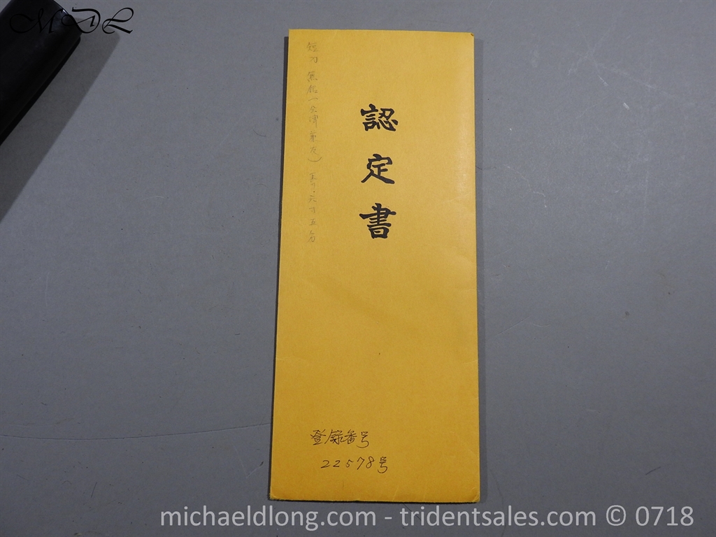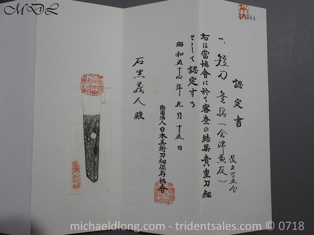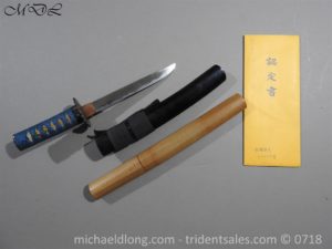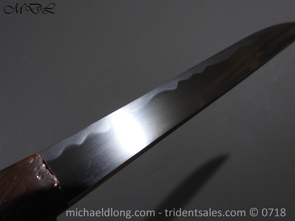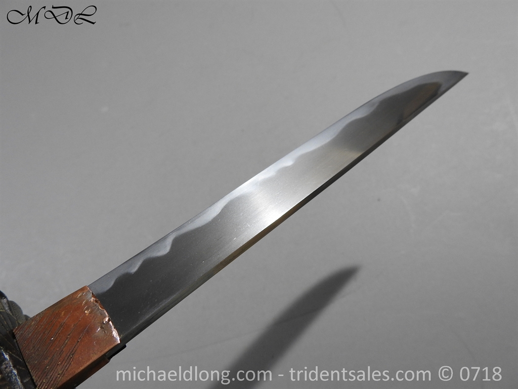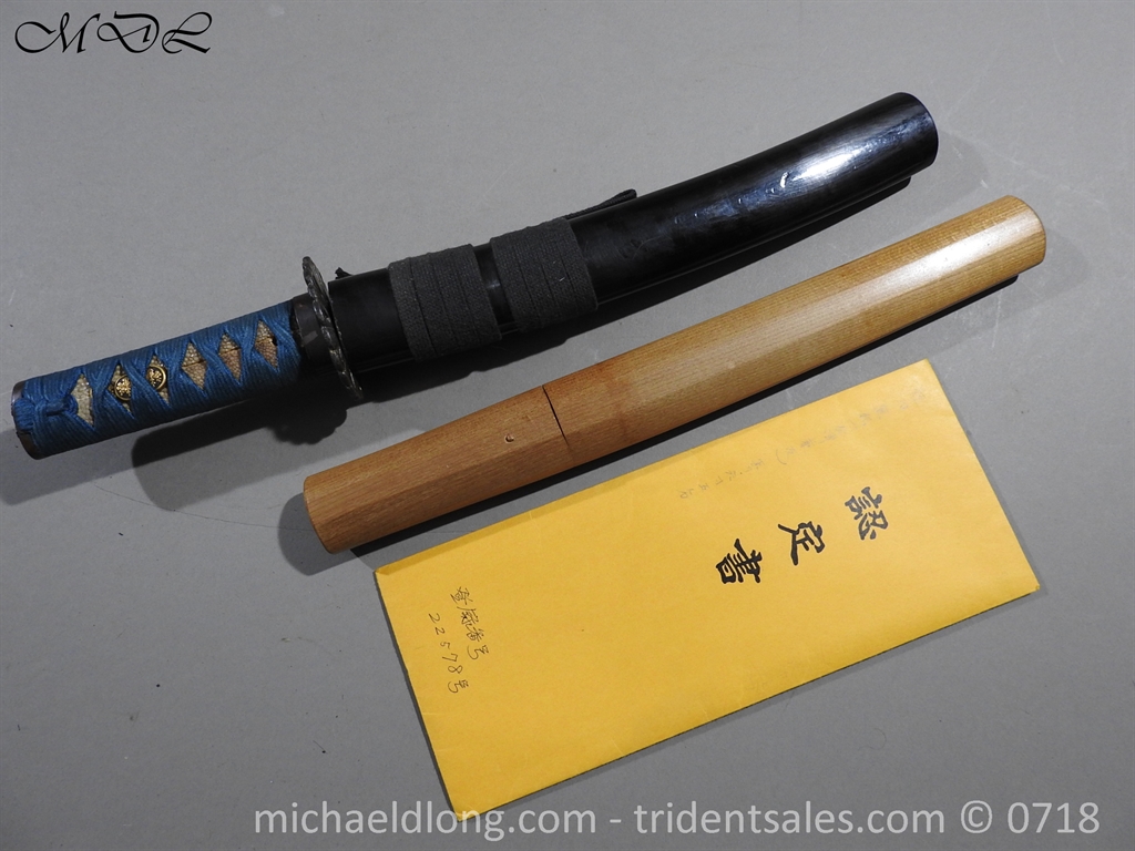 A Japanese tanto c 1865 NBTHK Kicho token papers issued September 1979 unsigned but attributed to Aizu Kanetomo I Mekugi – Ana Copper Habaki, the homon is Gonome – Midare and forging grain is Mokume Hada, super fitting with replcement scabbard and complete with Shira Saya.
