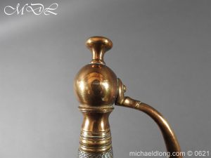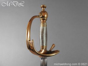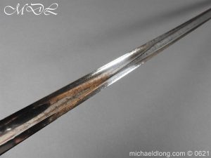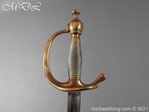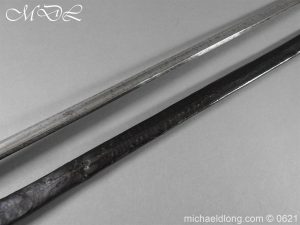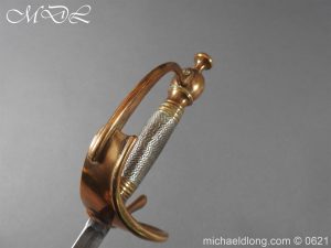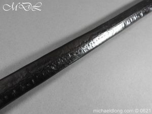 Life Guards Full Dress Officer’s Sword regulation gilt brass boat shell the grip being bound with twisted silver wire and large oval pommel with extended tang button. The blade single edged regulation form. Complete with black leather scabbard with gilt brass locket and chape showing age wear