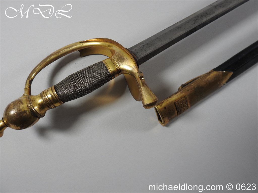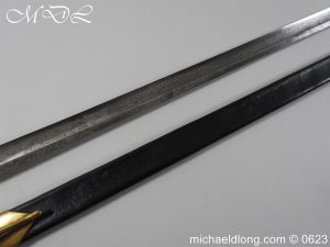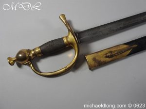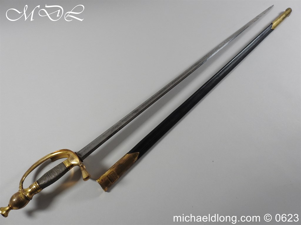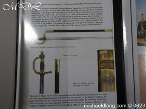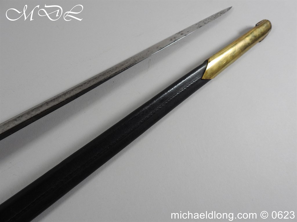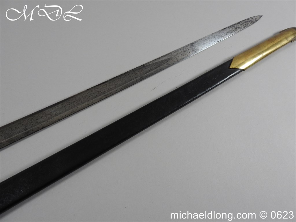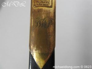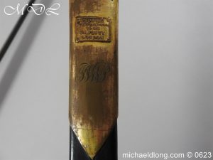 Life Guards Officer’s Full Dress Sword belonging to Joseph John Lakehurst Peyton 1819 – 1844, 89.75cm plain fullered blade, modified regulation copper gilt hilt with wire bound grip, contained in its copper gilt mounted black leather scabbard, the upper mount bearing maker’s tablet and engraved with owners entwined initials in script. Scabbard leather restored. Joseph John Wakehurst Peyton (1819-1844) 2nd Life Guards: Coronet and Sub-Lieutenant (by purchase) 28th April 1836, Lieutenant by Purchase 8th June 1838. This sword is detailed in the book The British Cavalry Sword by Richard Deller plate 20.36 and sold with extensive research
