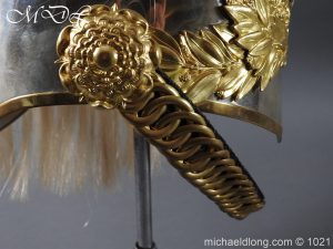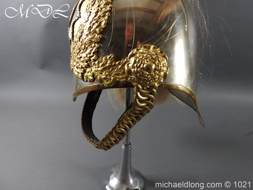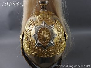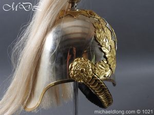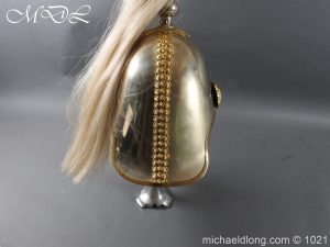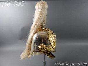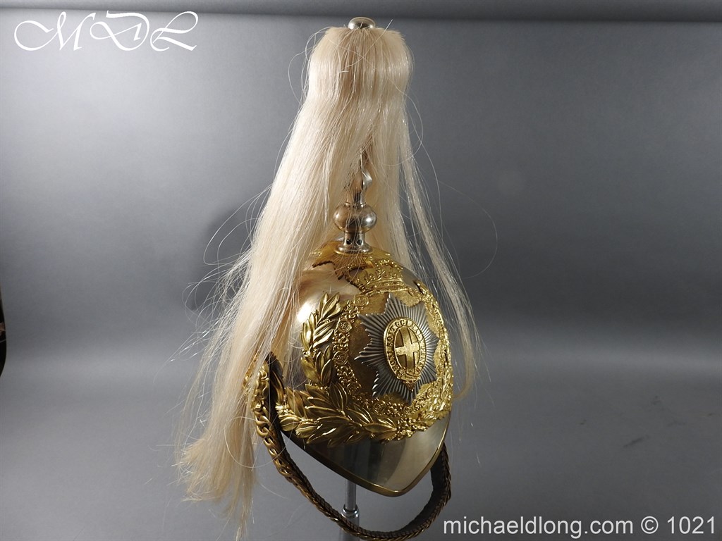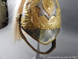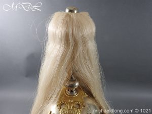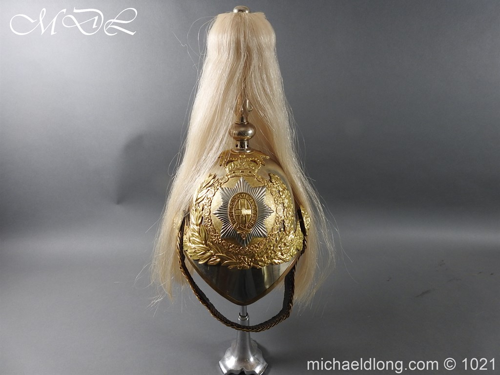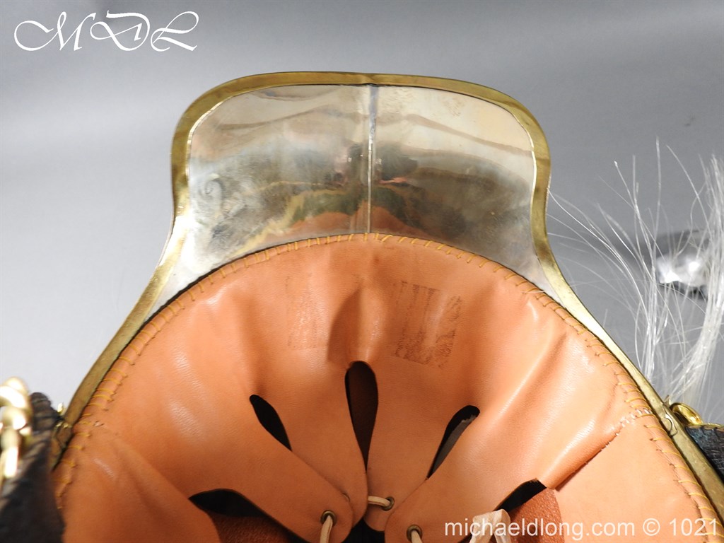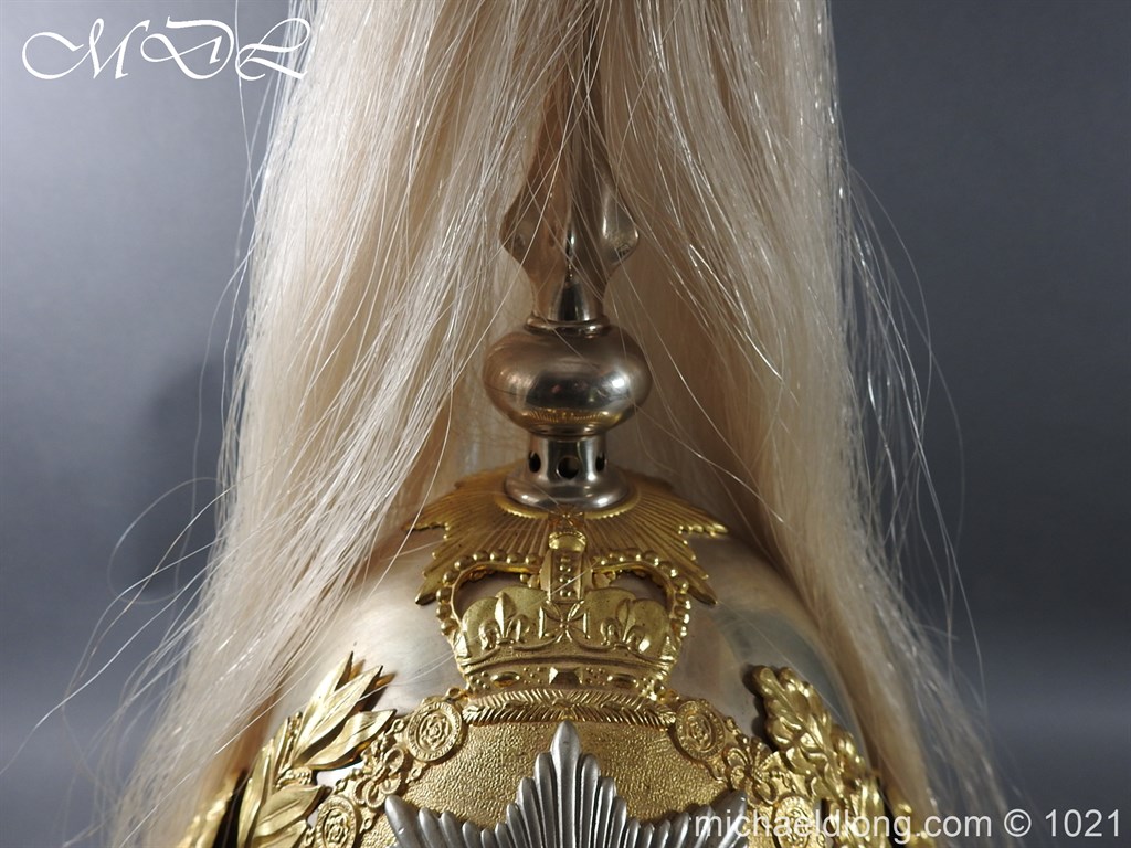 Life Guards Troopers Full Dress Helmet current issue ER 2 Household Cavalry Queens Crown troopers full dress helmet, it has a white metal skull with brass trim, a large Queens crown helmet badge with Star of the Order of the Garter to the centre, it is complete with its white plume, leather backed chin-chain and liner