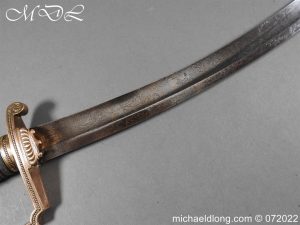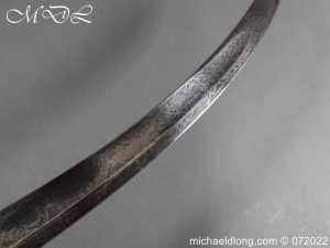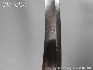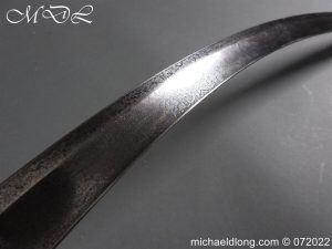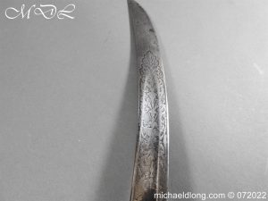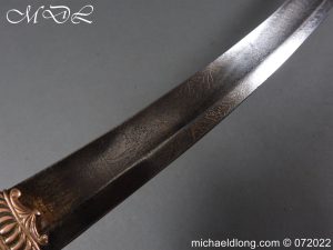 The highly curved  blade etched for it’s full length and maker marked Osborn and Gunby, etched with trophies of arms Royal crown, Royal Coat of arms and winged Victory. No Scabbard overall length 84cm blade 73cm