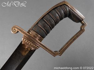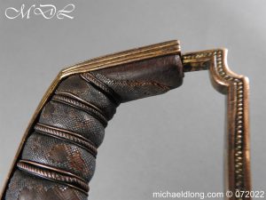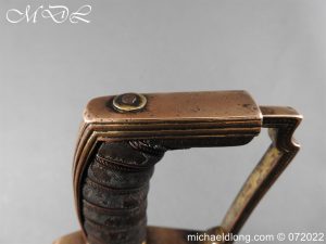 Light Dragoon Sword Officer’s Sword possibly the 24th Light dragoons due to the design of the hilt, please see The British Cavalry sword by R Dellar page 55 for reference. The hilt gilt brass with square extended pommel and fish skin grip, note small amount missing under pommel.
