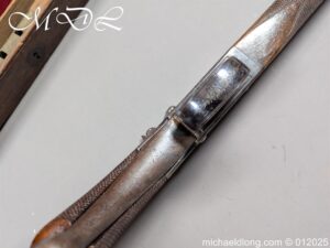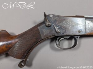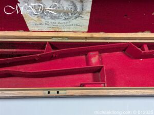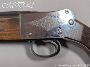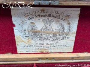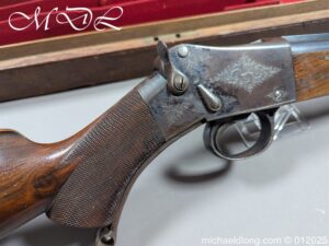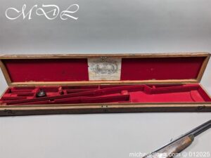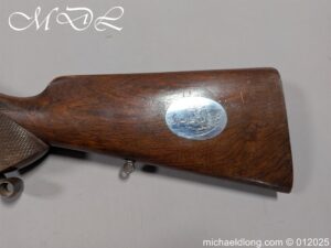 Martini Action .577 / .450 Presentation Sporting Rifle retailed by Wilkinson No 3841 in it’s oak range case complete with correct bullet mould and various other items. 28-inch barrel with full-length file-cut rib, with platinum-lined folding leaf sights and folding ladder rear please note sight bar missing, the frame and loading lever with fine scroll engraving and retaining some original finish, safety catch, the 14 1/4-inch figured stock with pistol grip and steel butt plate, inlaid to each side with a silver plaque bearing a family crest and engraved Presented by Lord Northwick to W. F. Egerton, sling eyes, the stock impressed with the Wilkinson retailer’s number 7861 and Birmingham black powder proof. Tight action and excellent bore not even sure it has ever been fired. Please note this rifle is antique / obsolete calibre so no licence is required within the UK and shipping free, should export shipping be required this will be a cost.
