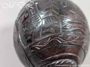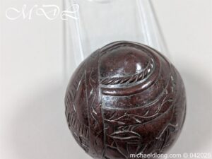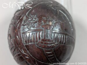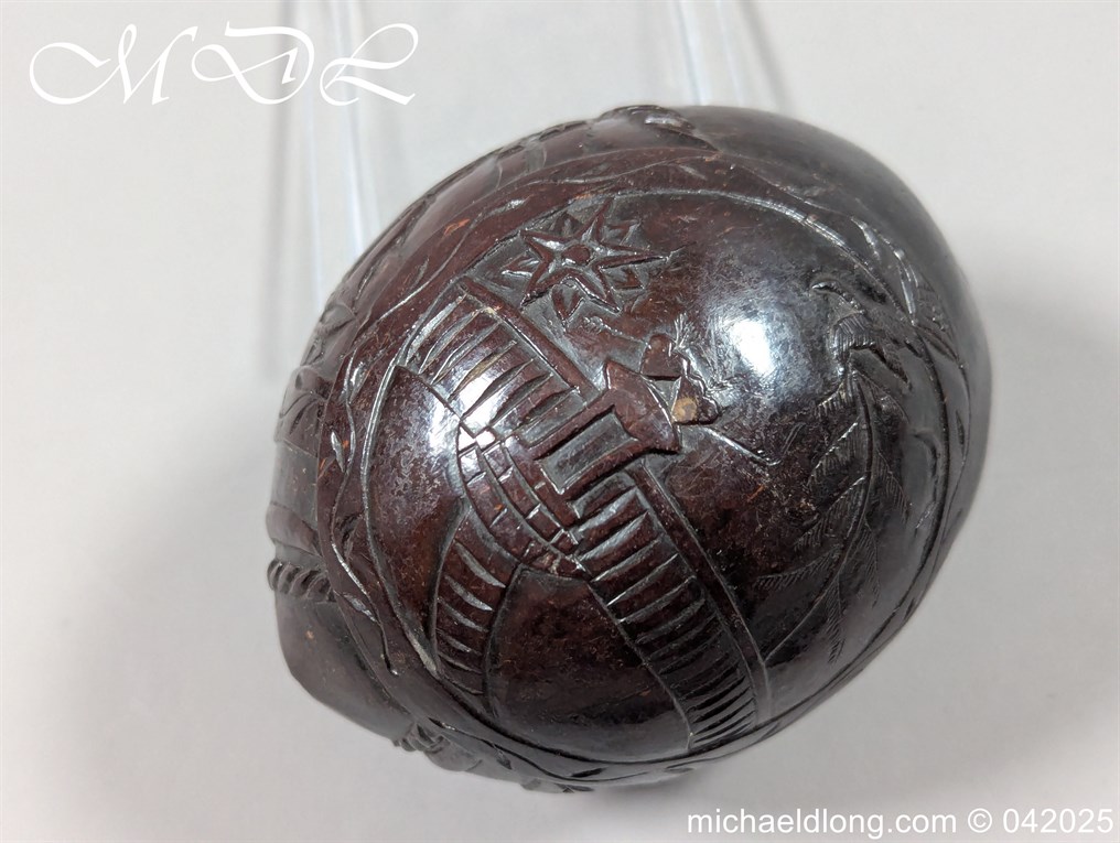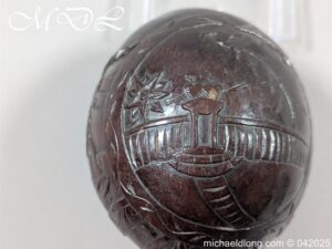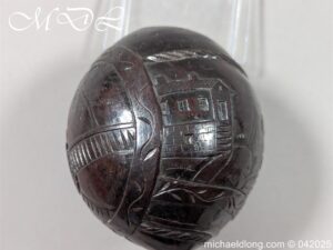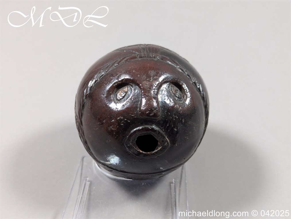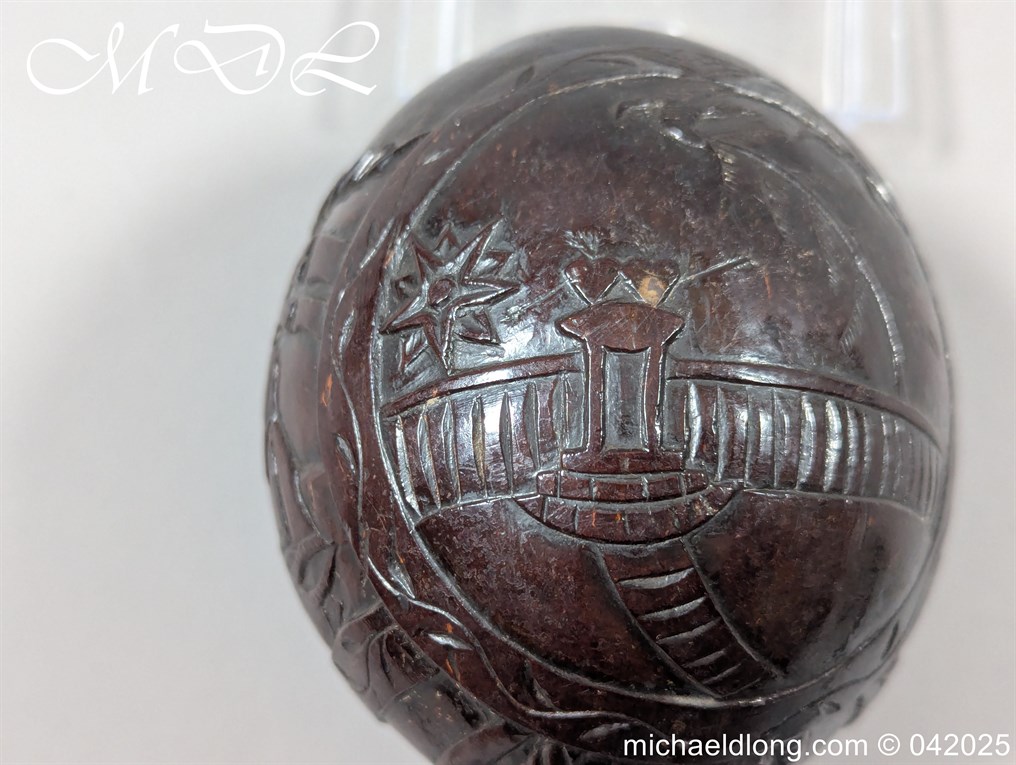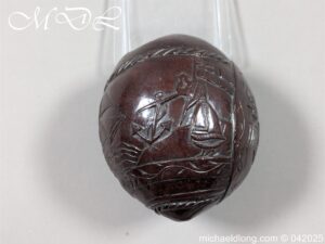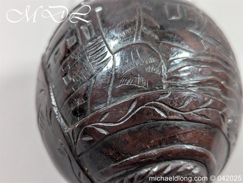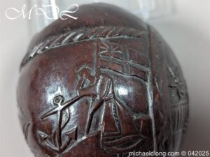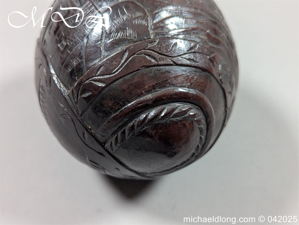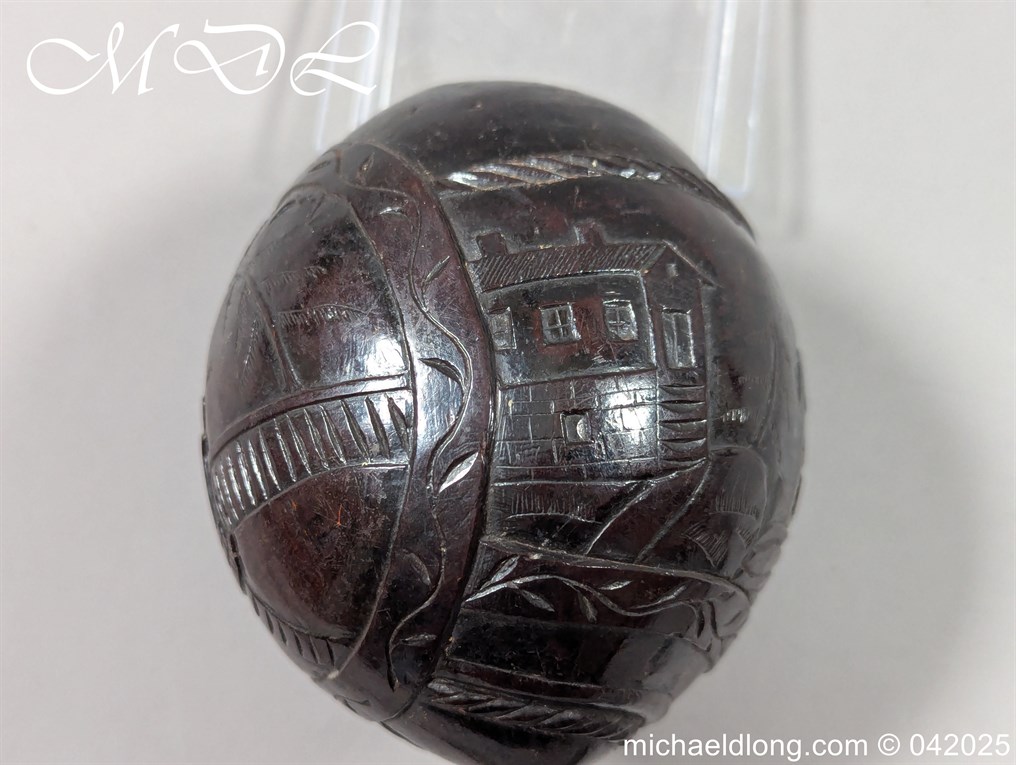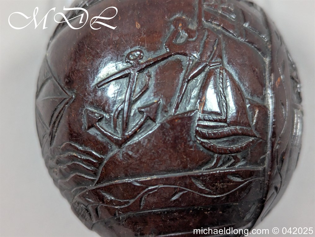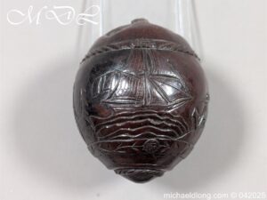 Naval 18th Century Bug Bear or Powder Flask carved in relief with sailing ship, anchor, naval Britannia flag being held by female figure, buildings and romantic scene plus rope design. The powder flask bug bear dating to the late 18th century circa 1790. A coconut carved by sailors or soldiers who visited the East or West Indies in the late 18th to the early 19th centuries. The bug bears were carved from green coconut shells which were easier to carve than dried. In super condition no cracks and good age patina.
