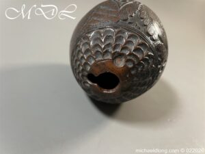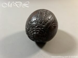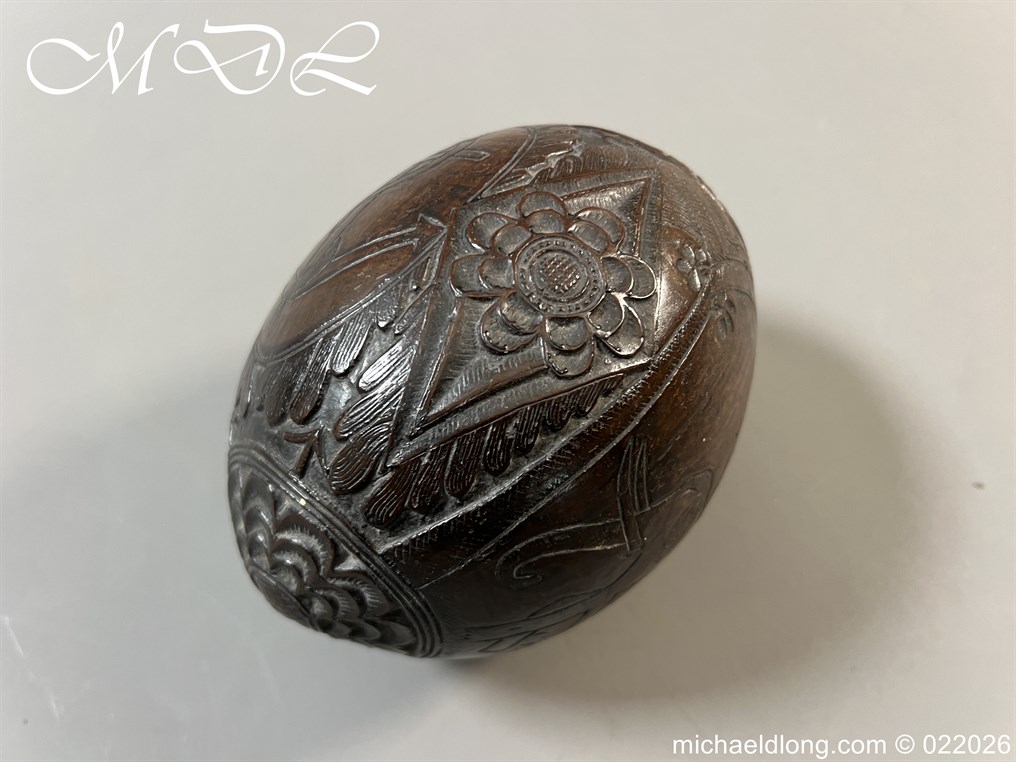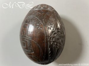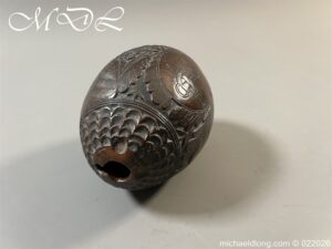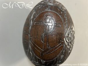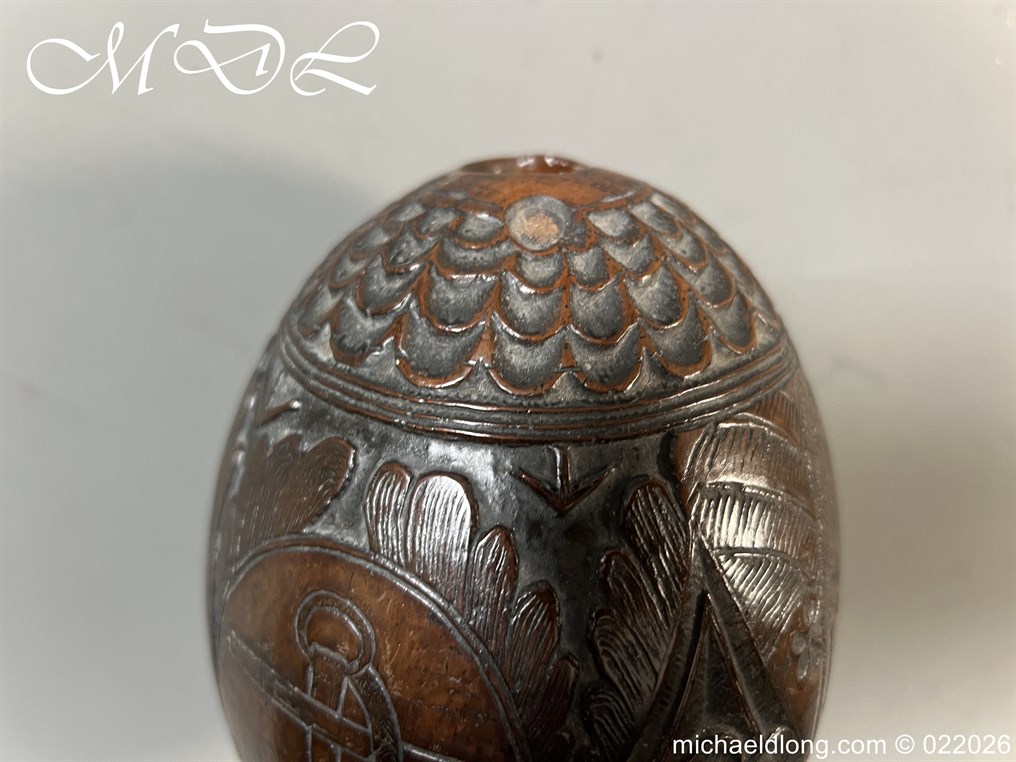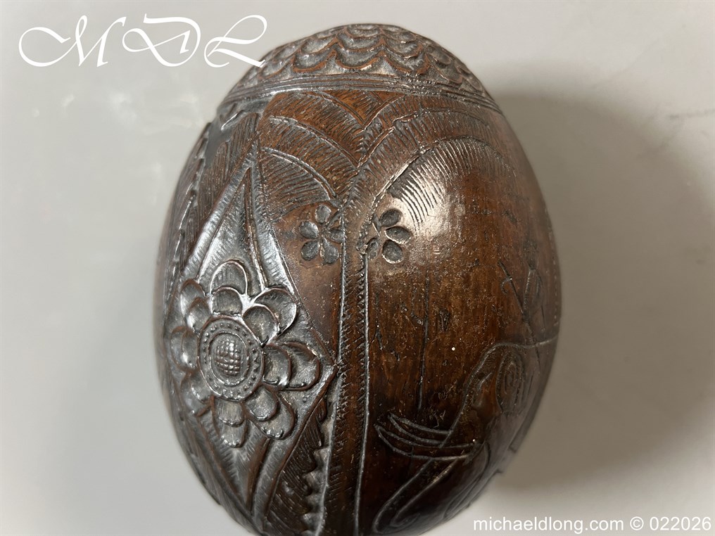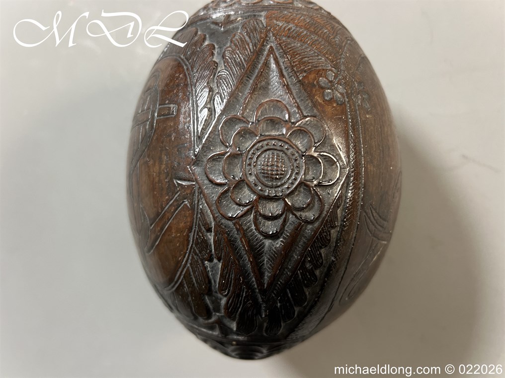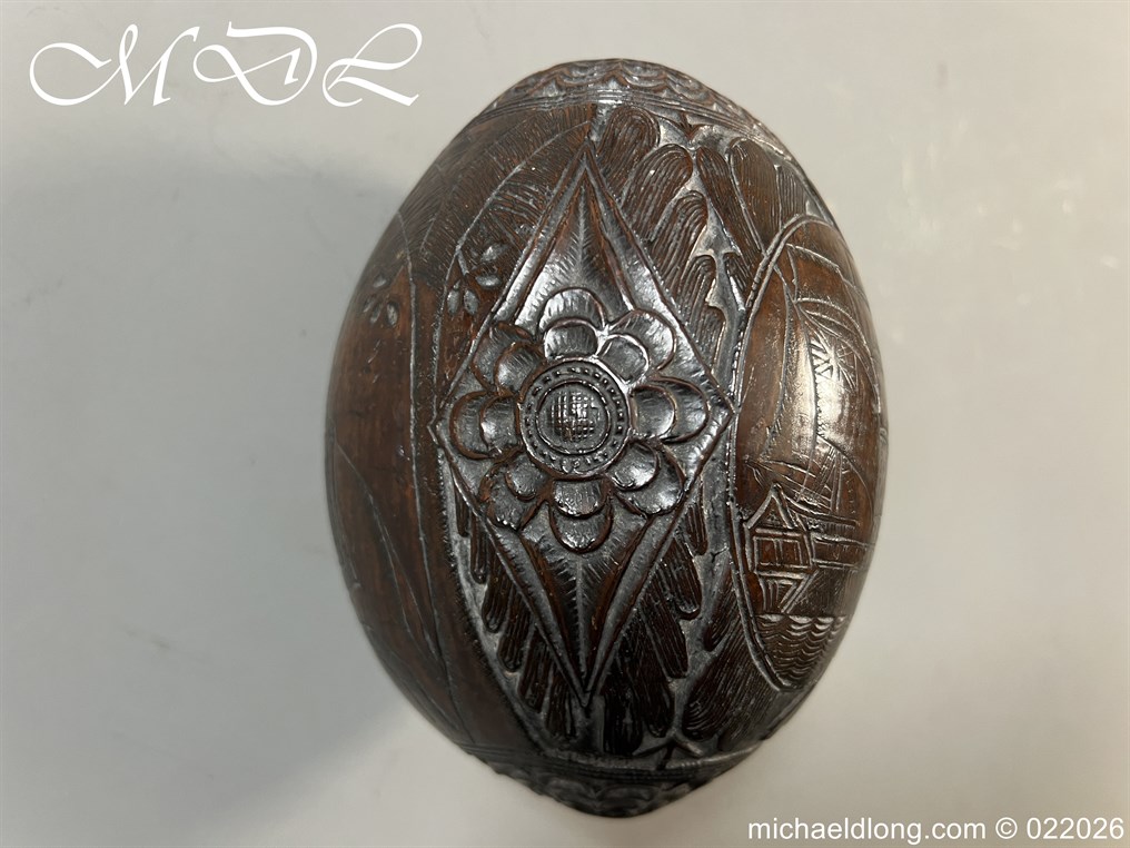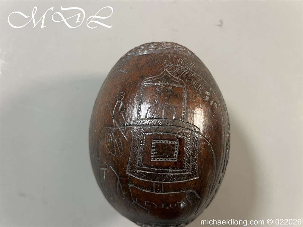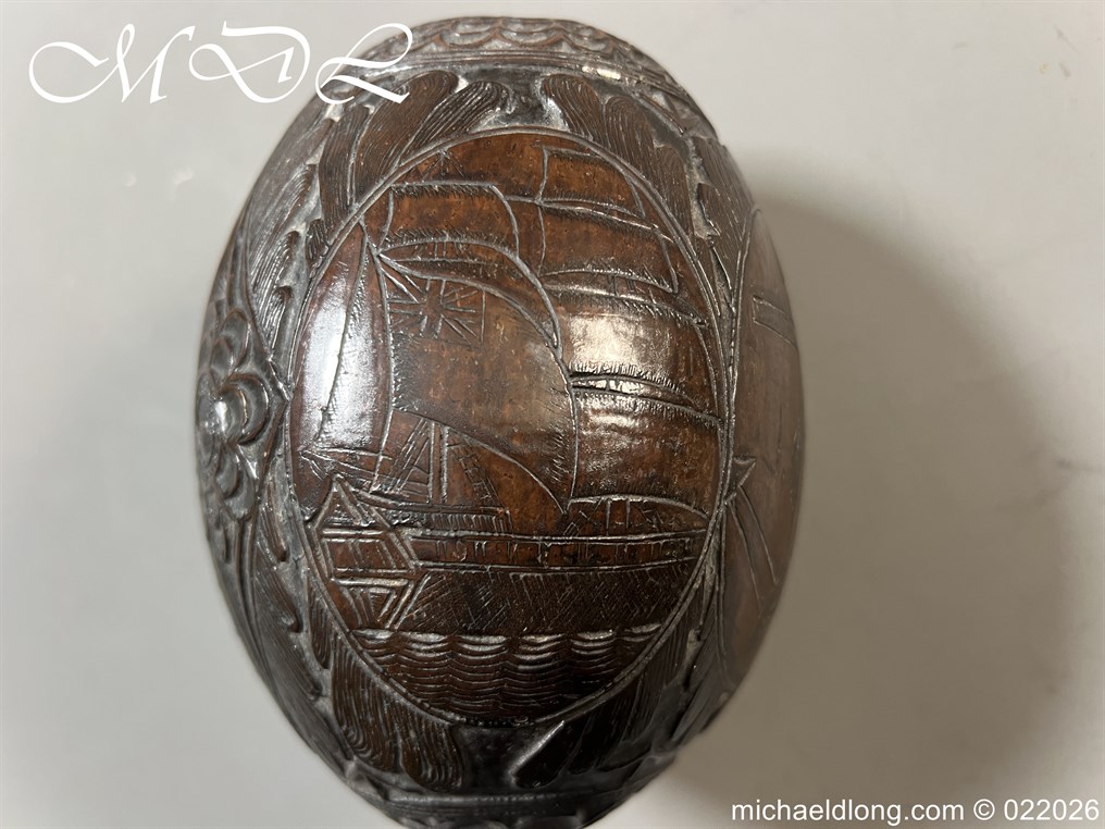 Naval 19th Century Bug Bear or Powder Flask carved in relief with sailing ship, fouled anchor, elephant palm trees and floral designs. The powder flask bug bear dating early 19th century, a coconut carved by sailors or soldiers who visited the British Colonials this example marked Ceylon. The bug bears were carved from green coconut shells which were easier to carve than dried. In nice condition no cracks and good age patina.