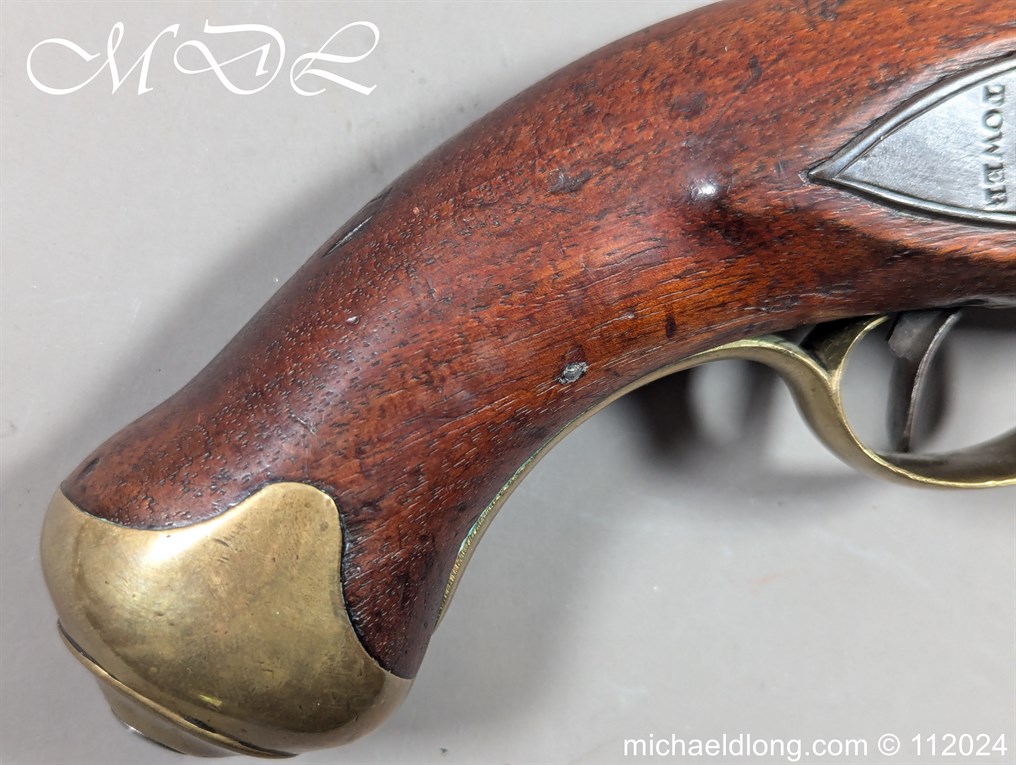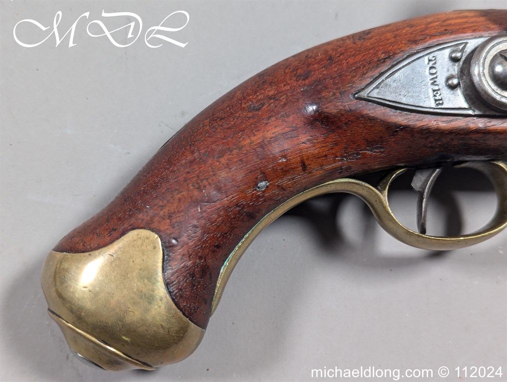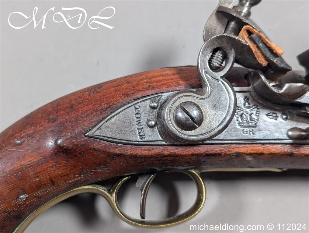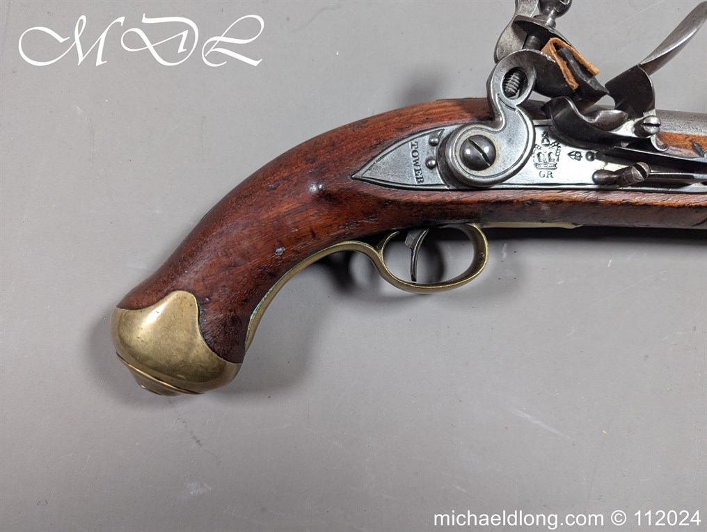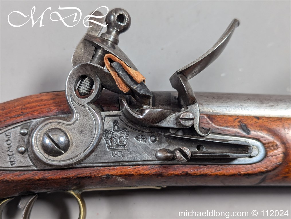 New Land Pattern Flintlock regulation pistol with round barrel stamped with Tower proof and viewing marks, lock stamped with GR beneath a crown and TOWER across the tail, walnut full-stock stamped with inspection marks and store keepers marks, plain brass mounts including side plate, butt cap, trigger guard plus original stirrup ramrod. Please Note UK shipping free the rest of the world at cost.