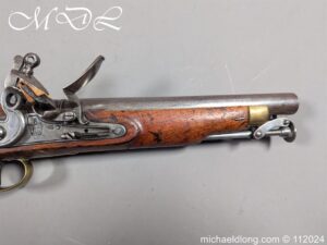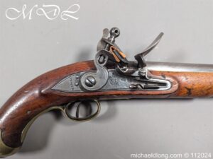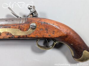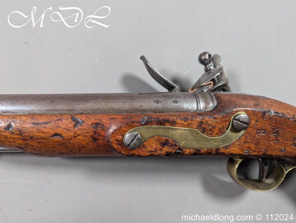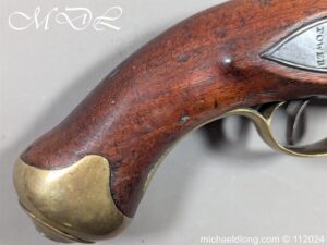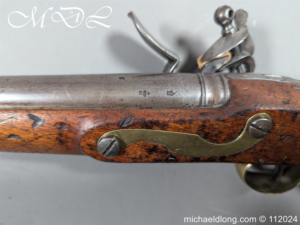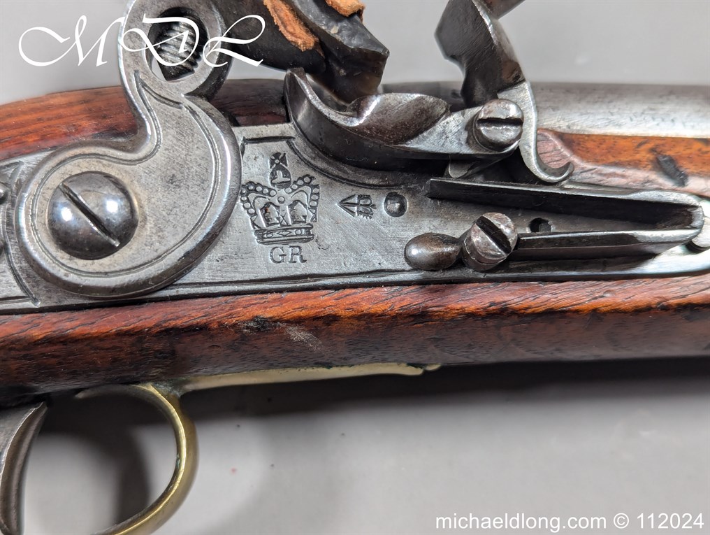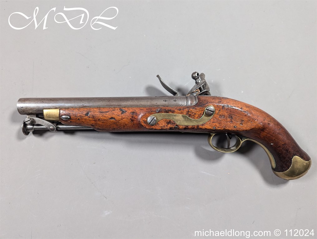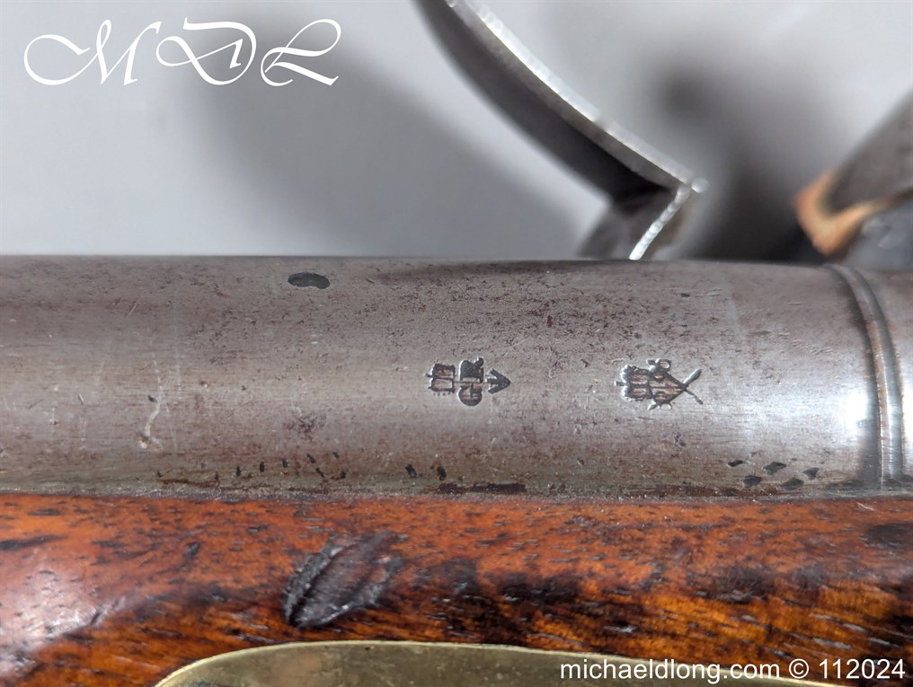 New Land Pattern Flintlock regulation pistol with round barrel stamped with Tower proof and viewing marks, lock stamped with GR beneath a crown and TOWER across the tail, walnut full-stock stamped with inspection marks and store keepers marks, plain brass mounts including side plate, butt cap, trigger guard plus original stirrup ramrod. Please Note UK shipping free the rest of the world at cost.
