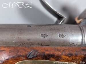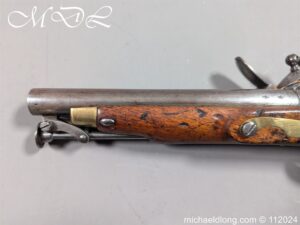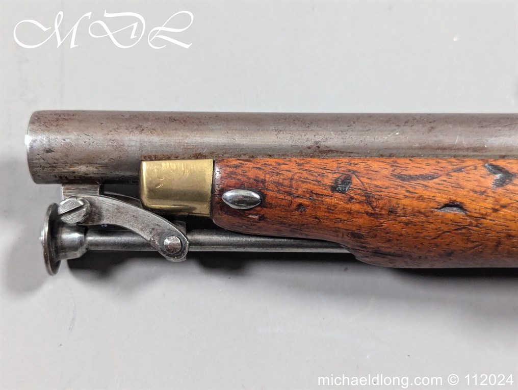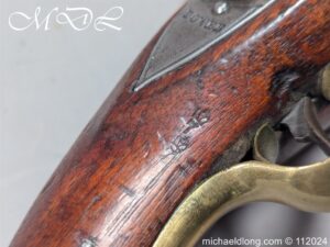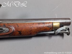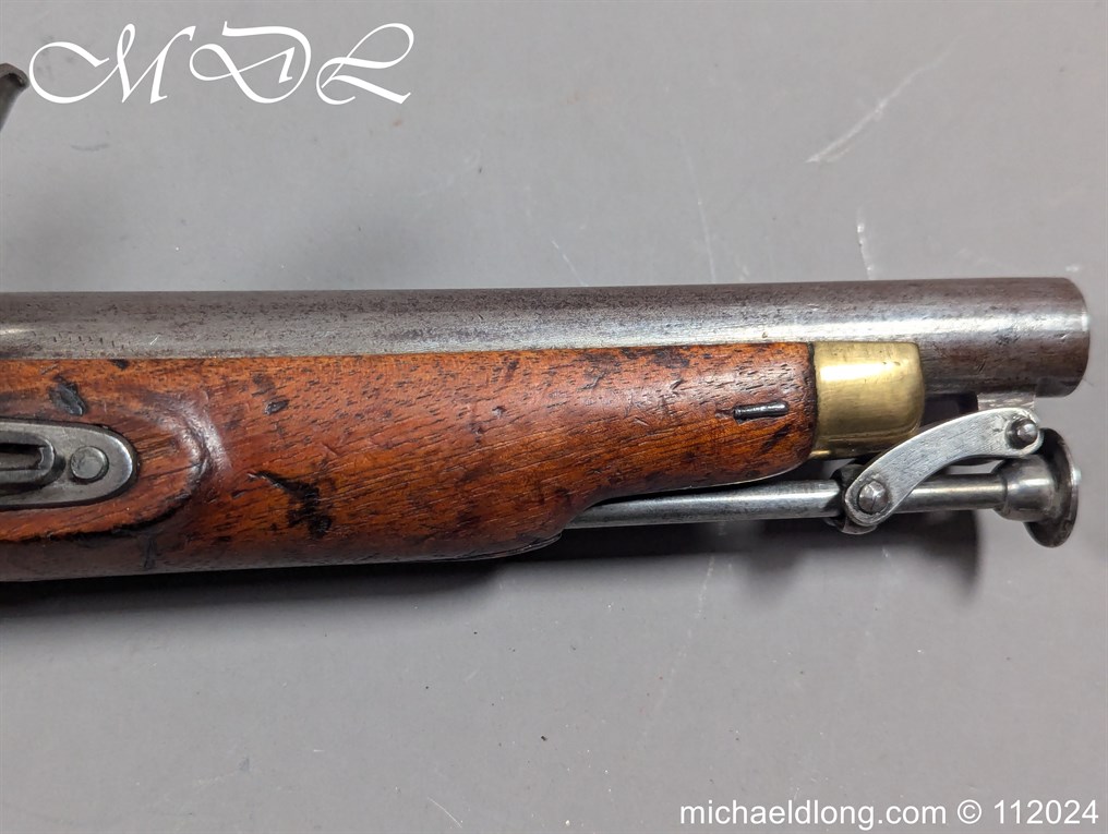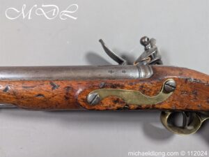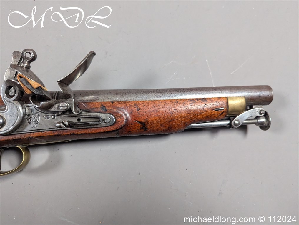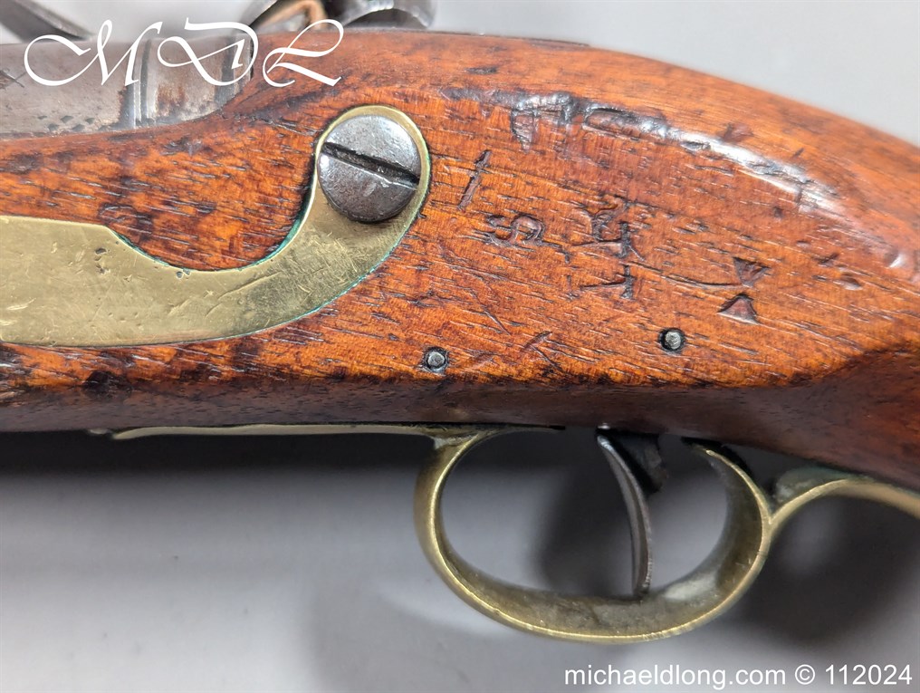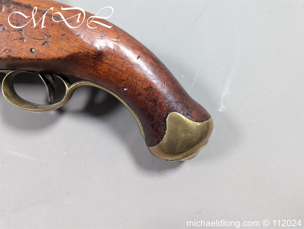 New Land Pattern Flintlock regulation pistol with round barrel stamped with Tower proof and viewing marks, lock stamped with GR beneath a crown and TOWER across the tail, walnut full-stock stamped with inspection marks and store keepers marks, plain brass mounts including side plate, butt cap, trigger guard plus original stirrup ramrod. Please Note UK shipping free the rest of the world at cost.