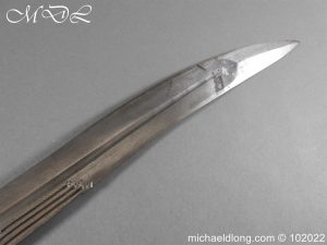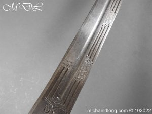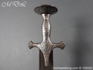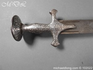 The hilt with matching silver design to the blade with disk pommel and tang button, overall length 32inch the blade 27 inch