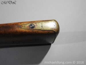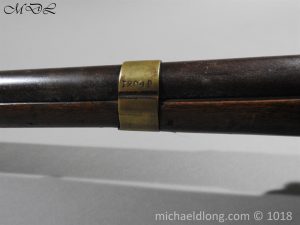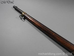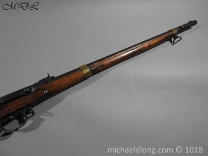 while the rest of the rifle is marked throughout with the serial number 12048 including the brass butt plate, trigger guard, and the two spring retained barrel bands. The browned six groove rifled barrel has a block and blade foresight and a flip up rear sight marked up to 800 metres, with a sling swivel under the fore barrel band and another in front of the main hammer spring. There is a bayonet lug to take a Yataghan sword bayonet.